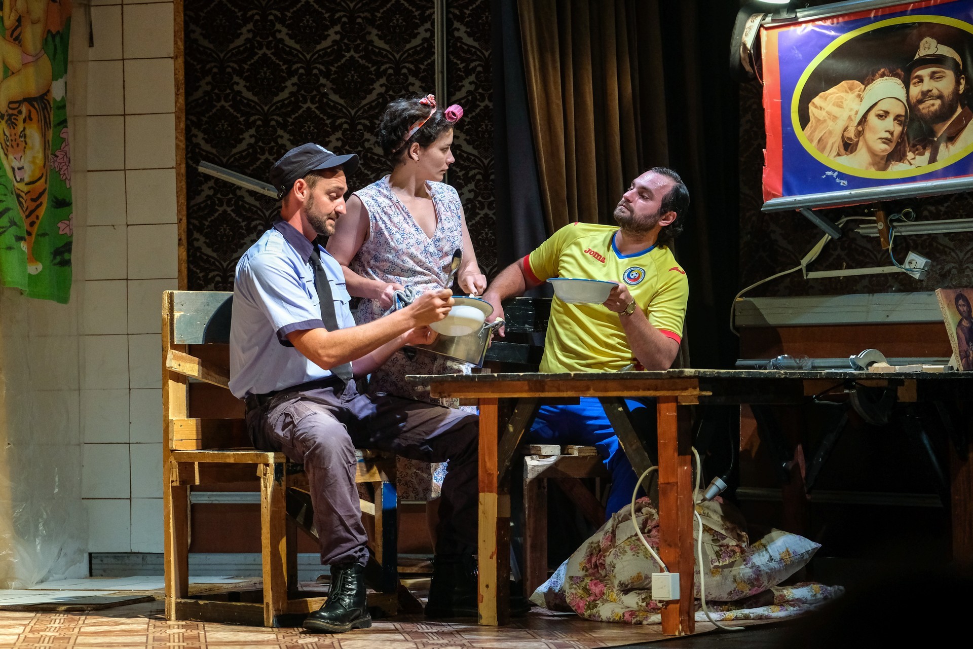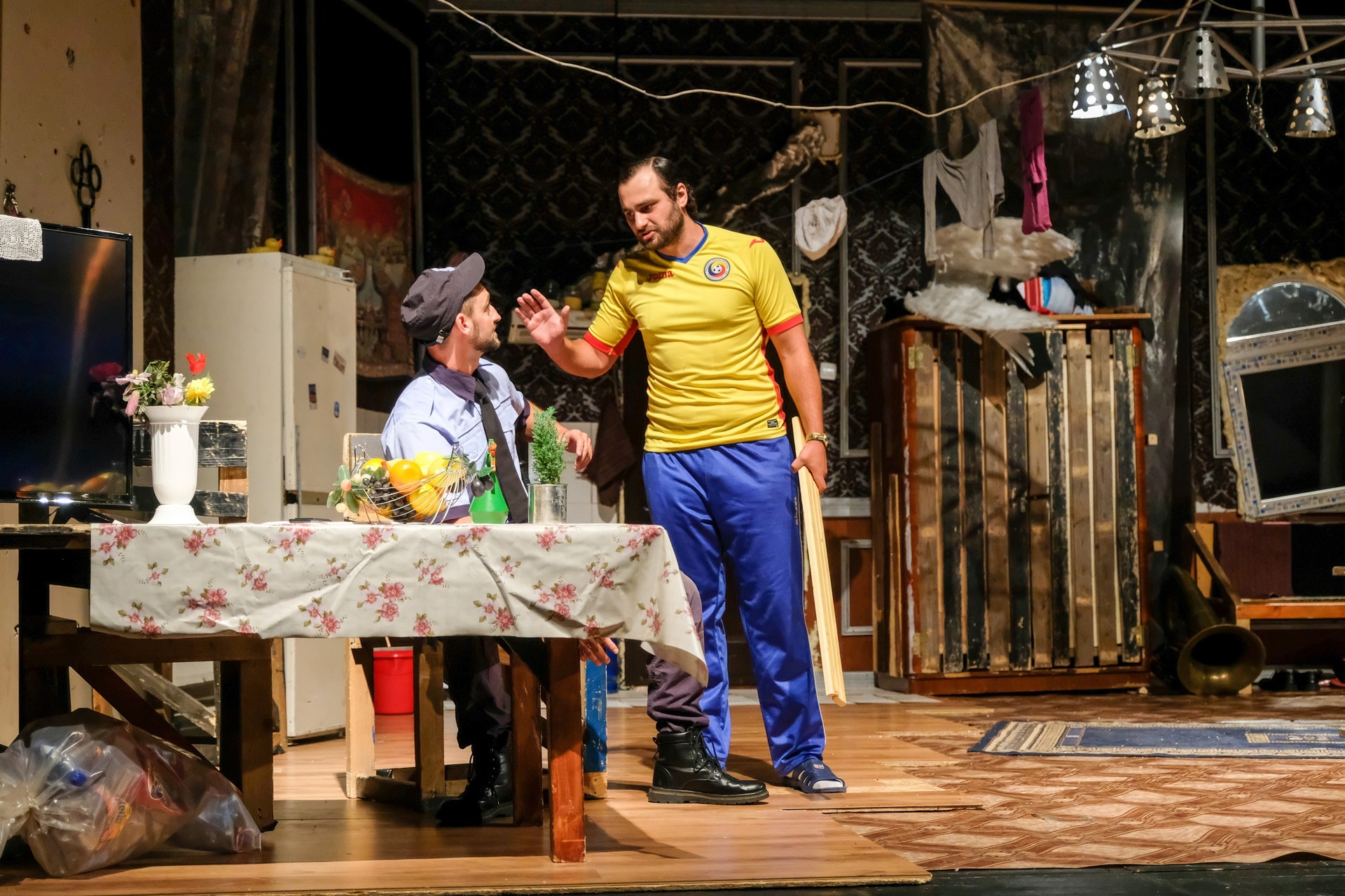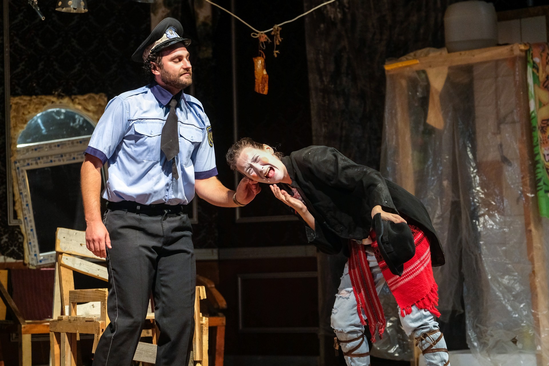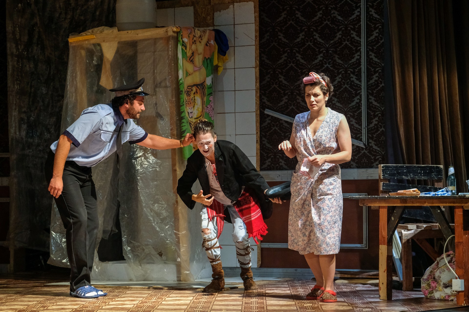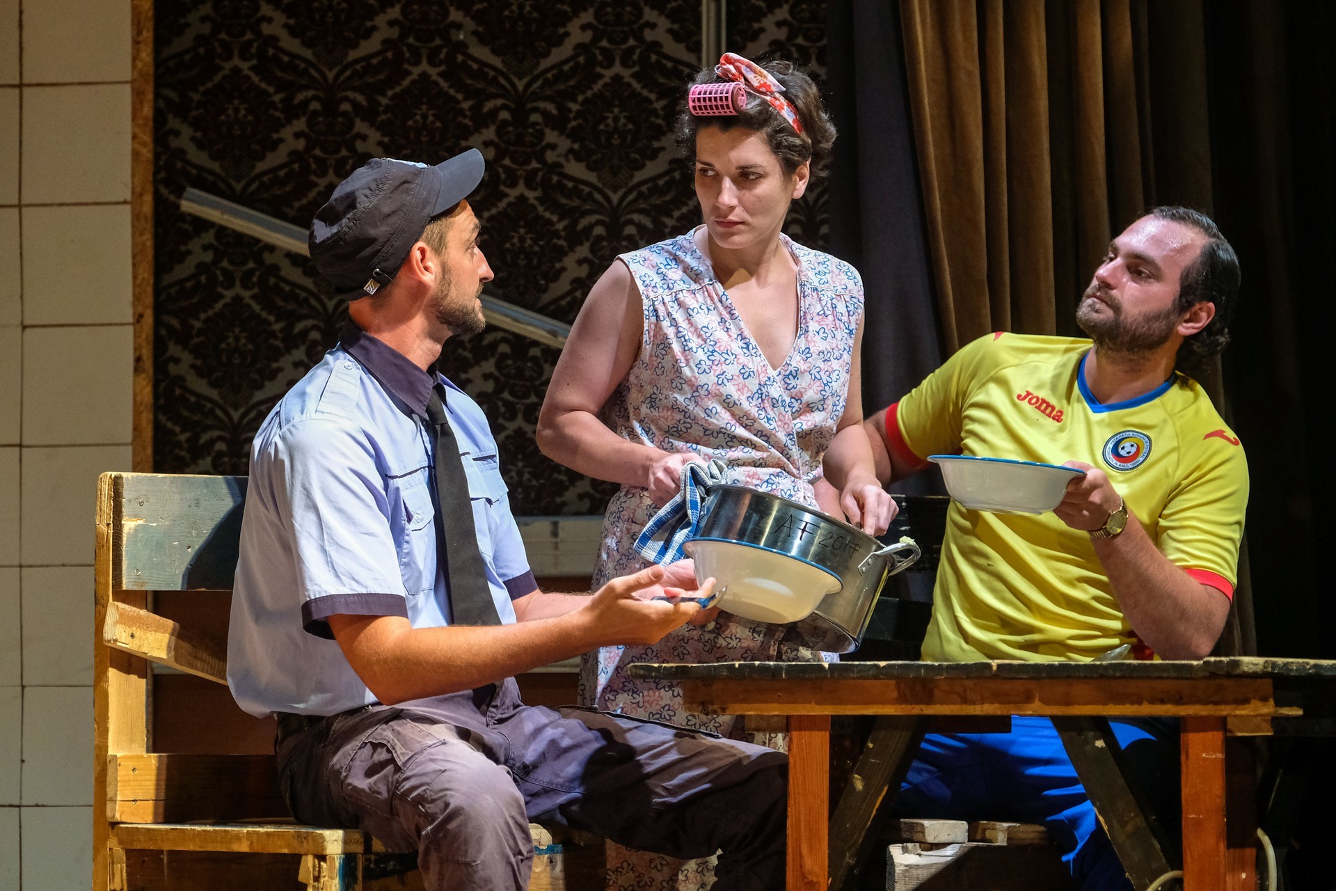 Ezt a vidámságba rejtett kemény bírálatot alkalmazta a mai román viszonyokra a gyergyói társulat. Ezért indítja a felvonásokat a volt román himnusszal, ezért szaladgáltatja a felszarvazott férjt nemzeti színű suhogóban és papucsban, és ezért viszi bele filmszerűen a történetbe az aktuális román politikai diskurzust, amely a hatalmas szegénység és zűrzavar közepette másra sincsen kihegyezve, mint az erdélyi autonómiaellenességre. Ebbe a képbe jön bele a szennyházba járó „tróger” és a többi surmóság, amelyek bármennyire is komikusak, a valóságot mutatják: a kolbász a csilláron lóg, a vasalót sütésre használják, a ruhásszekrényt egy szexbomba posztere béleli, az asztalon, ahol főznek, alszanak is, a zuhanyzót bubis fólia választja el a lakótértől, ráadásul nemcsak, hogy mosdanak benne, hanem bele is pisilnek, a lapos tévé inkább csak dísz, a kaja is, az épületbe ferdén belevert műanyag ablakon át pedig félig-meddig látod csak a világot. Ha egyáltalán látni akarod. A teljes kompozíciót egy ikon koronázza, ami csodákat tesz, mert a Balkánhoz ez is hozzátartozik.