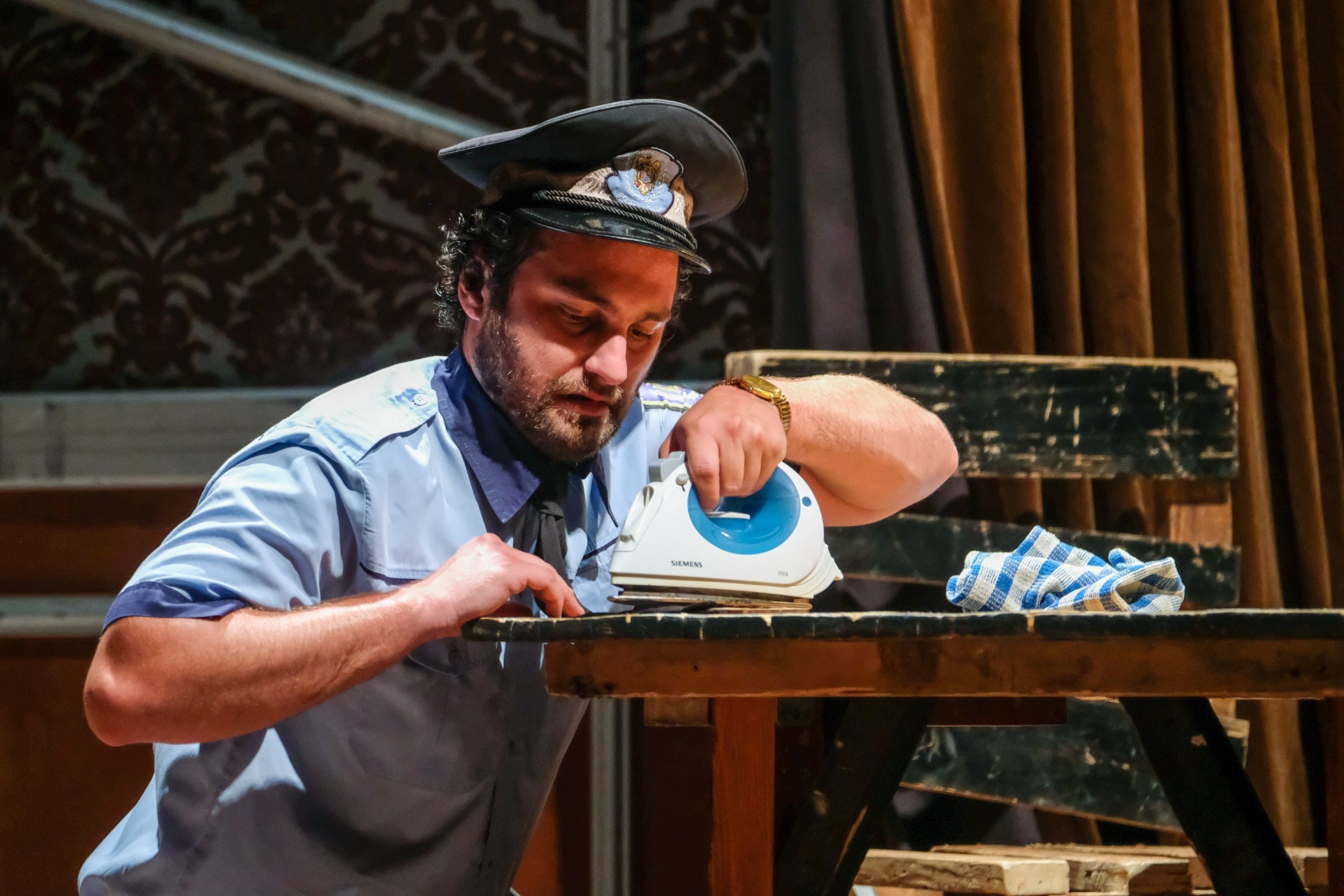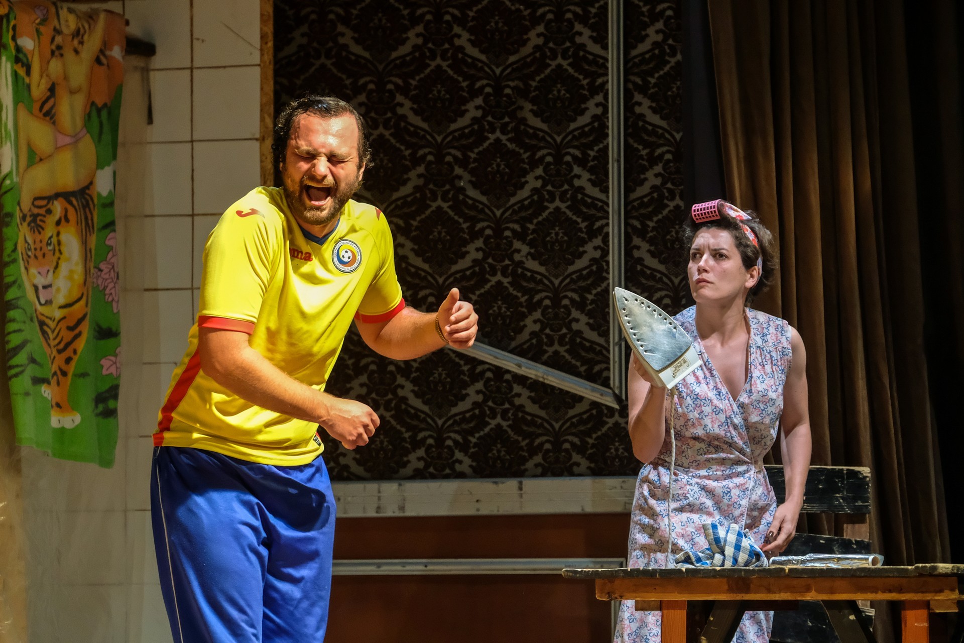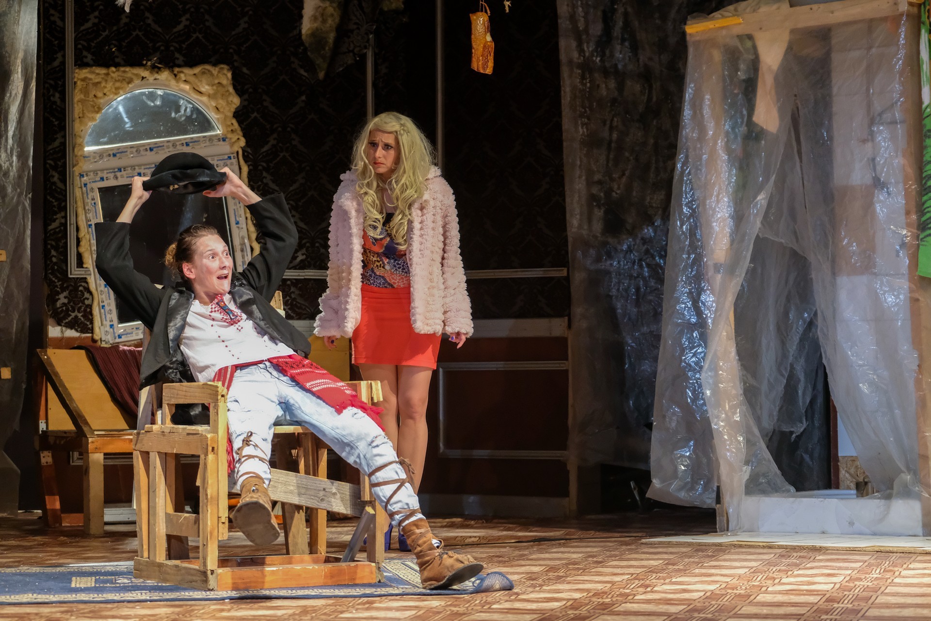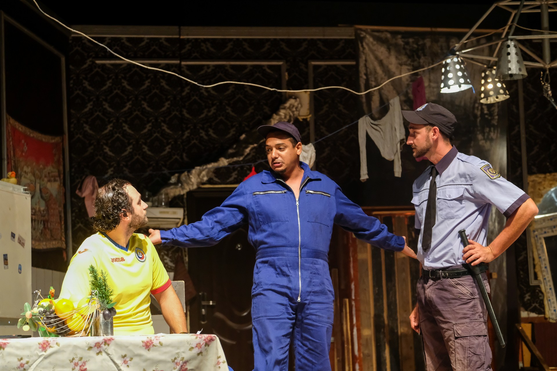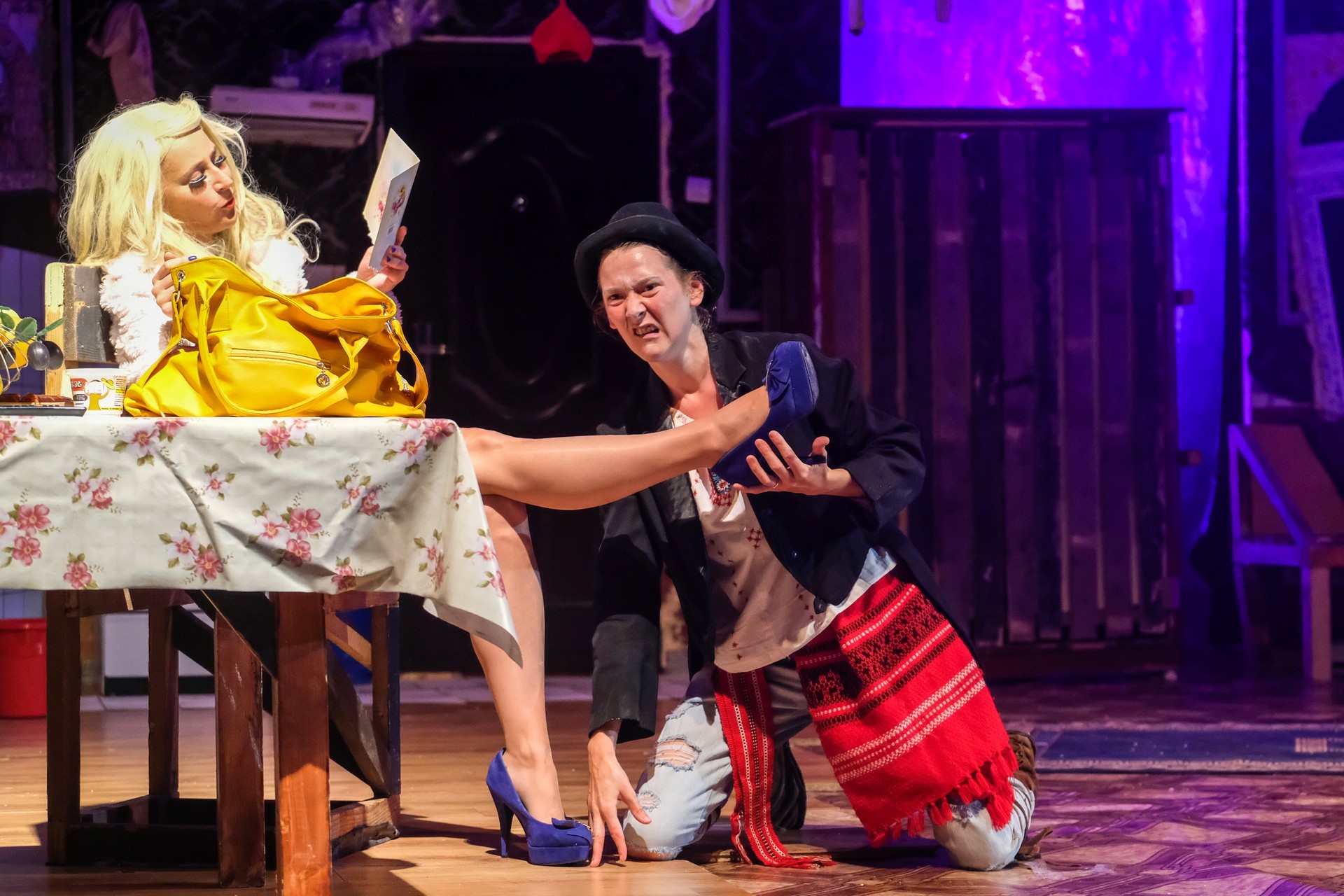 Ezt a vidámságba rejtett kemény bírálatot alkalmazta a mai román viszonyokra a gyergyói társulat. Ezért indítja a felvonásokat a volt román himnusszal, ezért szaladgáltatja a felszarvazott férjt nemzeti színű suhogóban és papucsban, és ezért viszi bele filmszerűen a történetbe az aktuális román politikai diskurzust, amely a hatalmas szegénység és zűrzavar közepette másra sincsen kihegyezve, mint az erdélyi autonómiaellenességre. Ebbe a képbe jön bele a szennyházba járó „tróger” és a többi surmóság, amelyek bármennyire is komikusak, a valóságot mutatják: a kolbász a csilláron lóg, a vasalót sütésre használják, a ruhásszekrényt egy szexbomba posztere béleli, az asztalon, ahol főznek, alszanak is, a zuhanyzót bubis fólia választja el a lakótértől, ráadásul nemcsak, hogy mosdanak benne, hanem bele is pisilnek, a lapos tévé inkább csak dísz, a kaja is, az épületbe ferdén belevert műanyag ablakon át pedig félig-meddig látod csak a világot. Ha egyáltalán látni akarod. A teljes kompozíciót egy ikon koronázza, ami csodákat tesz, mert a Balkánhoz ez is hozzátartozik.