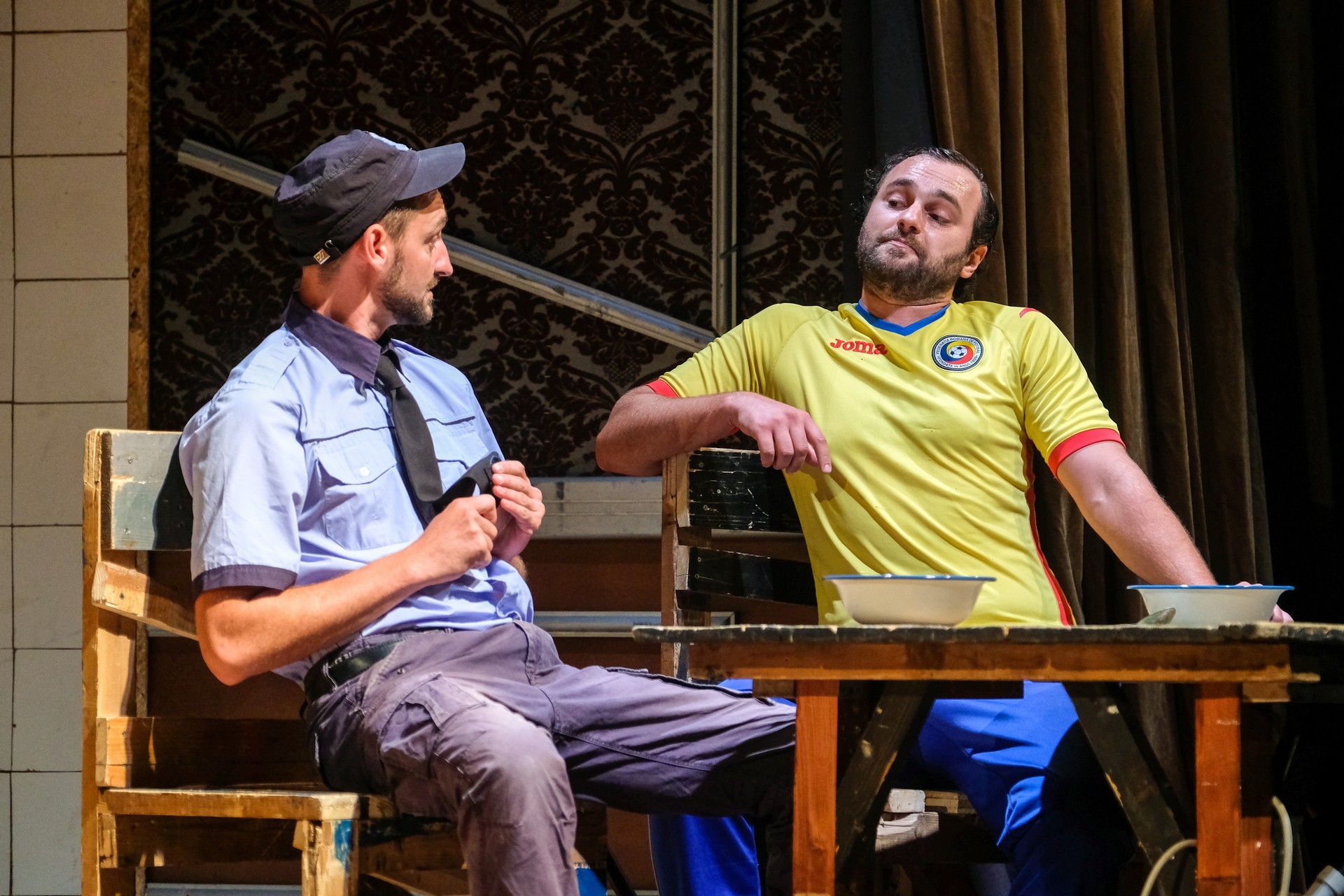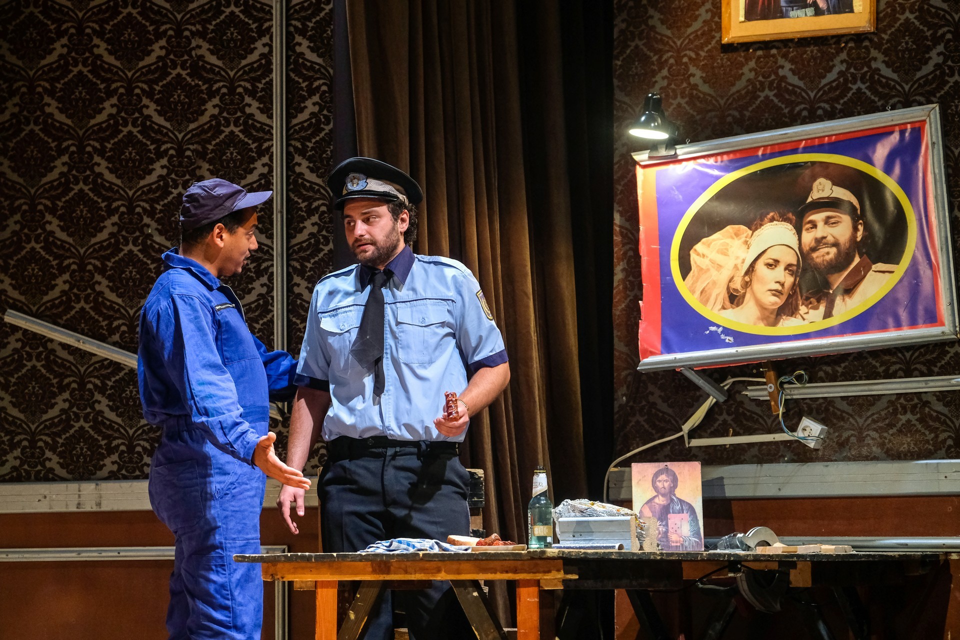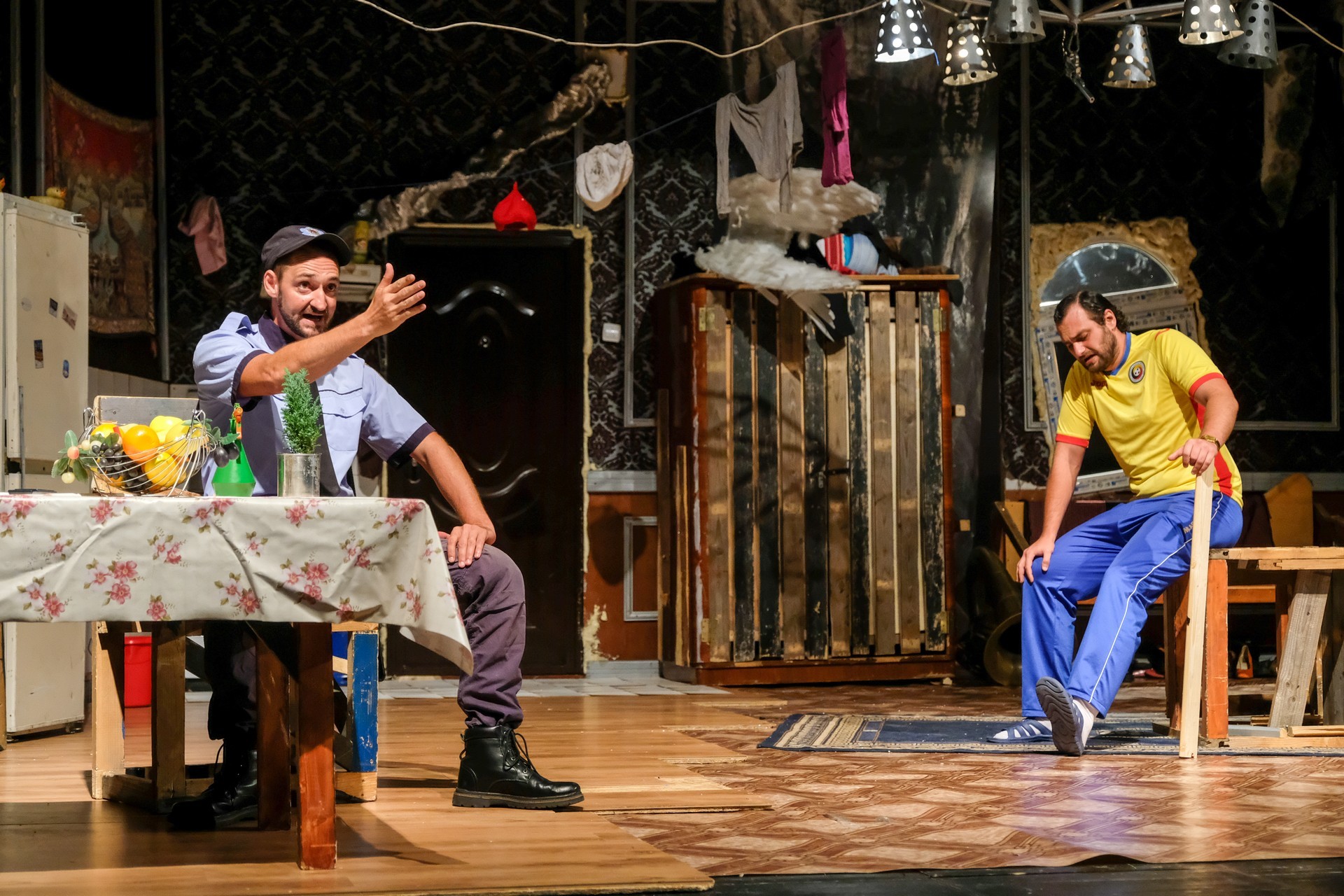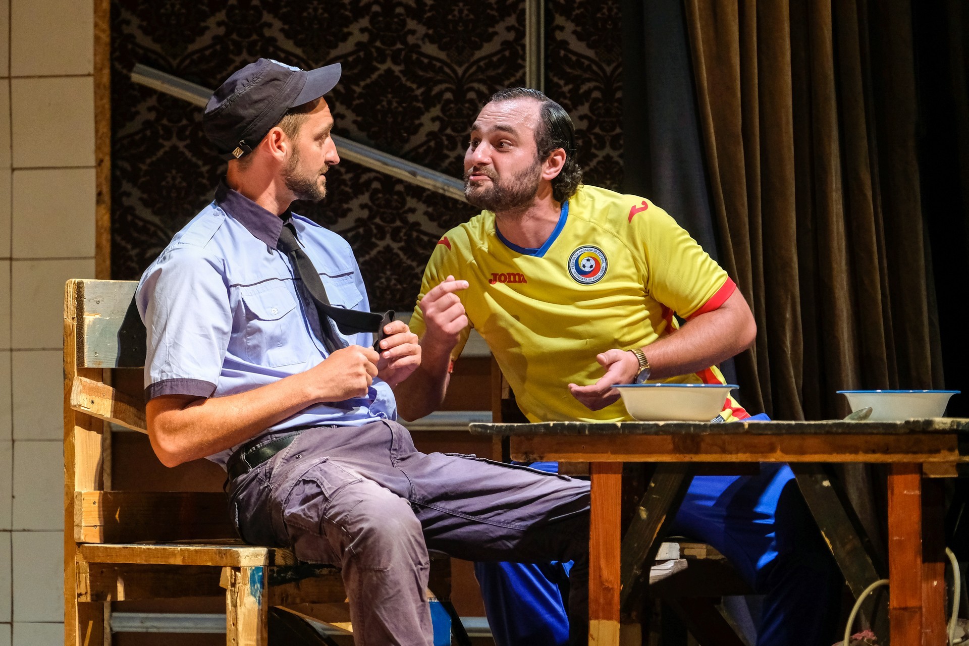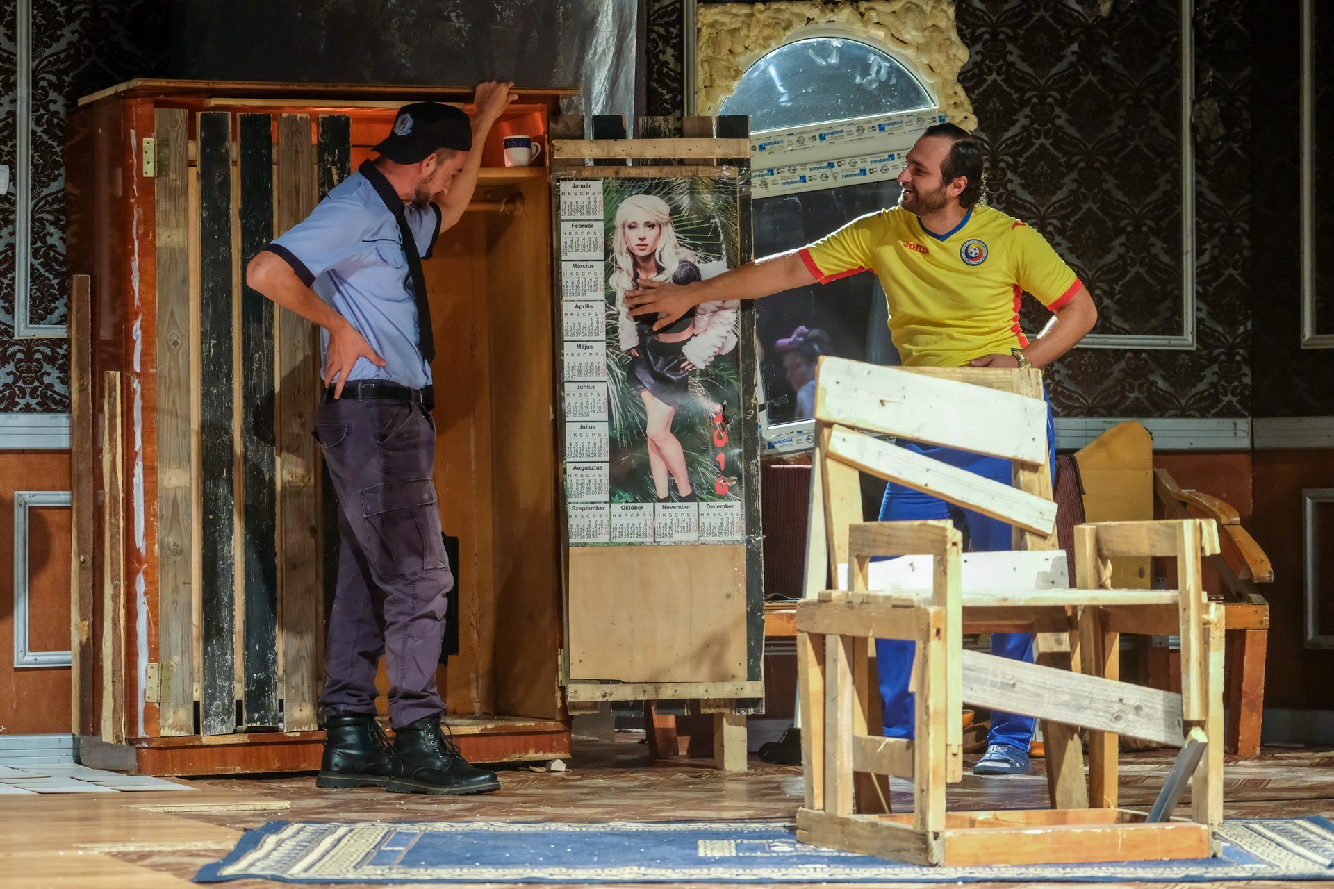Ezt a vidámságba rejtett kemény bírálatot alkalmazta a mai román viszonyokra a gyergyói társulat. Ezért indítja a felvonásokat a volt román himnusszal, ezért szaladgáltatja a felszarvazott férjt nemzeti színű suhogóban és papucsban, és ezért viszi bele filmszerűen a történetbe az aktuális román politikai diskurzust, amely a hatalmas szegénység és zűrzavar közepette másra sincsen kihegyezve, mint az erdélyi autonómiaellenességre. Ebbe a képbe jön bele a szennyházba járó „tróger” és a többi surmóság, amelyek bármennyire is komikusak, a valóságot mutatják: a kolbász a csilláron lóg, a vasalót sütésre használják, a ruhásszekrényt egy szexbomba posztere béleli, az asztalon, ahol főznek, alszanak is, a zuhanyzót bubis fólia választja el a lakótértől, ráadásul nemcsak, hogy mosdanak benne, hanem bele is pisilnek, a lapos tévé inkább csak dísz, a kaja is, az épületbe ferdén belevert műanyag ablakon át pedig félig-meddig látod csak a világot. Ha egyáltalán látni akarod. A teljes kompozíciót egy ikon koronázza, ami csodákat tesz, mert a Balkánhoz ez is hozzátartozik.
