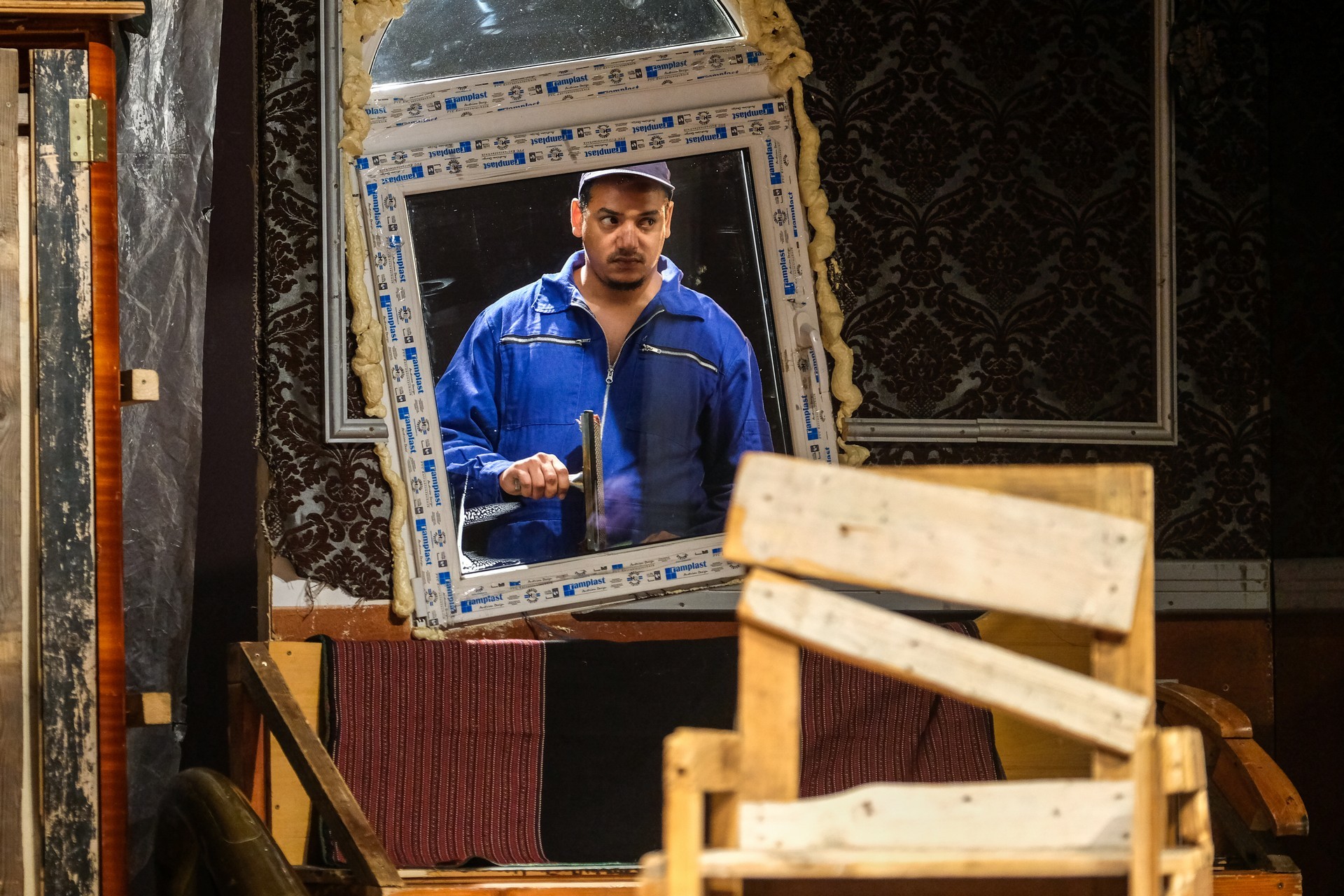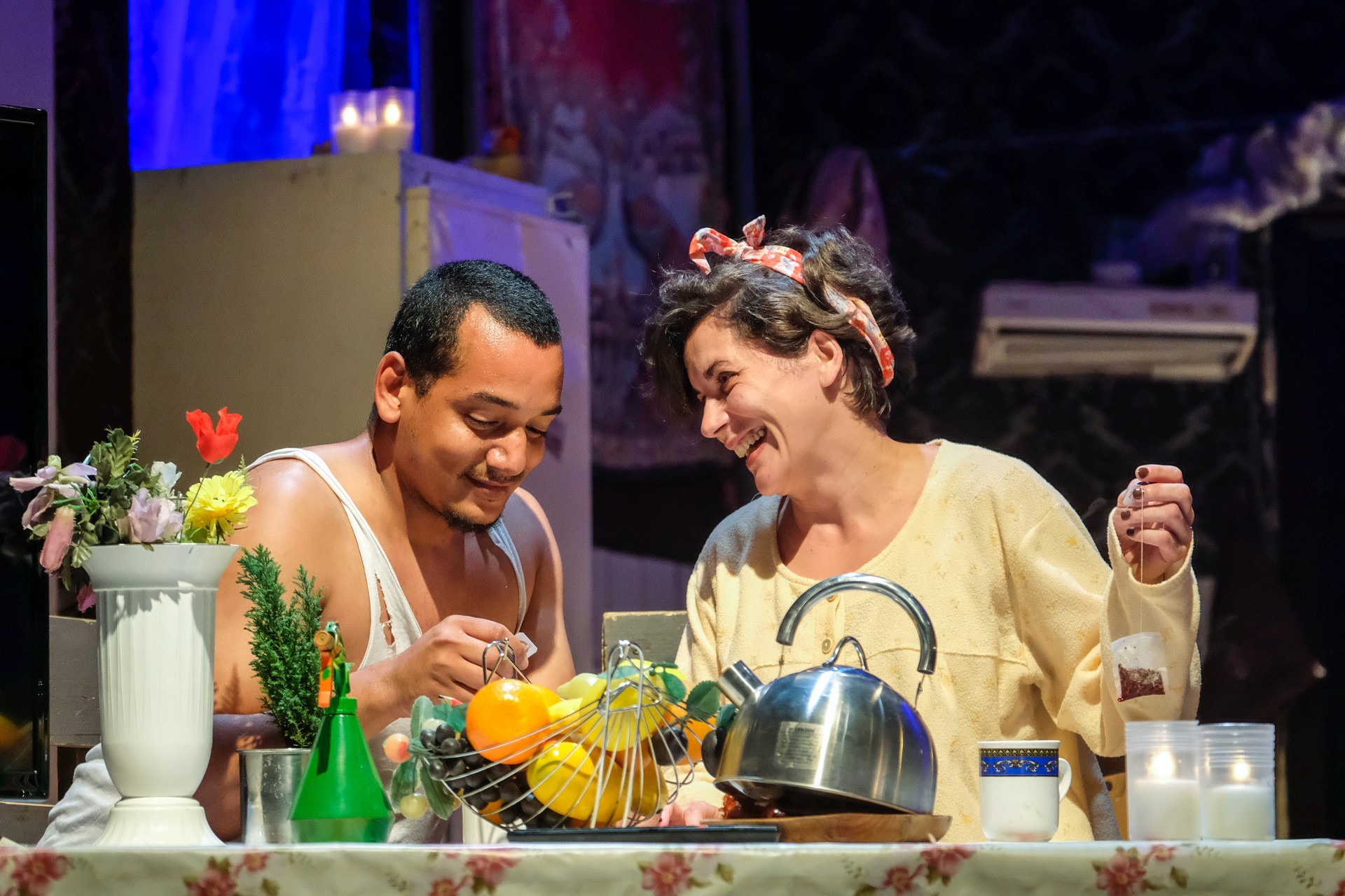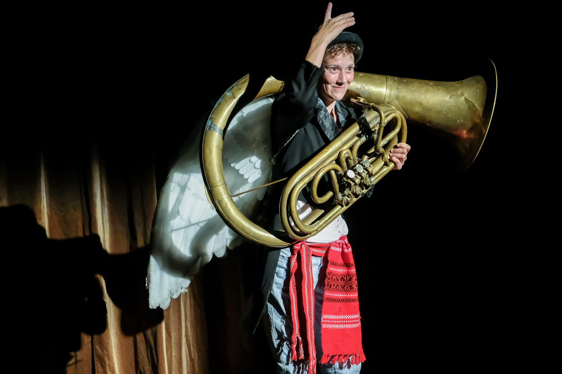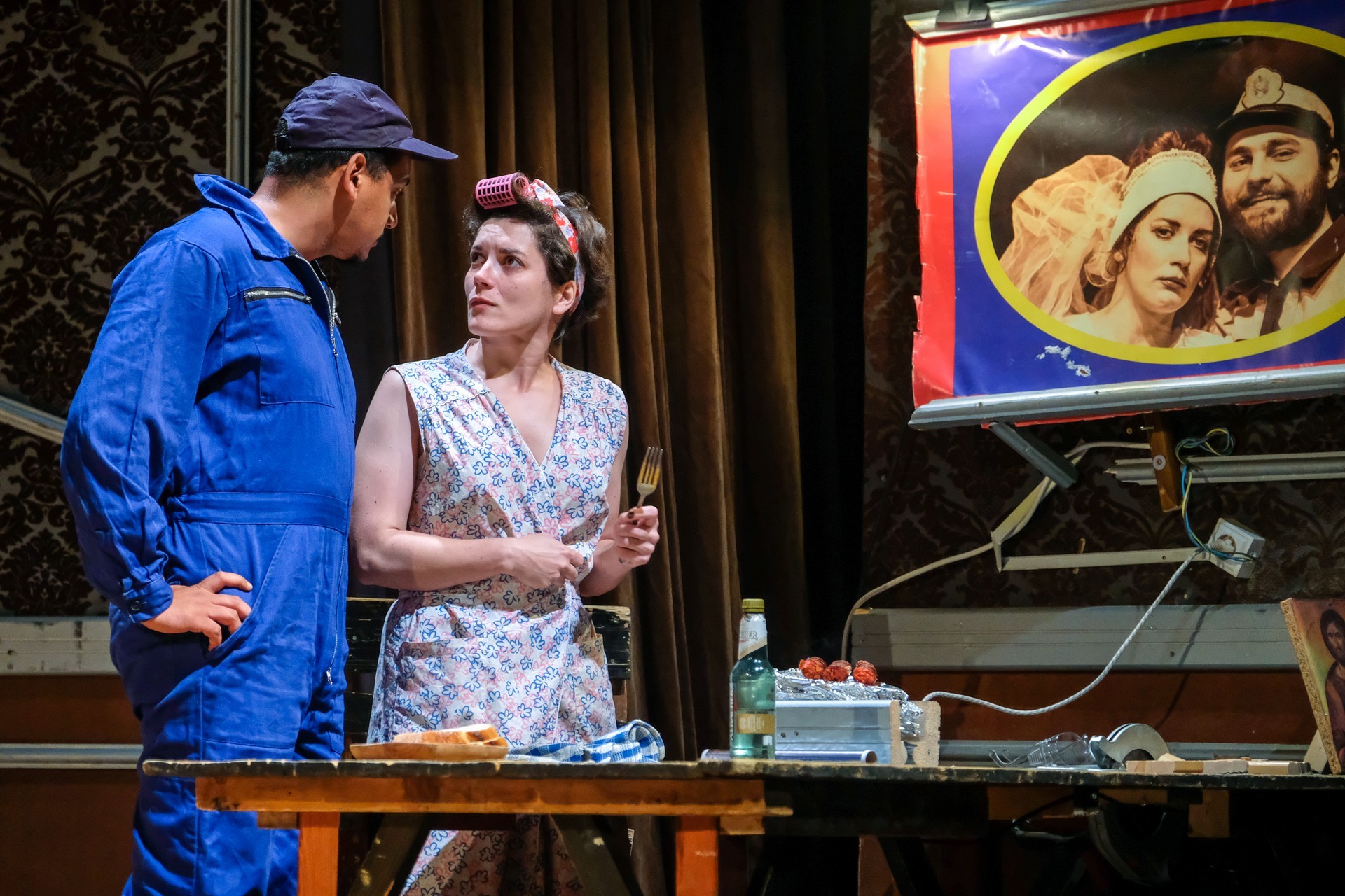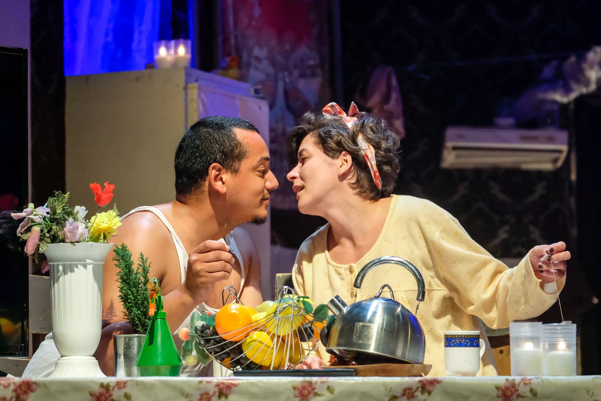 Ezt a vidámságba rejtett kemény bírálatot alkalmazta a mai román viszonyokra a gyergyói társulat. Ezért indítja a felvonásokat a volt román himnusszal, ezért szaladgáltatja a felszarvazott férjt nemzeti színű suhogóban és papucsban, és ezért viszi bele filmszerűen a történetbe az aktuális román politikai diskurzust, amely a hatalmas szegénység és zűrzavar közepette másra sincsen kihegyezve, mint az erdélyi autonómiaellenességre. Ebbe a képbe jön bele a szennyházba járó „tróger” és a többi surmóság, amelyek bármennyire is komikusak, a valóságot mutatják: a kolbász a csilláron lóg, a vasalót sütésre használják, a ruhásszekrényt egy szexbomba posztere béleli, az asztalon, ahol főznek, alszanak is, a zuhanyzót bubis fólia választja el a lakótértől, ráadásul nemcsak, hogy mosdanak benne, hanem bele is pisilnek, a lapos tévé inkább csak dísz, a kaja is, az épületbe ferdén belevert műanyag ablakon át pedig félig-meddig látod csak a világot. Ha egyáltalán látni akarod. A teljes kompozíciót egy ikon koronázza, ami csodákat tesz, mert a Balkánhoz ez is hozzátartozik.