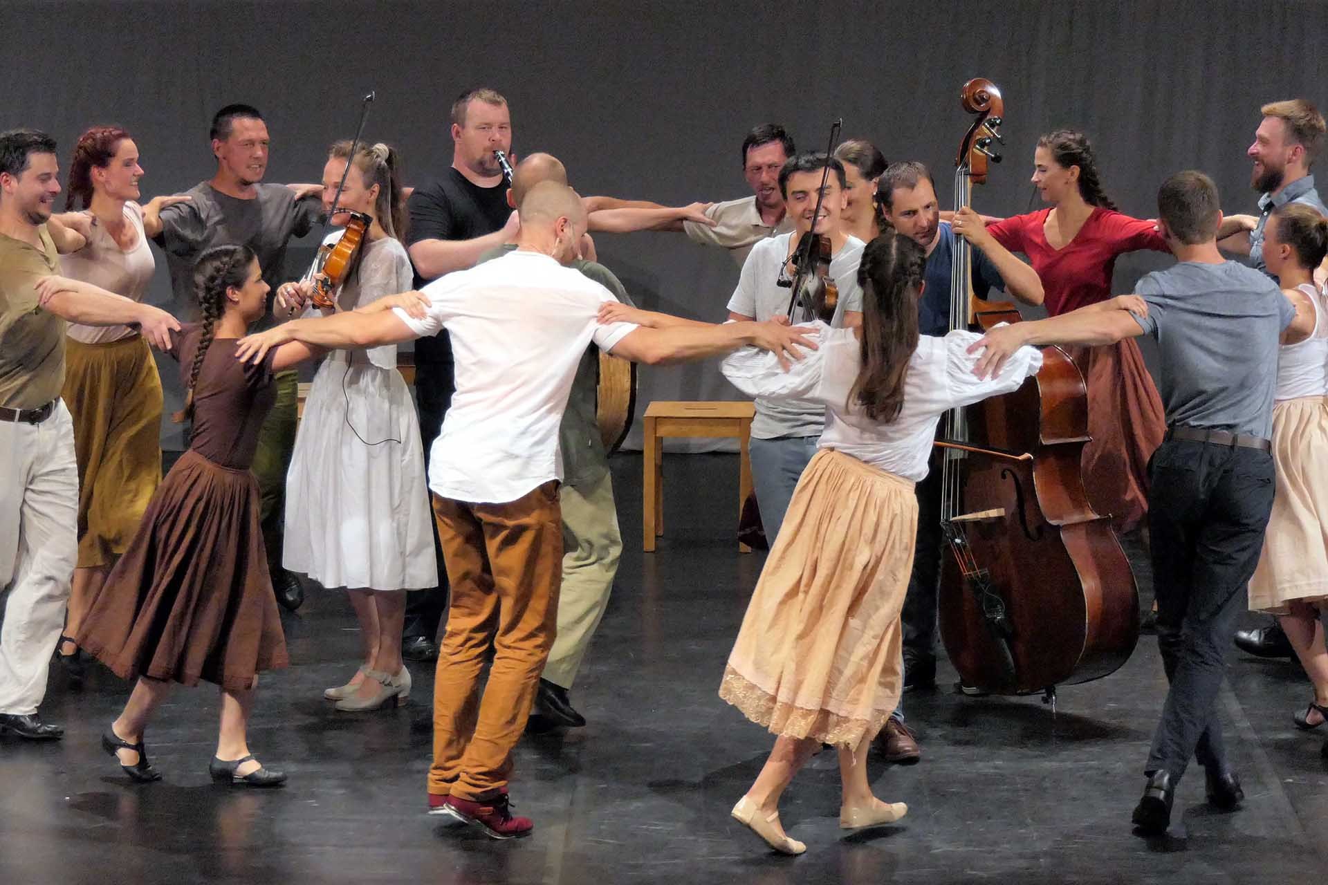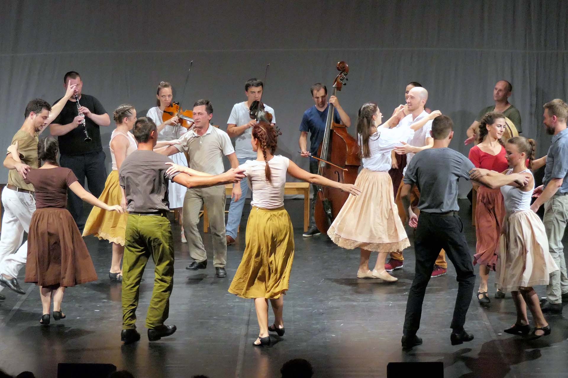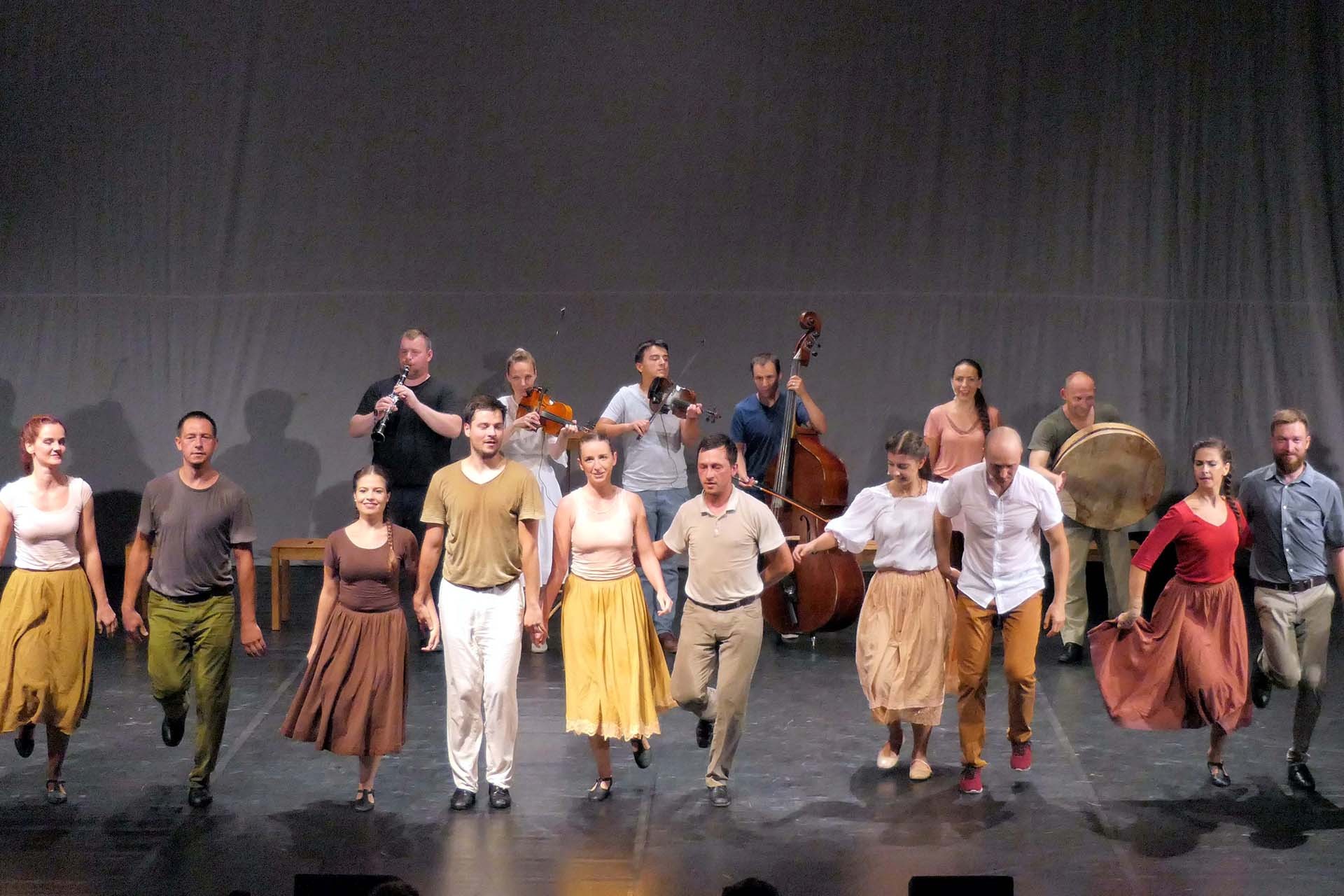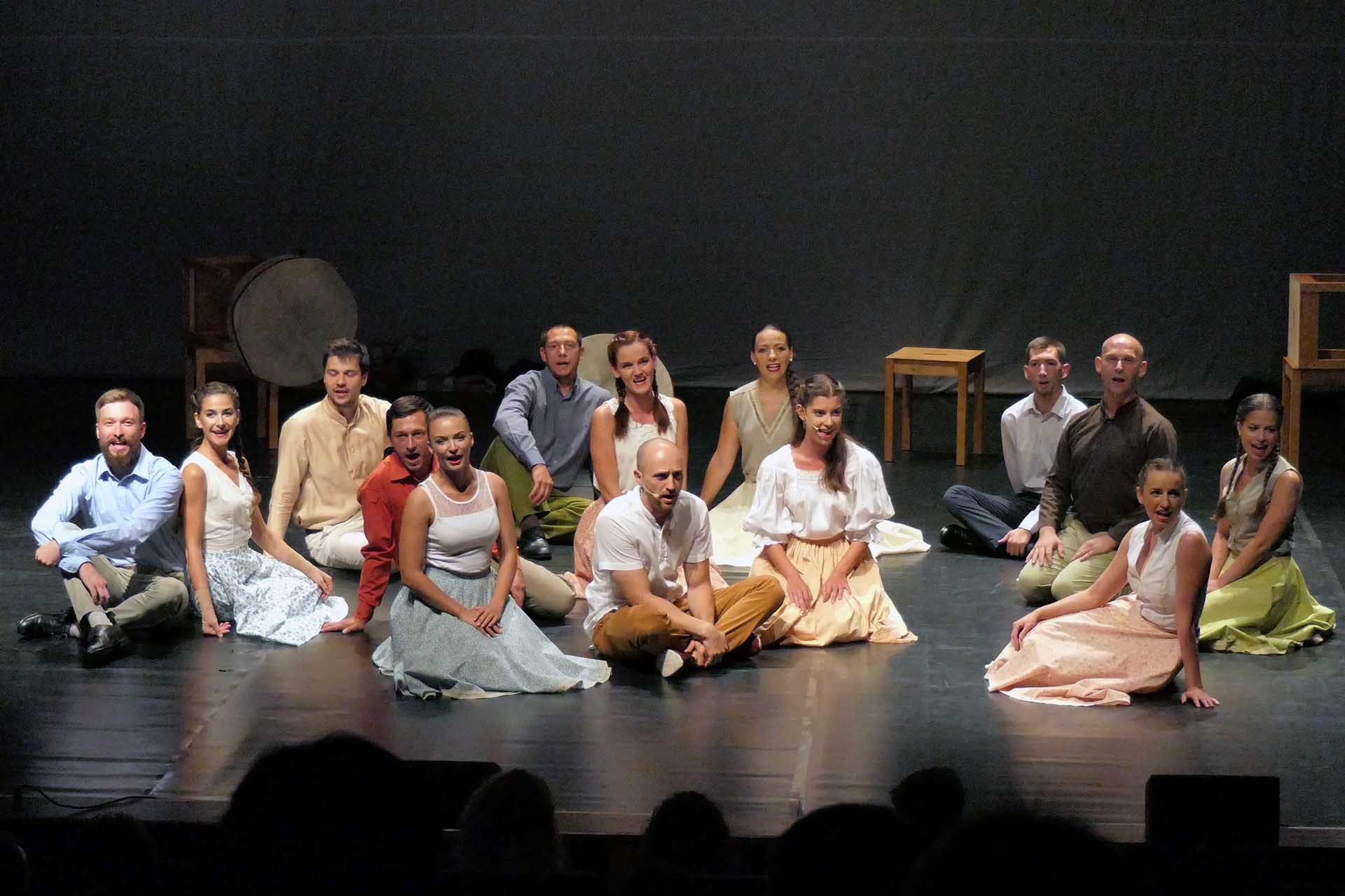 A Kárpát-medence gazdag folklórkincséből táplálkozó előadás bártan alkalmazta a mai költők verseit is (túlnyomó részt Szabó T. Anna és Kukorelly Endre gyermekeknek szánt költeményeire alapoz, amelyeket Kiss Ferenc és Lázár Zsigmond zenésítettek meg). Évszakokra bontották a produkciót. Az egyes fejezetek évszakaiban találtunk egy-egy ismert népszokást (pl. Luca széke, kiszebábú, téltemetés). Az összhangot vers, ritmus, zene és tánc kapcsolatában találtuk meg. A koreográfusi feladatokra a Harangozó Gyula-díjas táncospárt, Appelshoffer Jánost és Rémi Tündét kérte fel a rendezőnő. A narrátor két felnőtt volt, akik egy kislány és egy kisfiú lelkületével beszéltek. Újra gyermekké lettünk egy bő órára. A vidám hangulatot az interakció okozta, átjött az a szeretetteljes munkafolyamat, amely a próbákat jellemezhette. A táncosok, színészek ki-kiszöktek a színpadról, és hol a feloldódó kisgyermekeket, hol a mosolyogva szorongó felnőtteket csikizték meg, dobálták léghógolyóval, ráolvastak nyírfakéregvesszővel vagy altatódallal próbálták megnyugtatni. Elmerültünk valóban az összhatásban. Rá kellett döbbennem, hogy az igazi jó pedagógusok nem veszik el az időt a művészetek gyakorlásától, hanem inkább támogatják azt. Egészen biztos vagyok benne, hogy még a matematika is jobban menne, ha hagynánk a gyerekek lelkét kibontakozni a különböző művészeti ágakban, legyen az képzőművészet, zene vagy tánc.