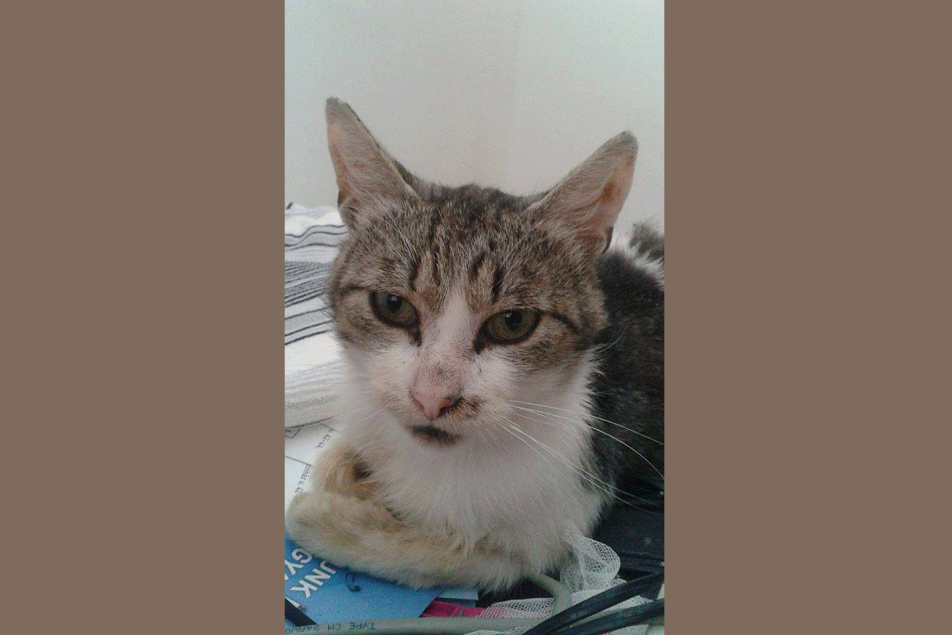 Ezt a kandúrt néhány héttel ezelőtt egy állatbarát turista segítségével sikerült befogni. Megtalálásakor elesett, beteg cica volt, azonban a gyógykezelésének köszönhetően mára meggyógyult. FIV-, FELV-tesztjei negatívak, parazitamentesített és ivartalanított.