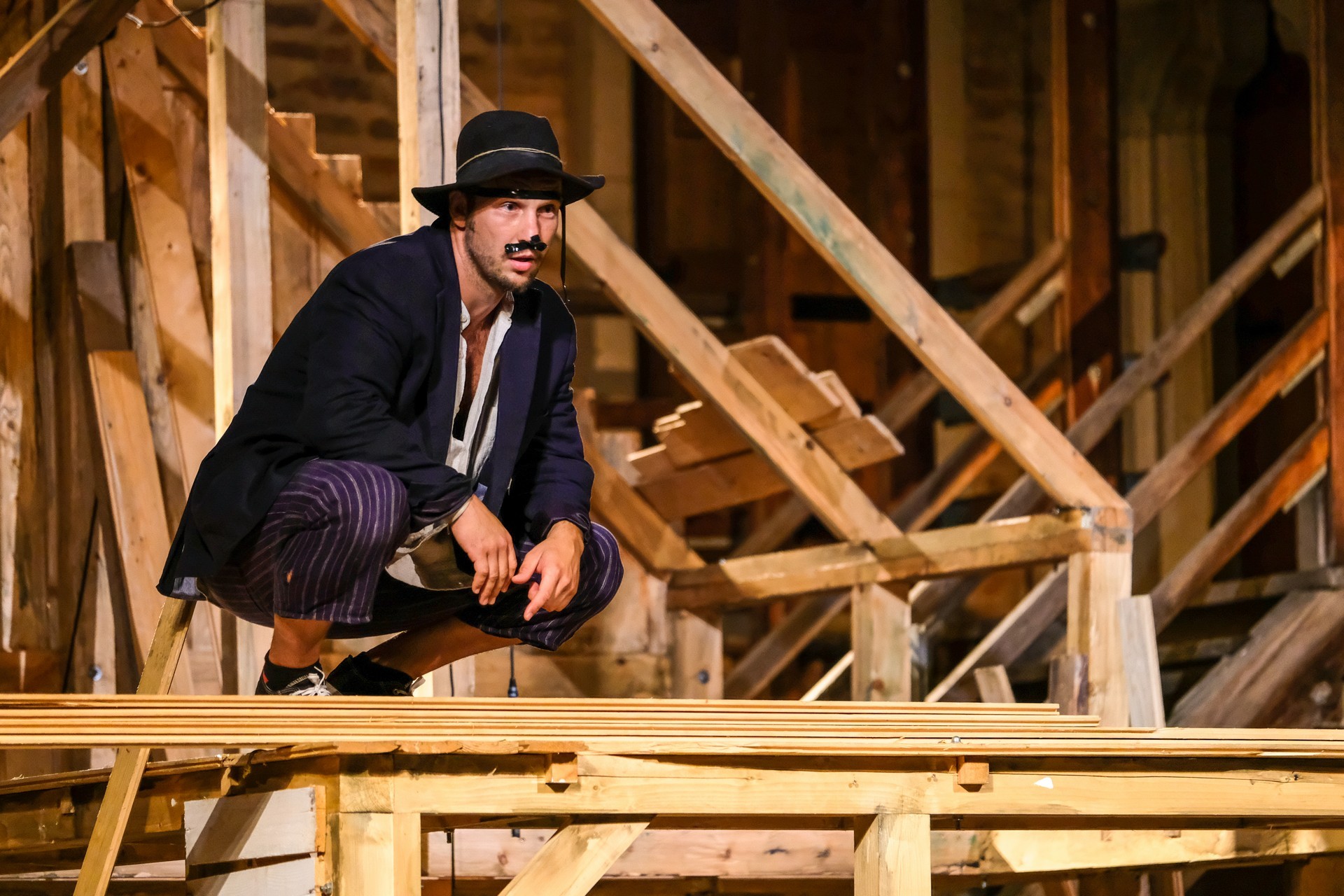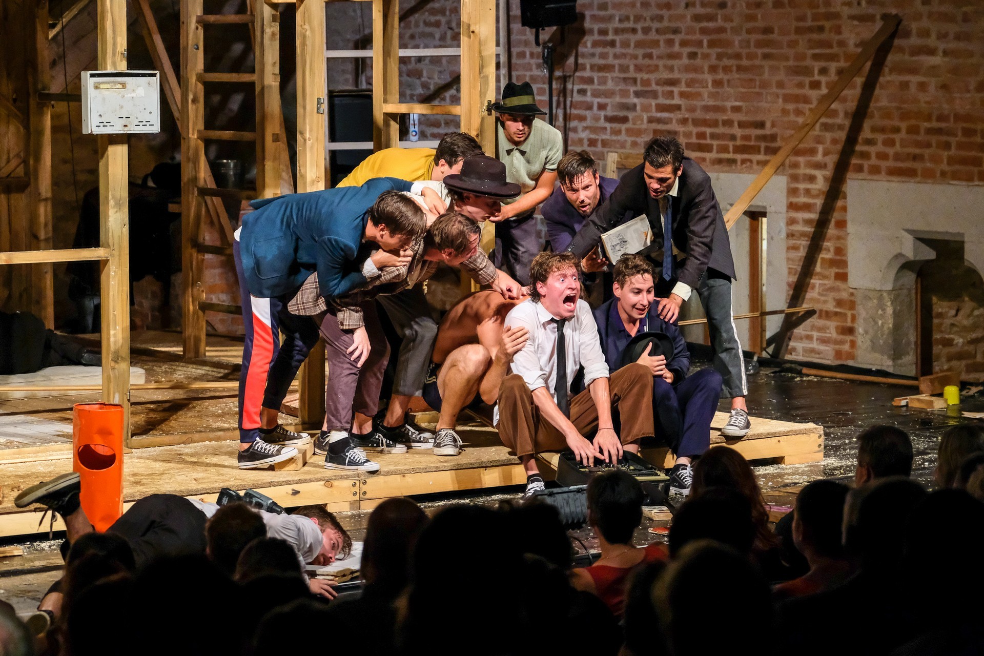 Nos, a színpadi változatban nem mondhatnám, hogy ez pont így van. Az otthon szétesése-szétszedése is annyira megkomponált, annyira összeillesztett, hogy el sem hisszük, hogy ezt így meg lehet csinálni. A bemutatott csapatmunka egyszerűen bravúros, férfimunka a javából. El is hangzik: a baj közösséget kovácsol. És bár sejtettem, hogy senki sem fog lepottyanni a vár fokáról, és a színpad alatti kiállítóterekbe se fog belezuhanni, az életveszélyes-nyaktörős mutatványokat szó szerint végigizgultam. A tűzrakásnál is féltem, de szerencsére sikerült eloltaniuk a lángokat. Amikor pedig a kivert eb helyett fizikailag is bejött a kutyus, egészen odavoltam. Attól is, hogy a „keselyű” ellen itt nemhogy harcoltak volna, hanem éppenséggel dédelgették.