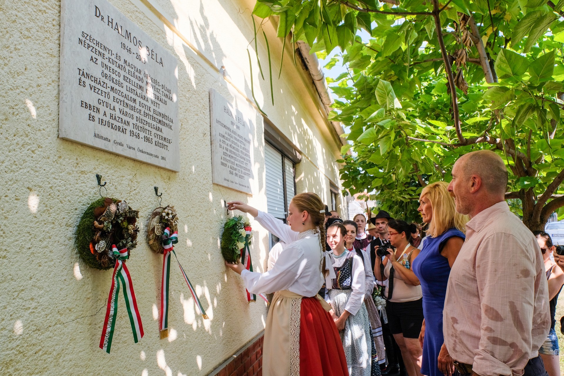 Nem telik el év, hogy a Minden Magyarok Nemzetközi Néptáncfesztiváljának első napján ne emlékezzünk meg ifj. Halmos Béláról – mondta a Széchenyi-díjas népzenekutató, népzenész gyulai szülőházánál Besztercey Attila, az Erkel Ferenc Kulturális Nkft. rendezvényszervezője, majd megkérte Halmos Béla egykori zenésztársát, Patyi Zoltánt, szóljon az egybegyűltekhez.