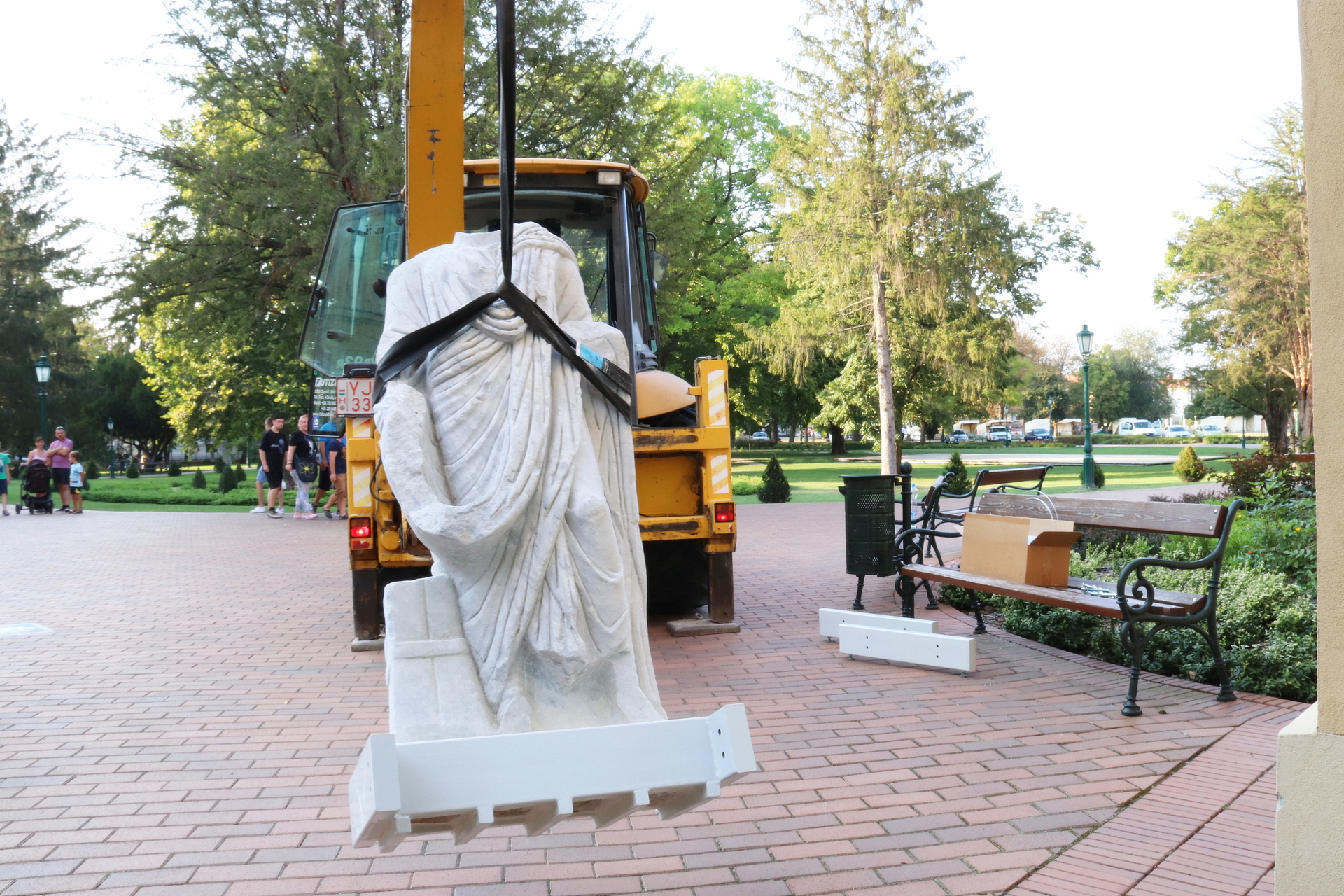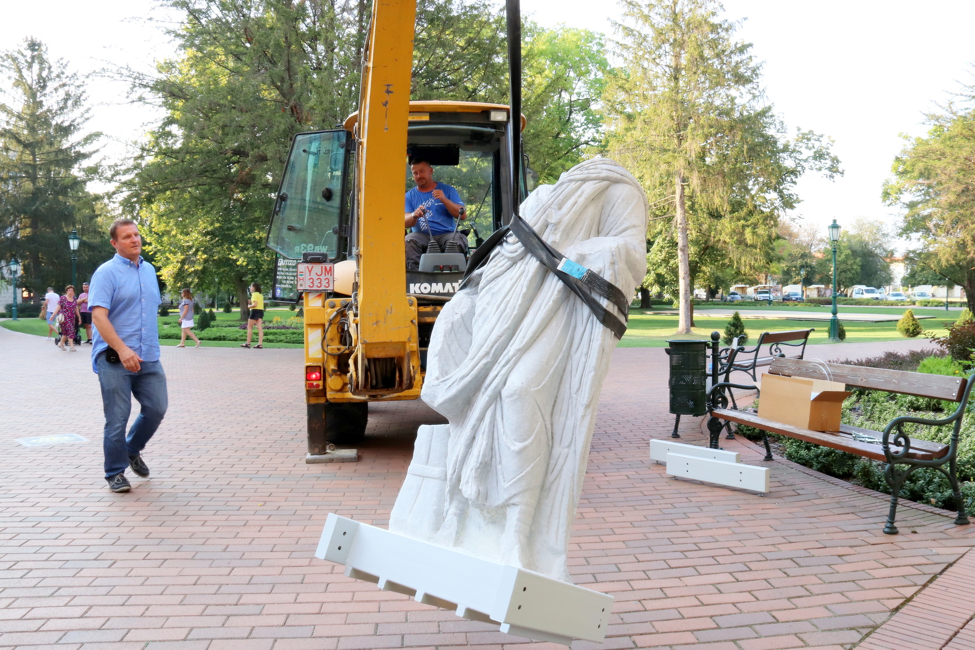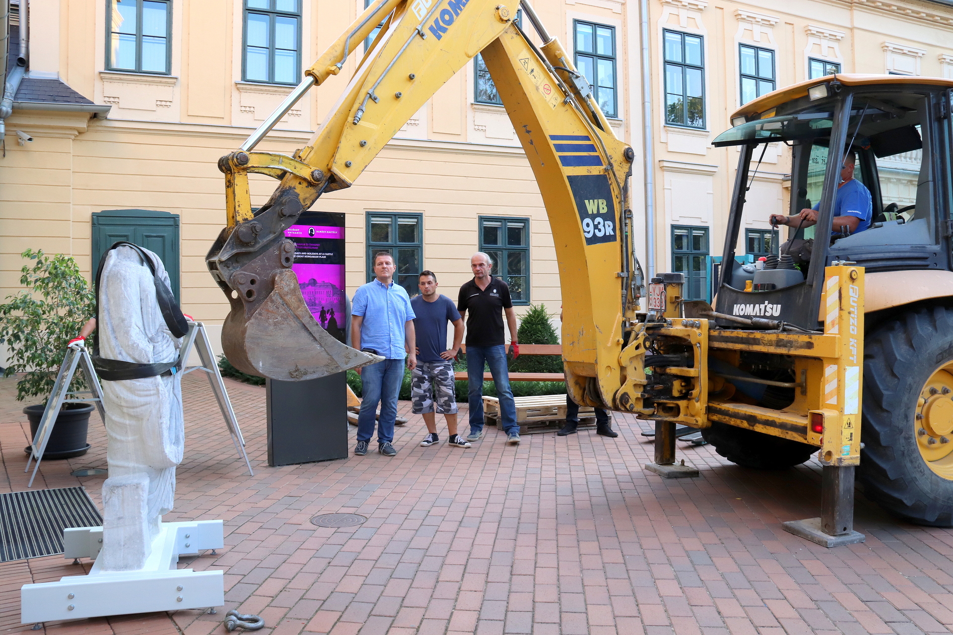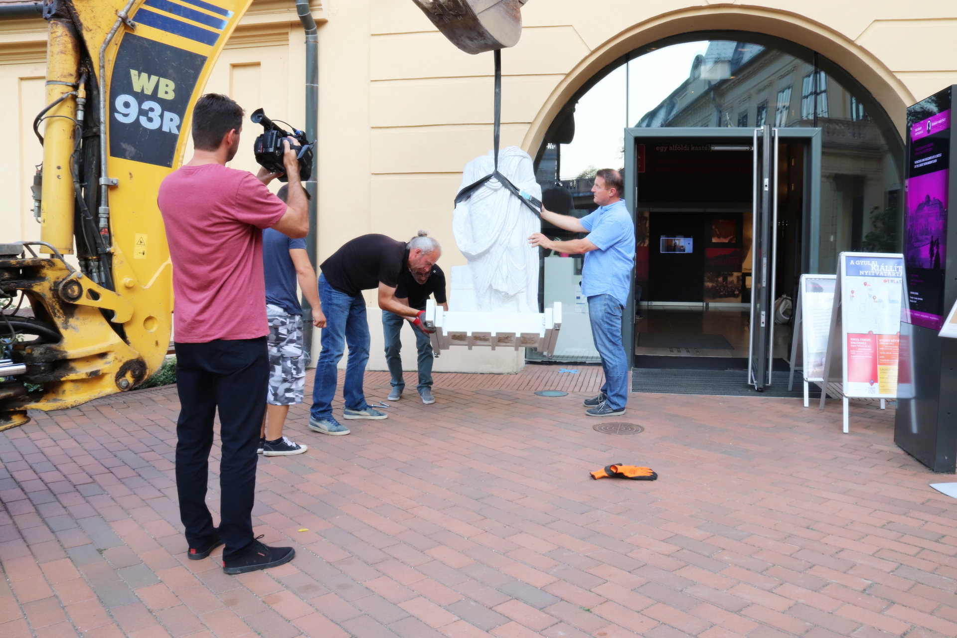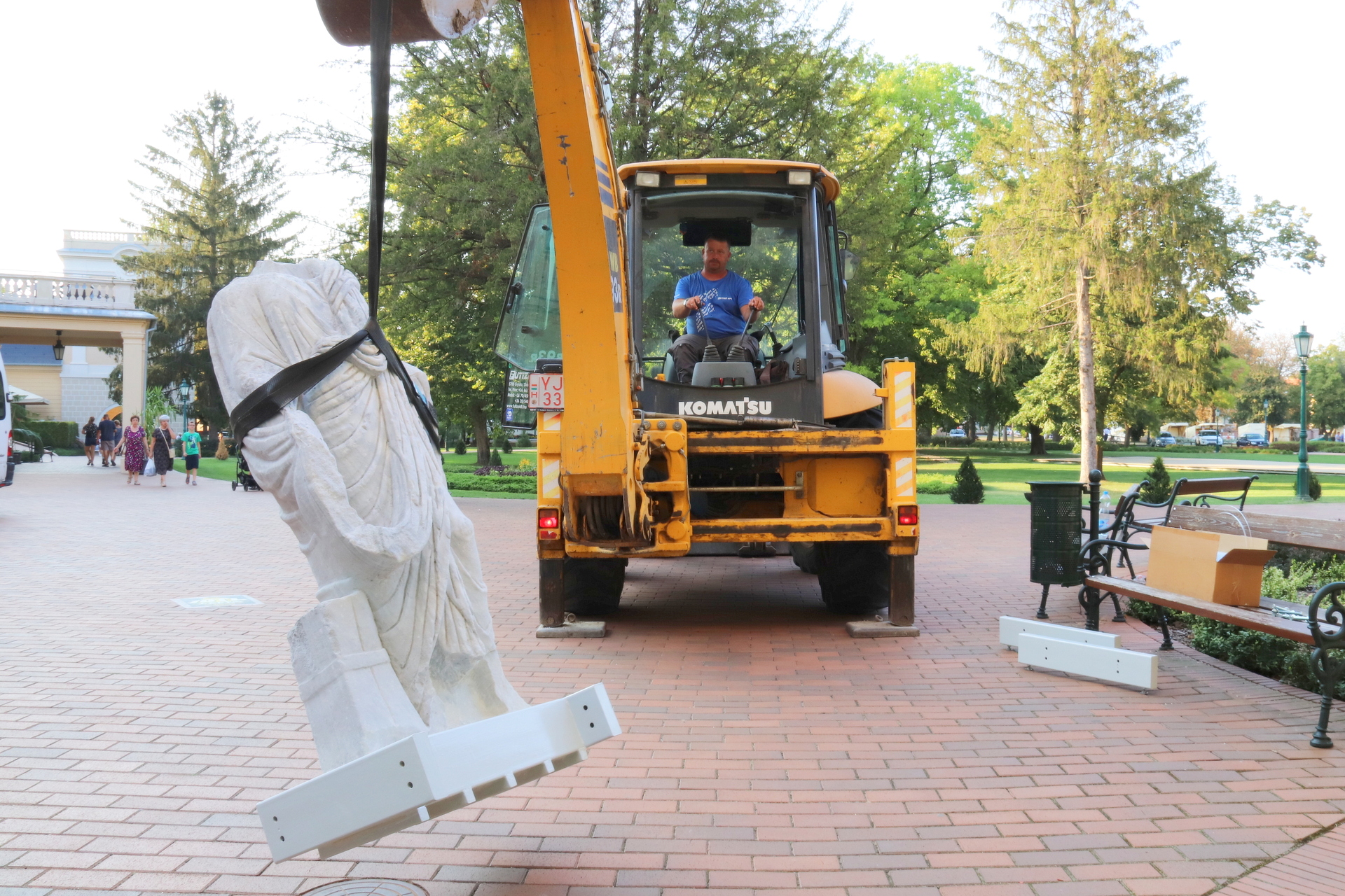 Nehezen, de törés nélkül került a helyére a több száz kilós restaurált római márványszobor