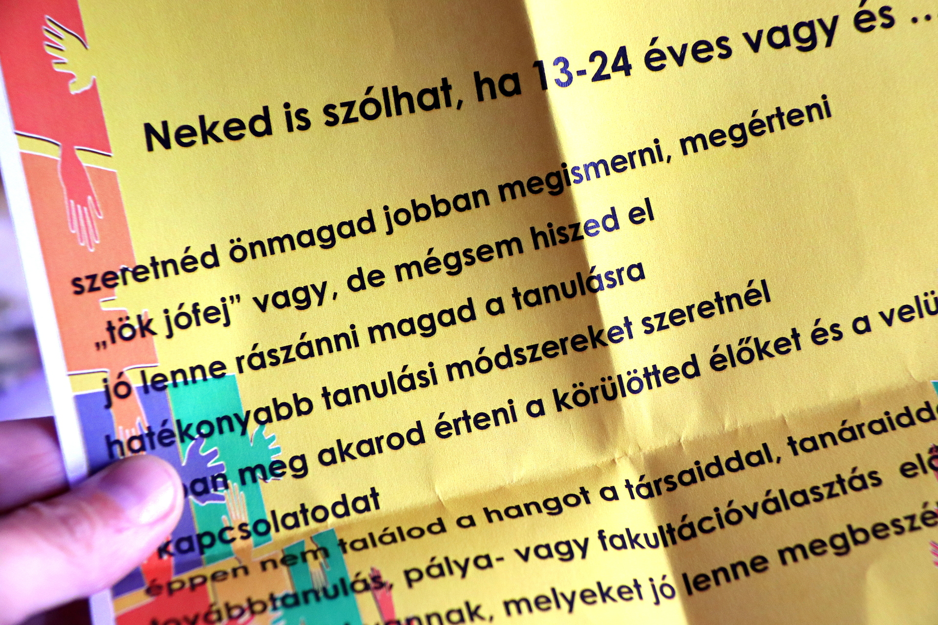 Az ifjúsági központban Szabó Andrea pedagógiai szakpszichológus várja mindazok jelentkezését, akik már betöltötték a tizenharmadik életévüket, de még nem lépték át a huszonötöt, szeretnék jobban megismerni önmagukat és a környezetüket, nem találják a közös hangot a társaikkal, a tanáraikkal, vagy a szüleikkel, tanulnának, de nem nagyon tudják rászánni magukat. Azok is megkereshetik a szakembert, akik csak hatékonyabb tanulási módszereket sajátítanának el, vagy pálya-, esetleg fakultációválasztás előtt állnak, és nem tudják, mitévők legyenek.