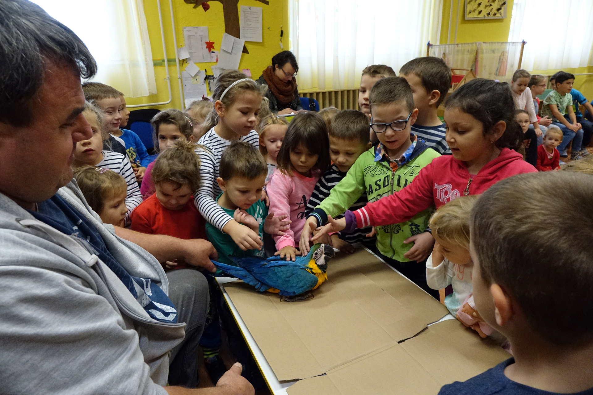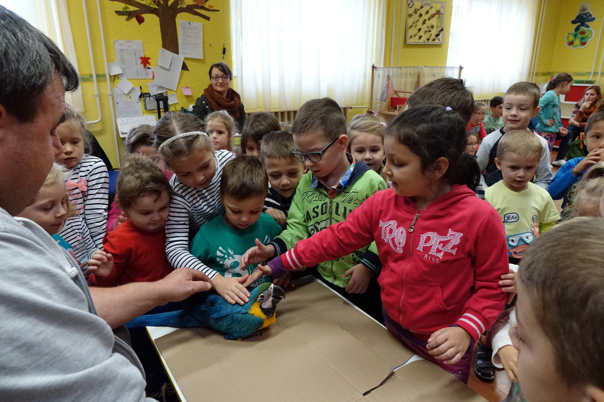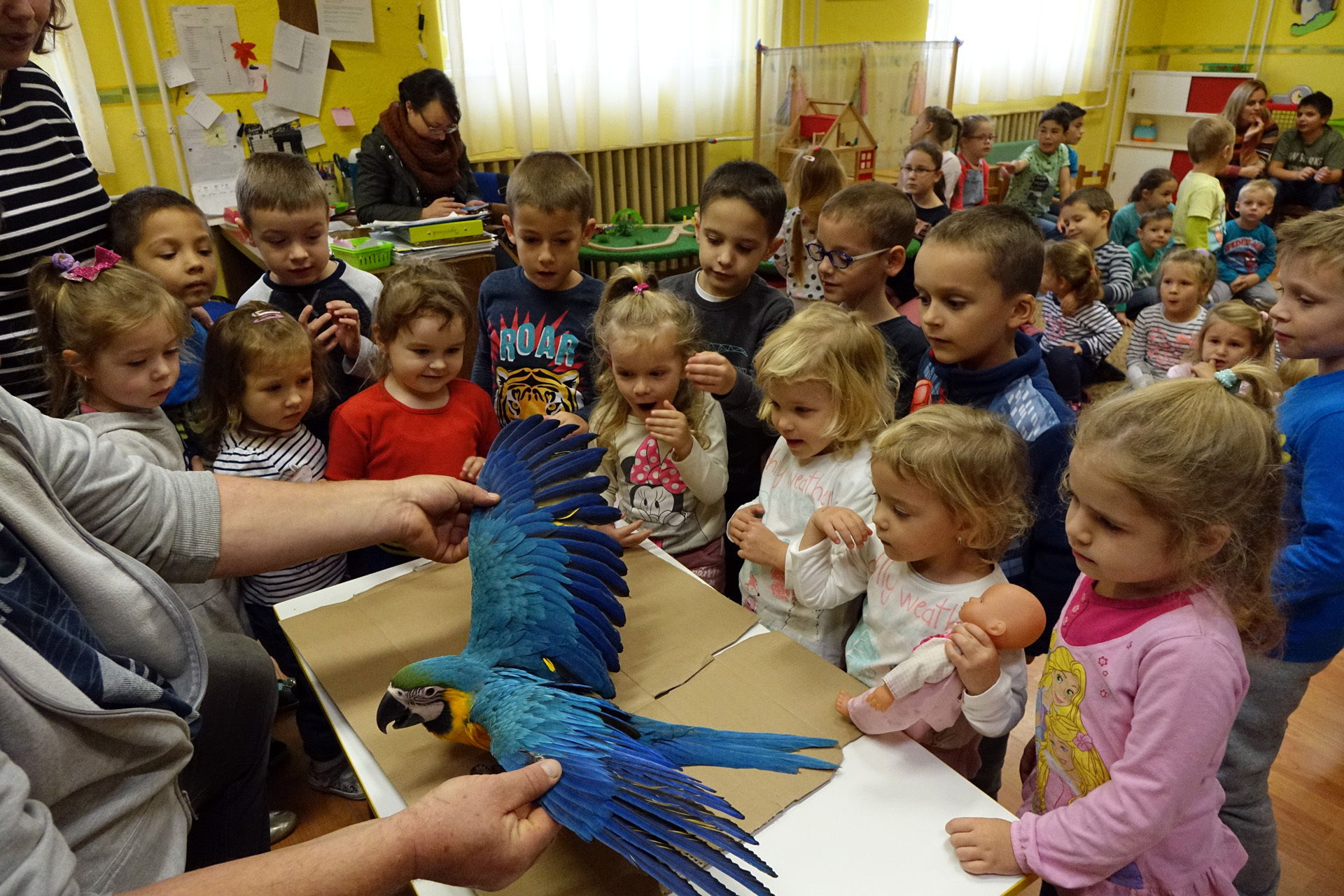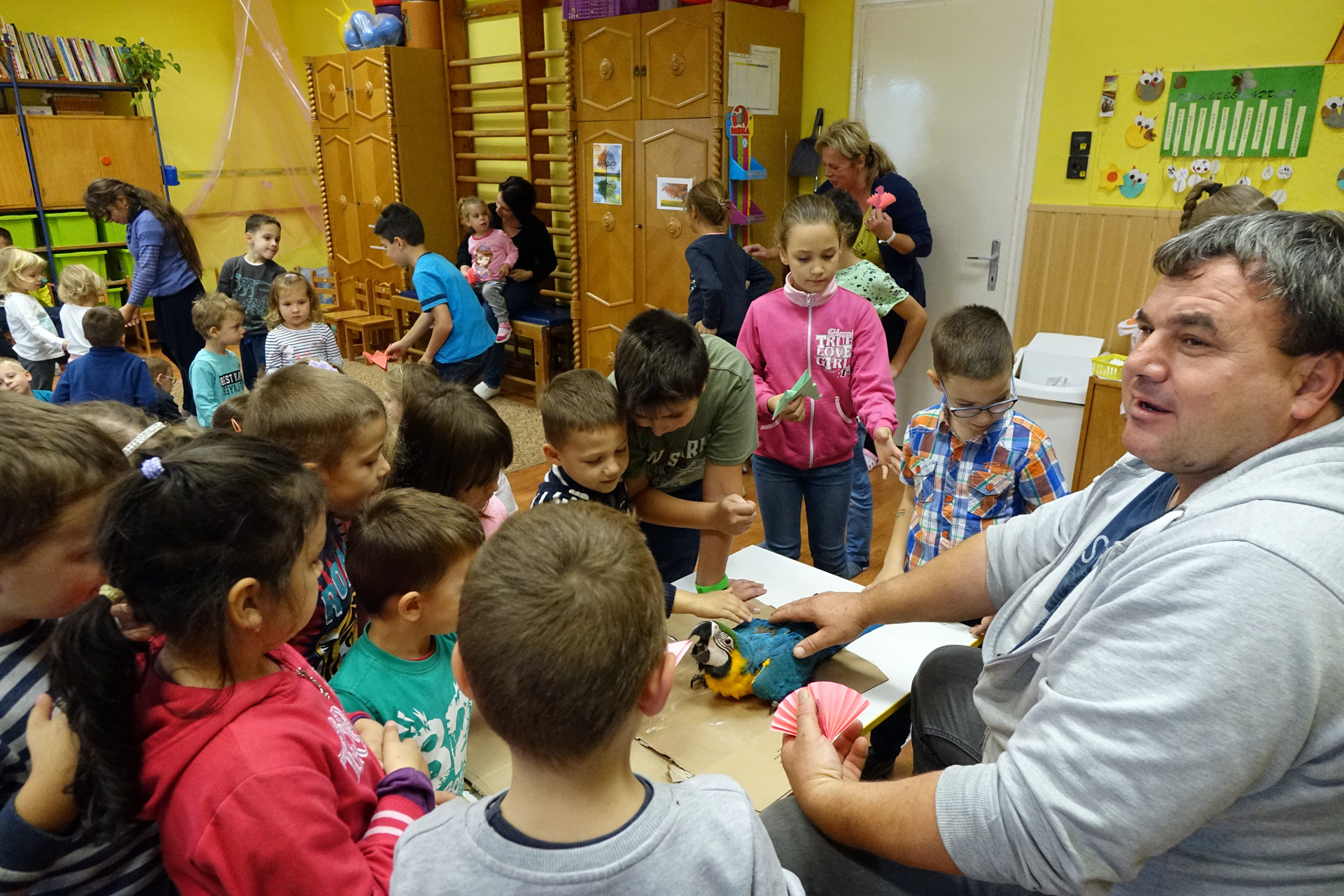 A tagintézményben ottjártunkkor Fülöp János madarász tartott szakkört az óvodásoknak és az Implom-iskola egyik osztályának. A gyerekek a szakember jóvoltából egy fiatal arapapagájt is szemügyre vehettek közelebbről.