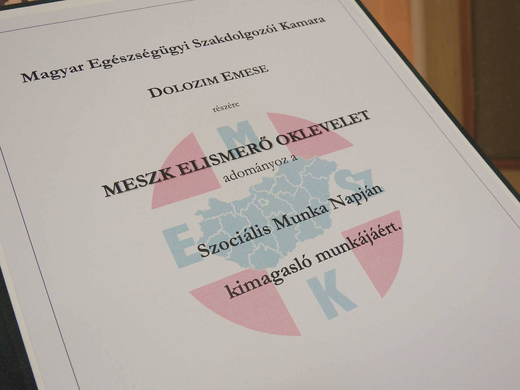 Kimagasló munkájáért a Magyar Egészségügyi Szakdolgozói Kamara elismerését vehette át Dolozim Emese, a fővárosi önkormányzat gyulai idősotthonának vezetője november 9-én Budapesten, a szociális munka napja alkalmából szervezett országos konferencián.