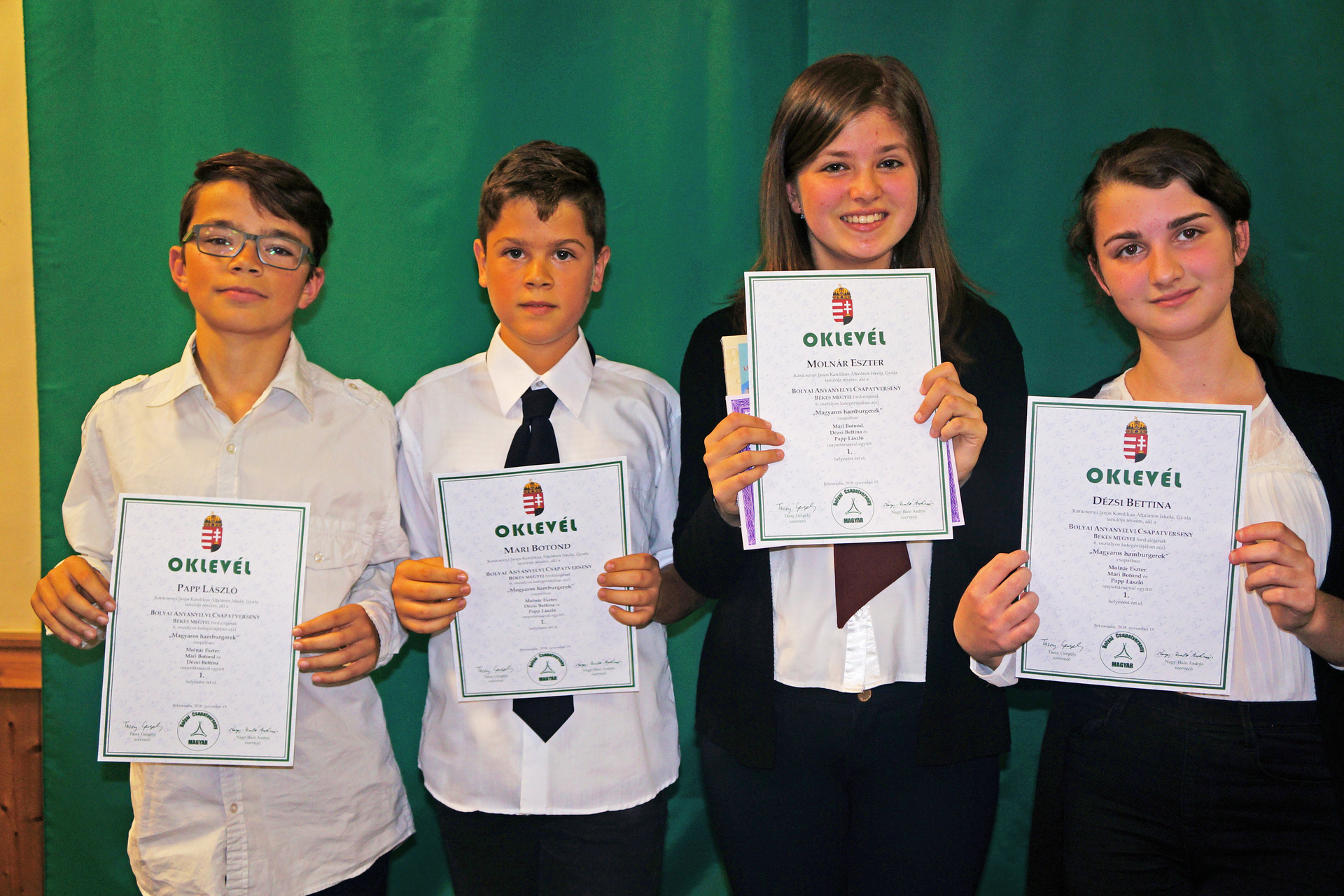 Büszkék lehettünk nyelvápoló karácsonyis diákjaink eredményére, mert a 3. osztályos csapat, az „AngyaliM” (Bukodi Máté István, Krasznai Hanna Boglárka, Reck Anna Anasztázia, Seres Csanád) a 4. helyezést, a 6. osztályos „Magyaros hamburgerek” (Molnár Eszter, Mári Botond, Dézsi Bettina, Papp László) az 1. helyezést érték el, így a 6. évfolyamos tanulóink fogják Békés megyét képviselni december 8-án, a budapesti országos döntőn.