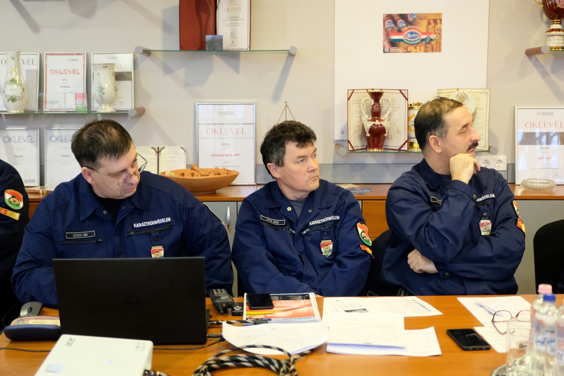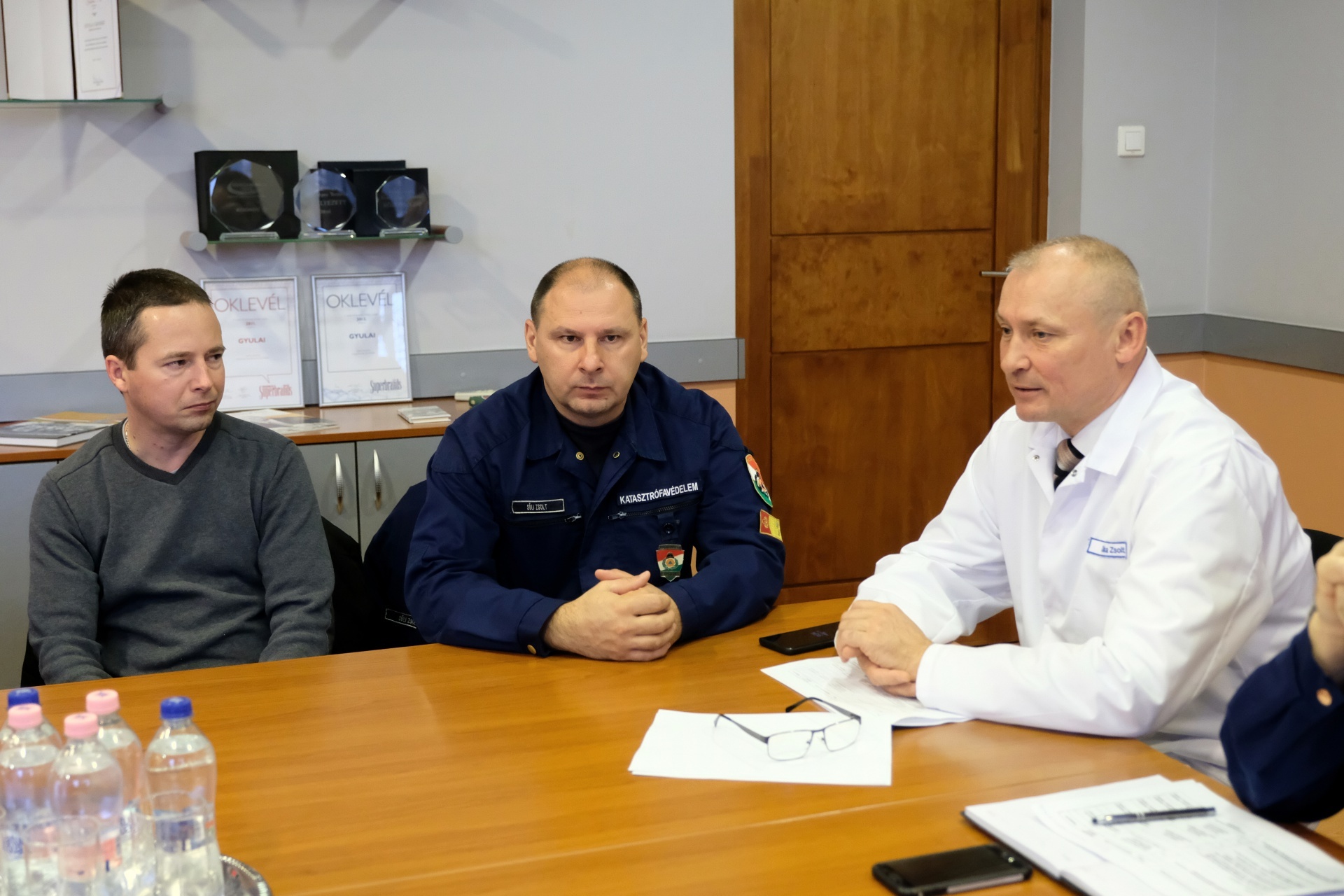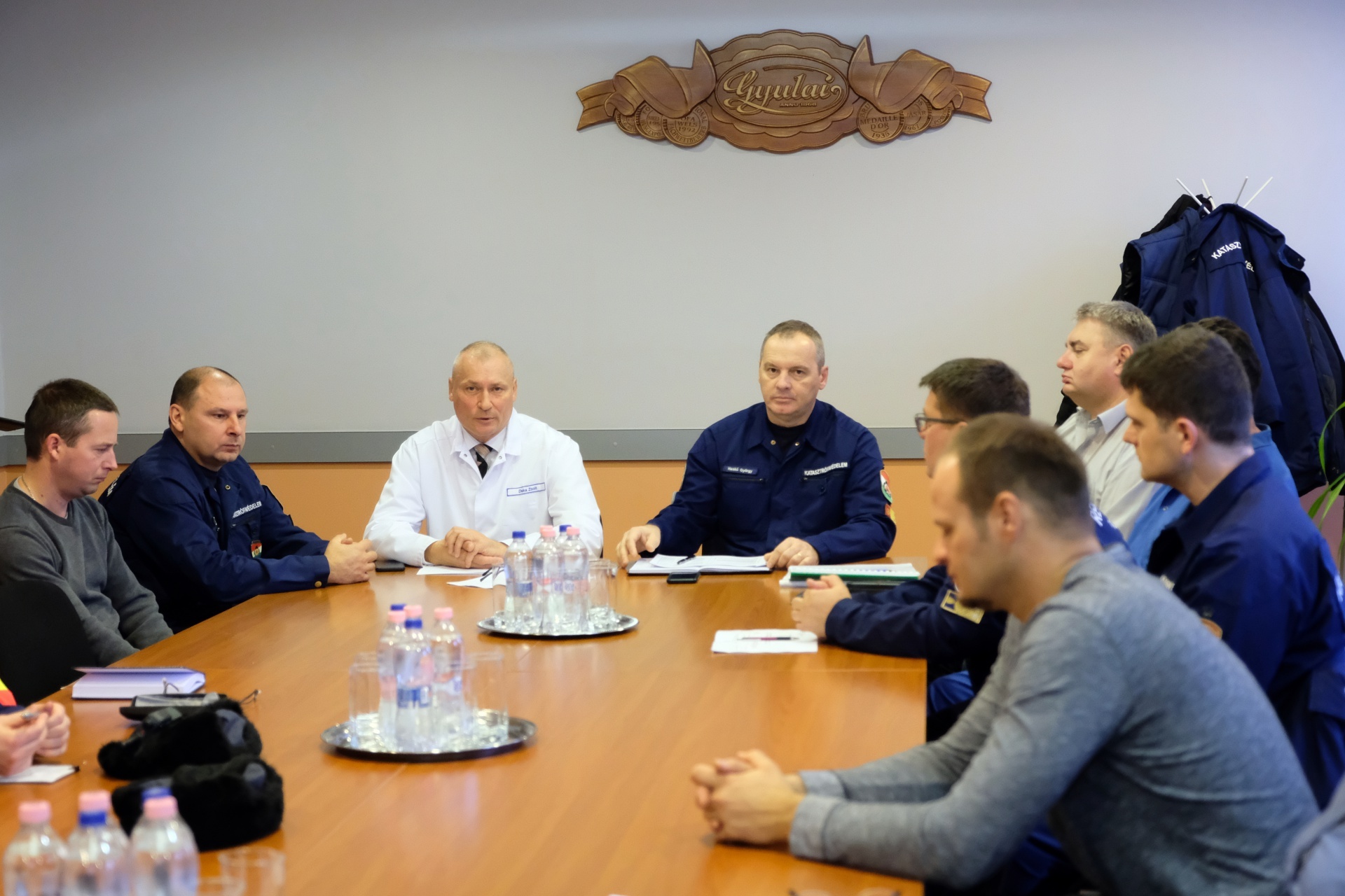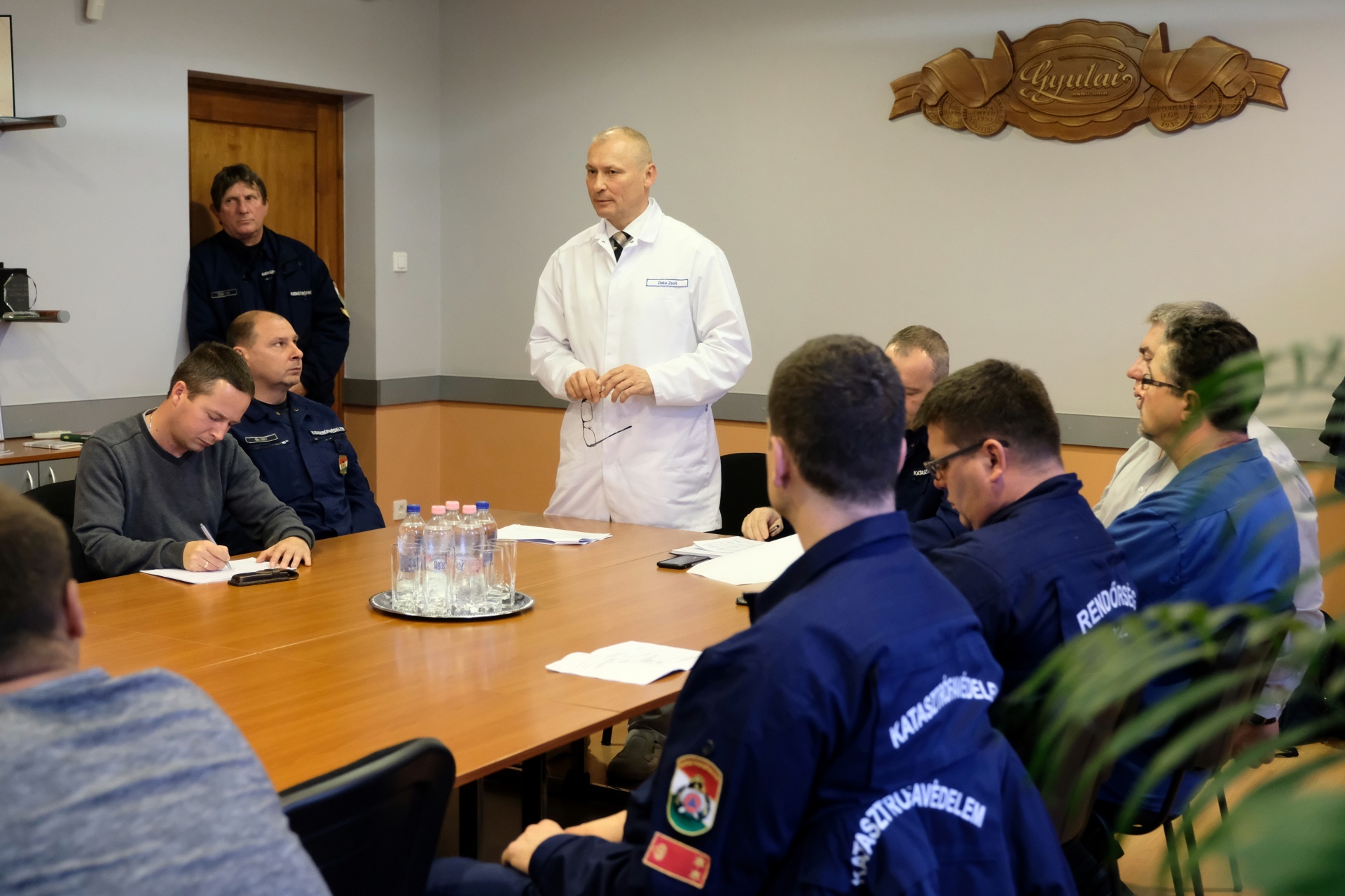 Tesztelték a Gyulahús Kft. vészhelyzeti jelzőrendszerét a cég Kétegyházi úti telephelyén november 21-én. A gyakorlat előtt az illetékes szervek a Béke sugárúti épületben tartottak megbeszélést. A részletekről Daka Zsolt ügyvezető számolt be nekünk.