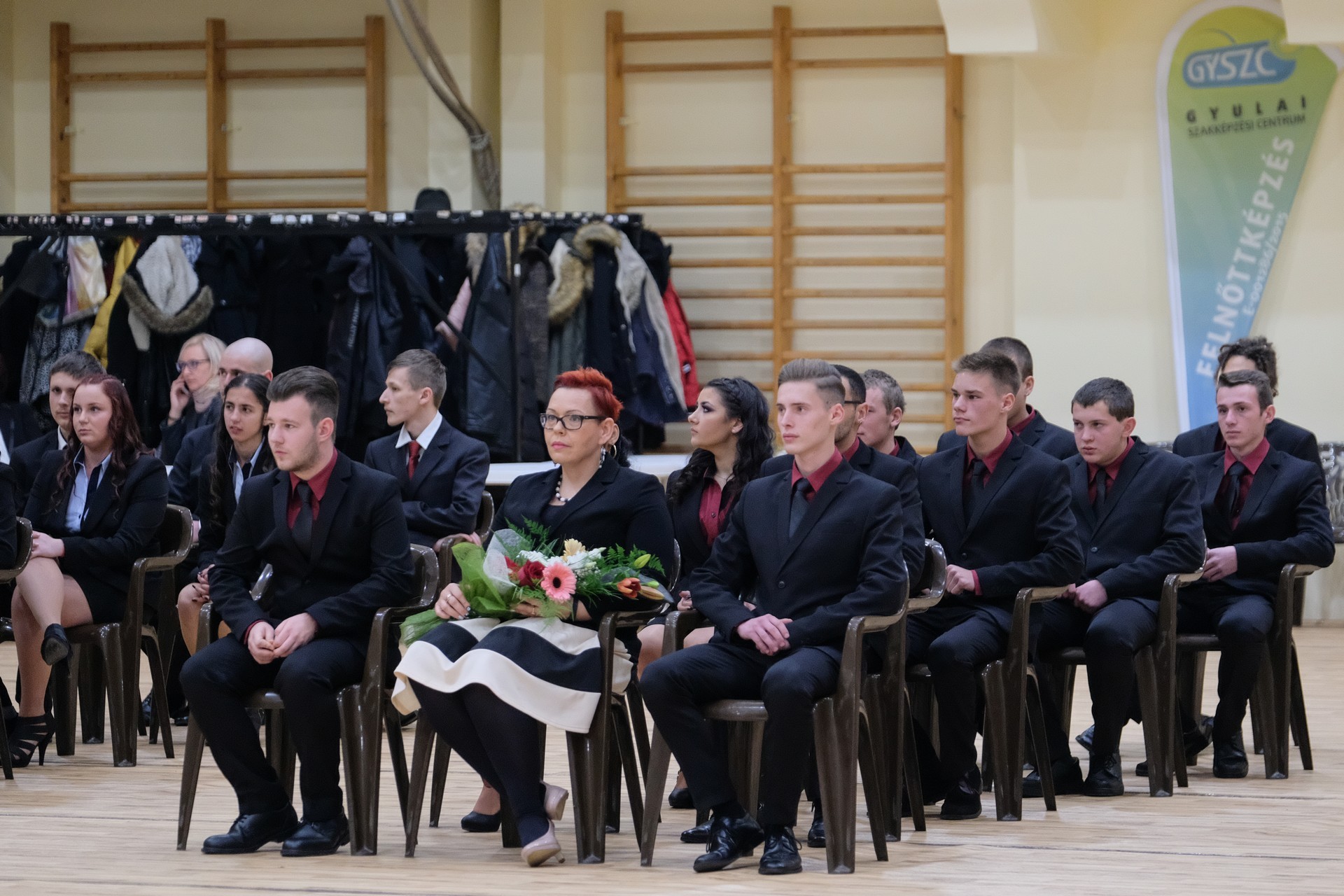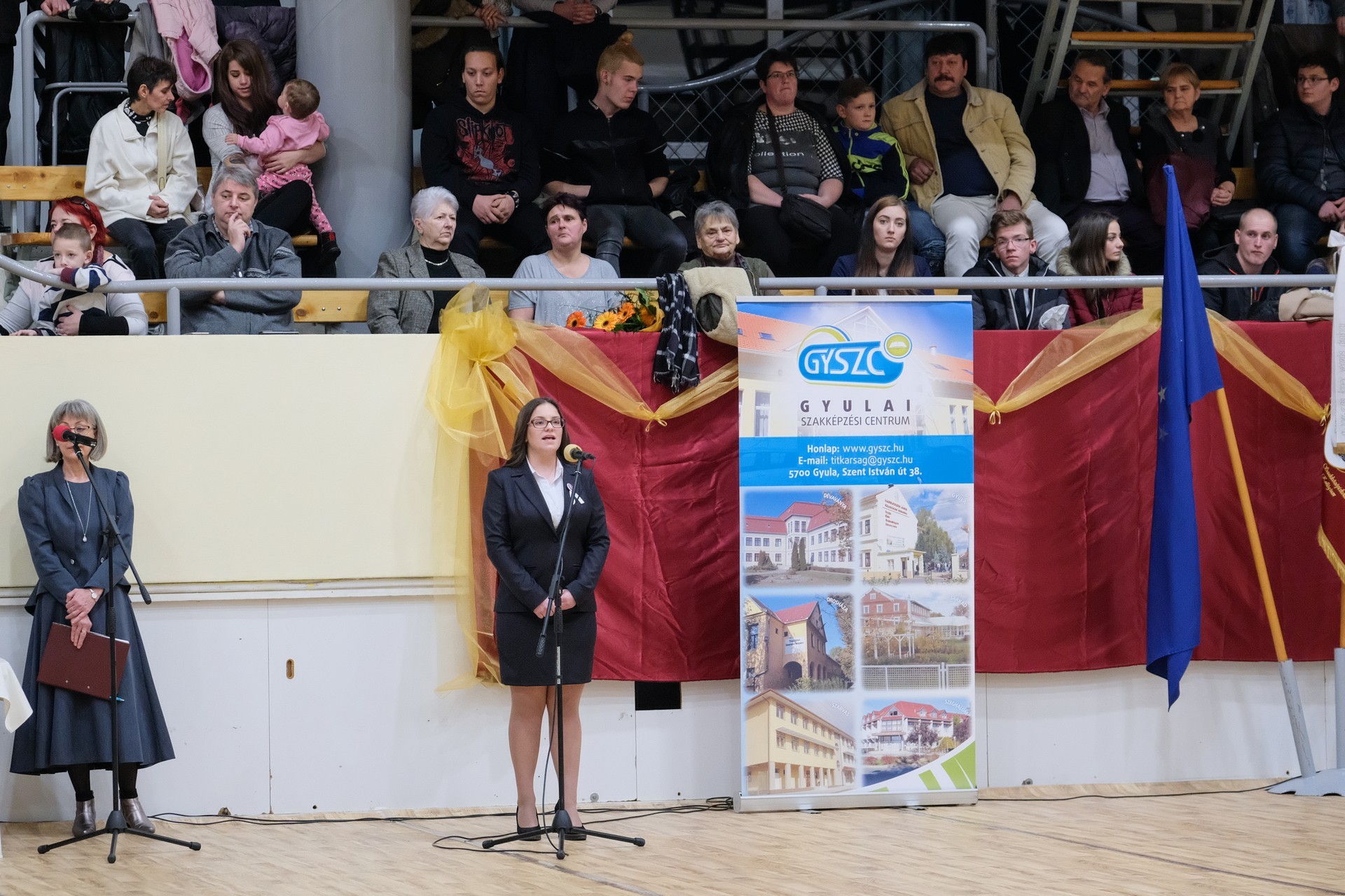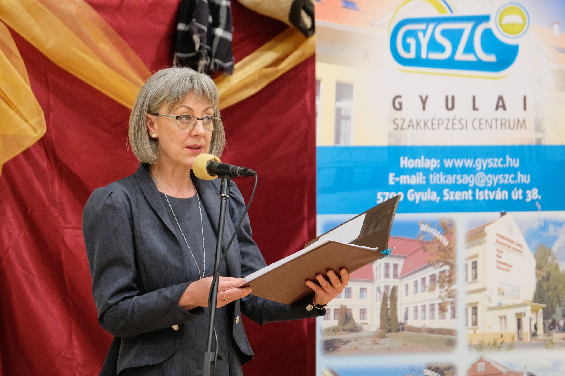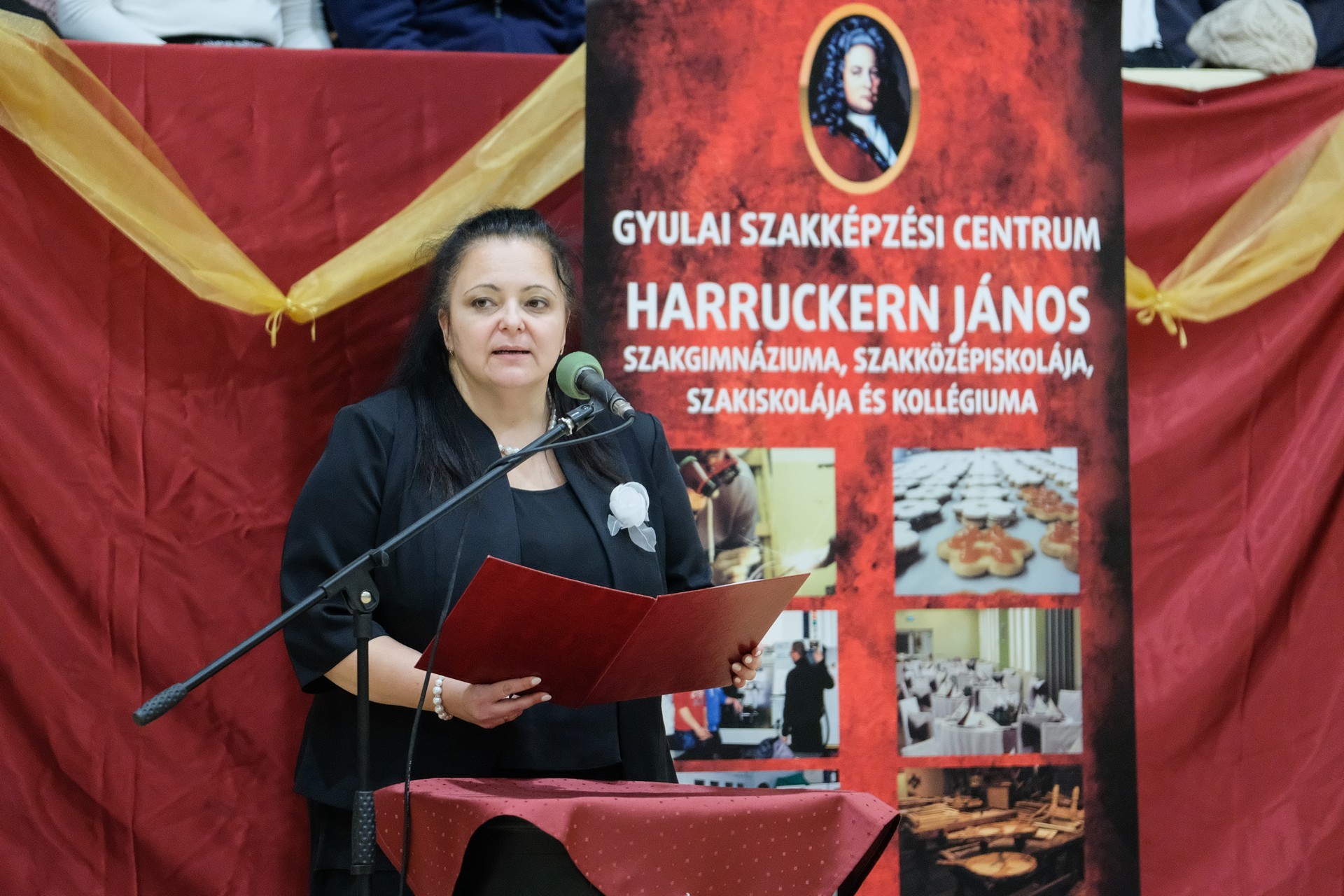 A végzősöket idén Czeglédiné Szappanos Anita, a Gyulai Szakképzési Centrum Harruckern János Szakgimnáziuma, Szakközépiskolája, Szakiskolája és Kollégiuma igazgatója köszöntötte. Alkalmi beszédében az intézményvezető kiemelte: a szalagavató azt jelzi, hogy a diákok megtettek egy utat, amelynek lassan a végéhez közelednek, életük első jelentős mérföldkövéhez. Ennek kapcsán elmesélte annak az ácsnak a történetét, aki elfusizta utolsó munkáját, mert nem számolt azzal, hogy a gondtalanul felépített ház kulcsát végül neki adják ajándékba. Meglepetésében azt mondta, ha ezt tudja, egészen biztosan másképp dolgozik.