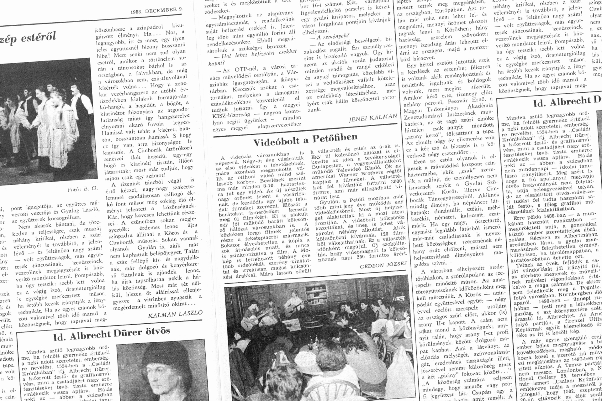 A videózás városunkban is népszerű. Négy-öt éve vásárolták az első videókat a tehetősebbek, már a azonban megszokottá válik az otthoni videó mind szélesebb körben. Becslések szerint ma már minden 8-–10. háztartásra jut egy videó. Az új készülék nagy örömet jelent a vásárlóknak, de kezdődik egy újabb feladat: filmeket szerezni. Először a barátokat, Ismerősöket keresik meg új filmekért. (…) Gyulán, a Petőfi moziban már több mint egy éve működik egy videókölcsönző. Most új helyiséget alakítottak ki a mozi utcai frontján. (...)