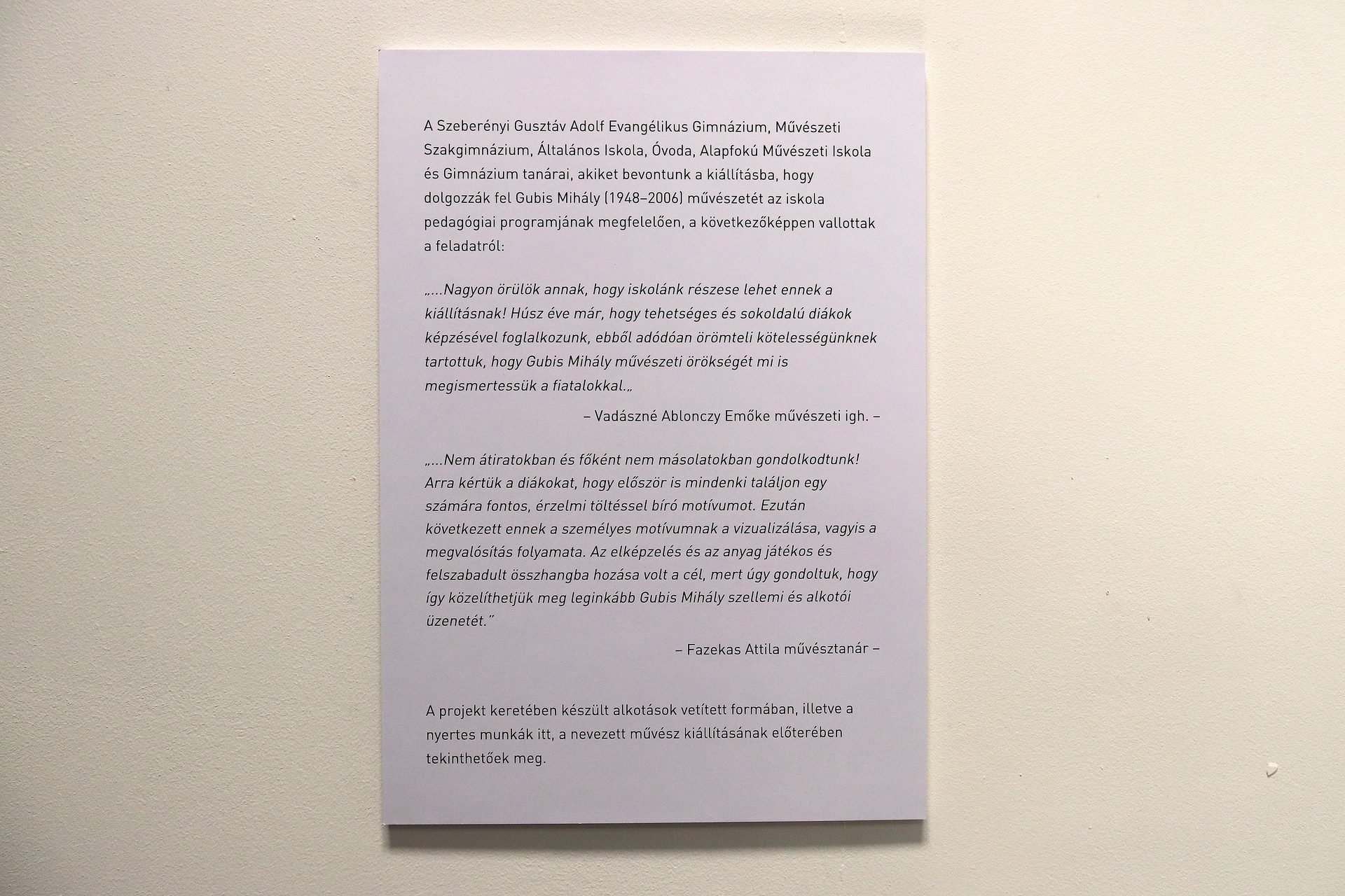 A január végéig megtekinthető békéscsabai tárlat a családi hagyatékból és a múzeum anyagából állt össze. A válogatáshoz több kapcsolódó program társul, azzal a céllal, hogy az egykoron nyitott és őszinte Gubis Mihályt minél többen megismerjék.
