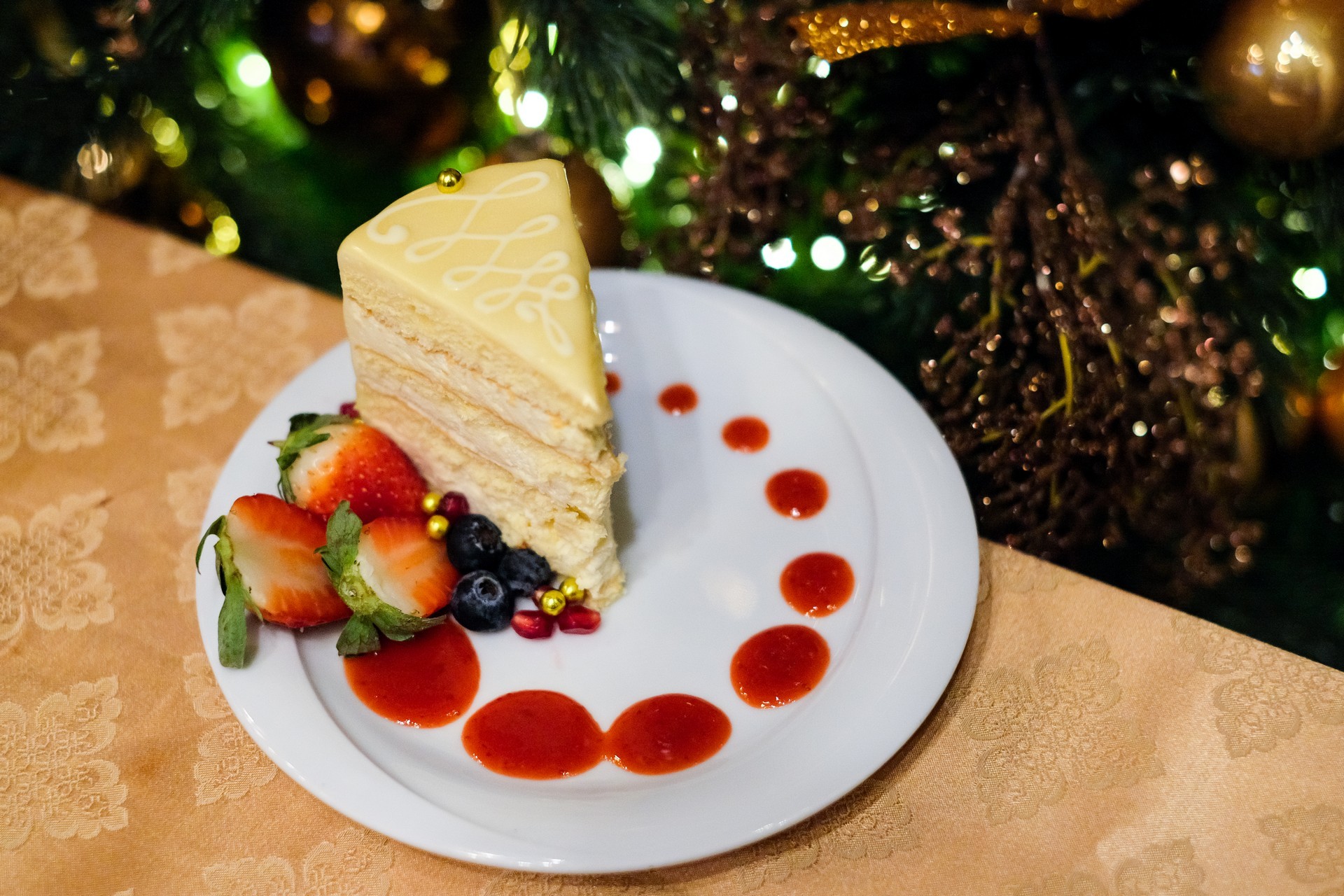 Készítsünk négy darab kerek, 14 cm átmérőjű Sand-lapot! A tojássárgákat a cukor felével gőz fölött melegítjük 60–70 Celsius-fokra, majd kihűlésig keverjük. A cukor másik felével felverjük a tojásfehérjét, hozzáadjuk a tojás appereil-hez, melírozzuk hozzá a lisztet, végül az olvasztott vajat. Gőzmentes sütőben 160–180 Celsius-fokon sütjük. A bort a tojássárgával, a cukorral és a porzselatinnal összekeverve vízgőzön melegítjük. A keverés által lehűlt krémhez keverjük az olvasztott fehércsokoládét, majd a tejszínhabot. A négy Sand-lapot ezzel a krémmel töltjük be, dermesztjük, majd bevonjuk a bevonattal. (Borbély Béla receptúrája) Az ambróziaágyhoz különböző gyümölcsökből szószokat, zseléket készítünk, tojásfehérjéből meringue-t formázunk, és gyümölcsöket faragunk, amelyeket a tálaláshoz használunk.