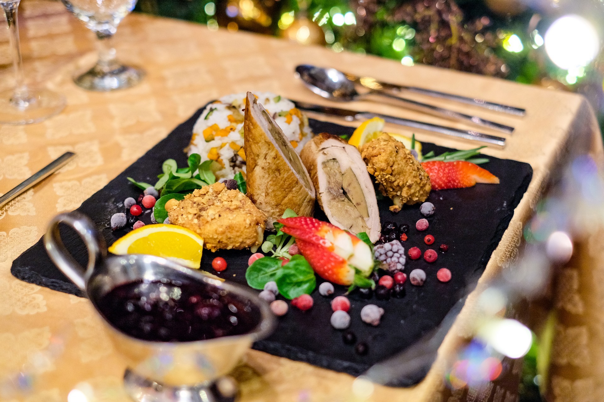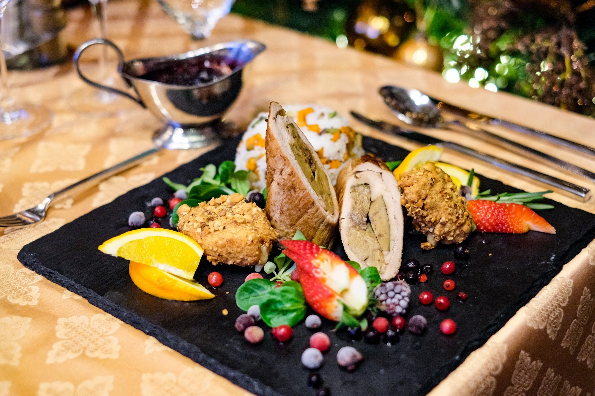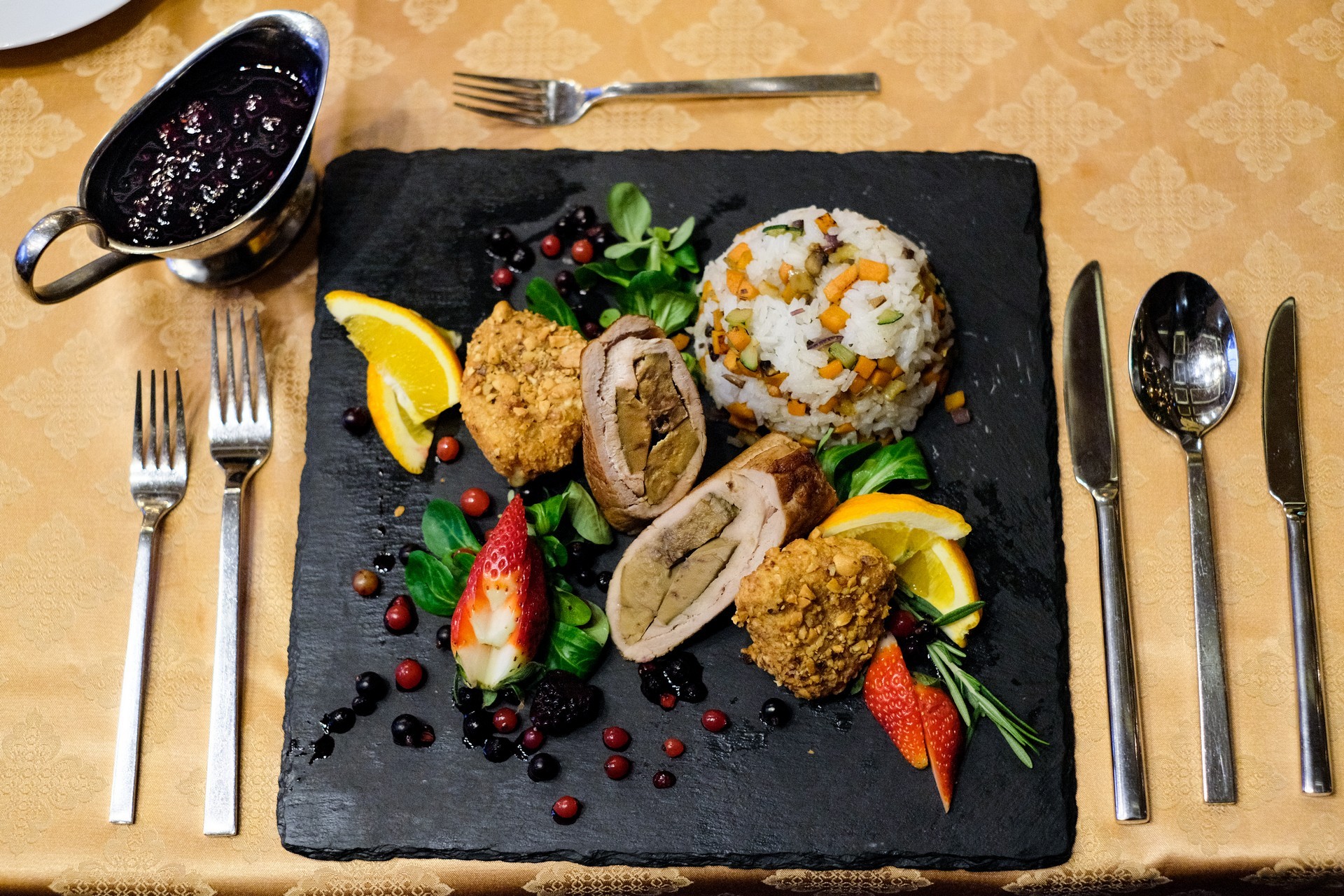 Libamájjal töltött sertésszűz, mogyorós-diós bundában sült camembert-rel, zöldséges jázmin-rizzsel, erdei gyümölcsös raguval