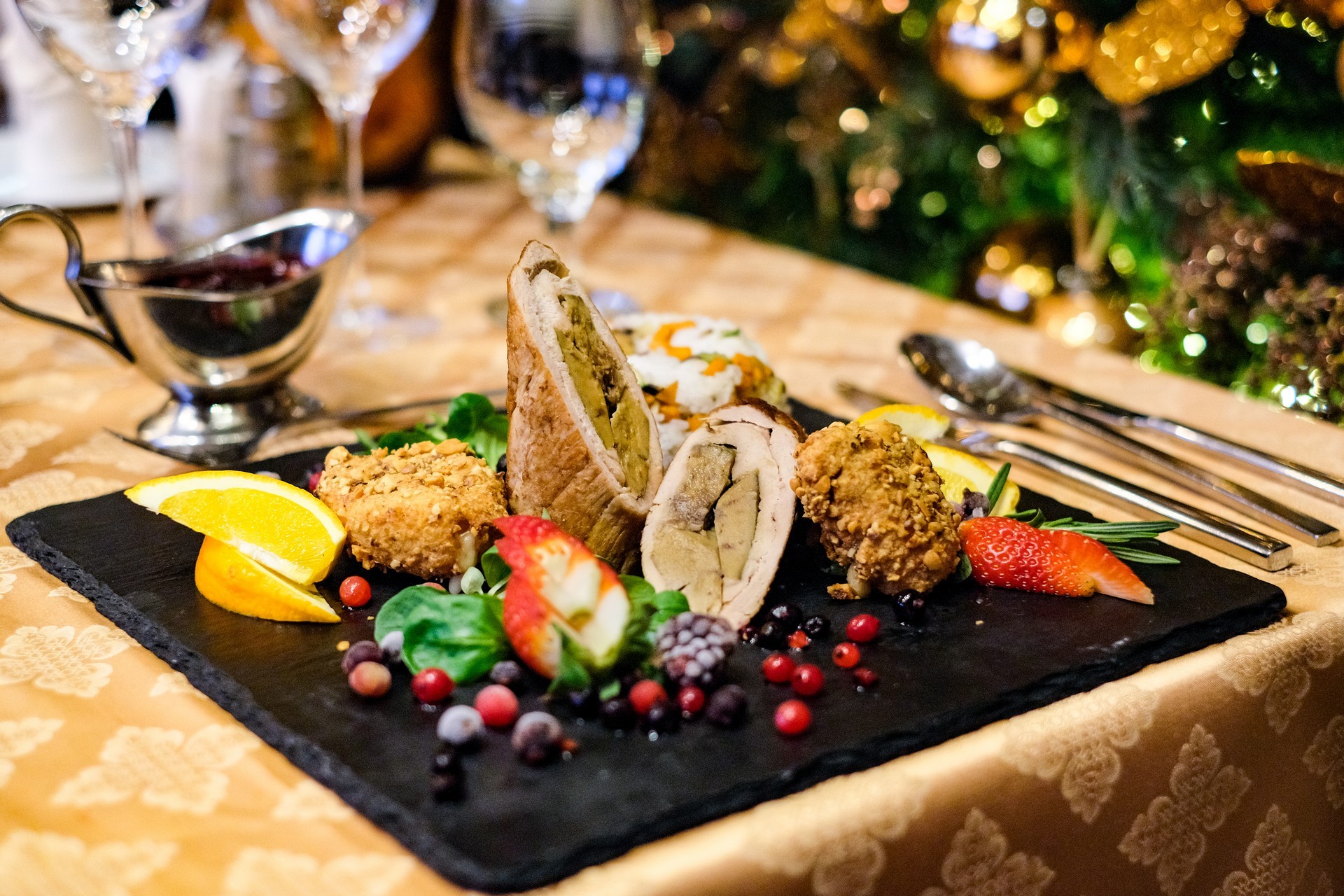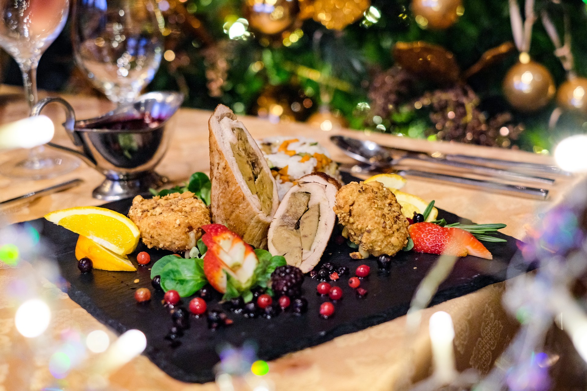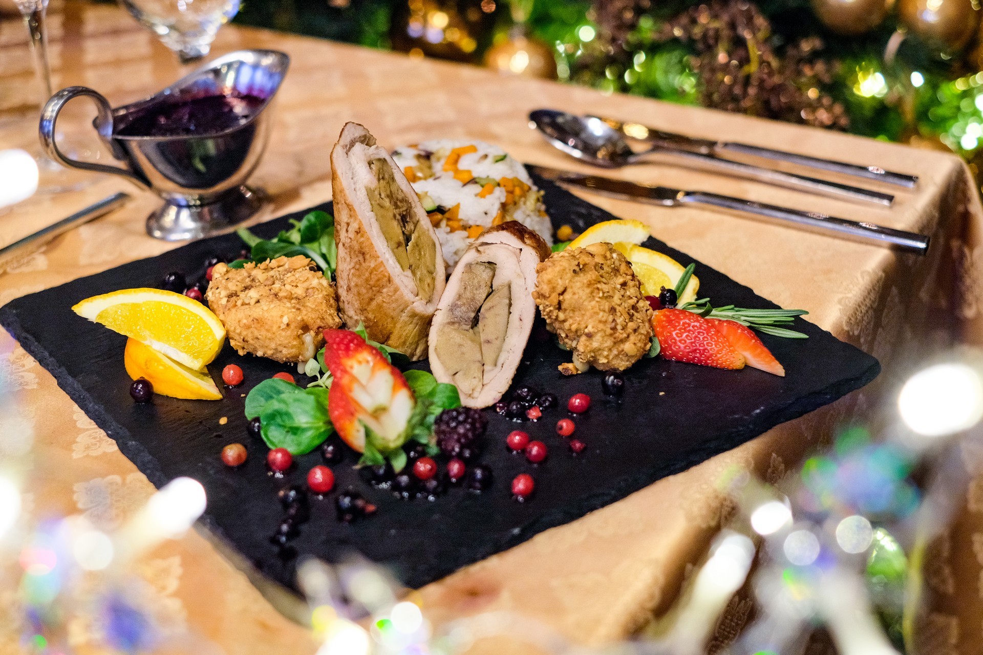 Libamájjal töltött sertésszűz, mogyorós-diós bundában sült camembert-rel, zöldséges jázmin-rizzsel, erdei gyümölcsös raguval