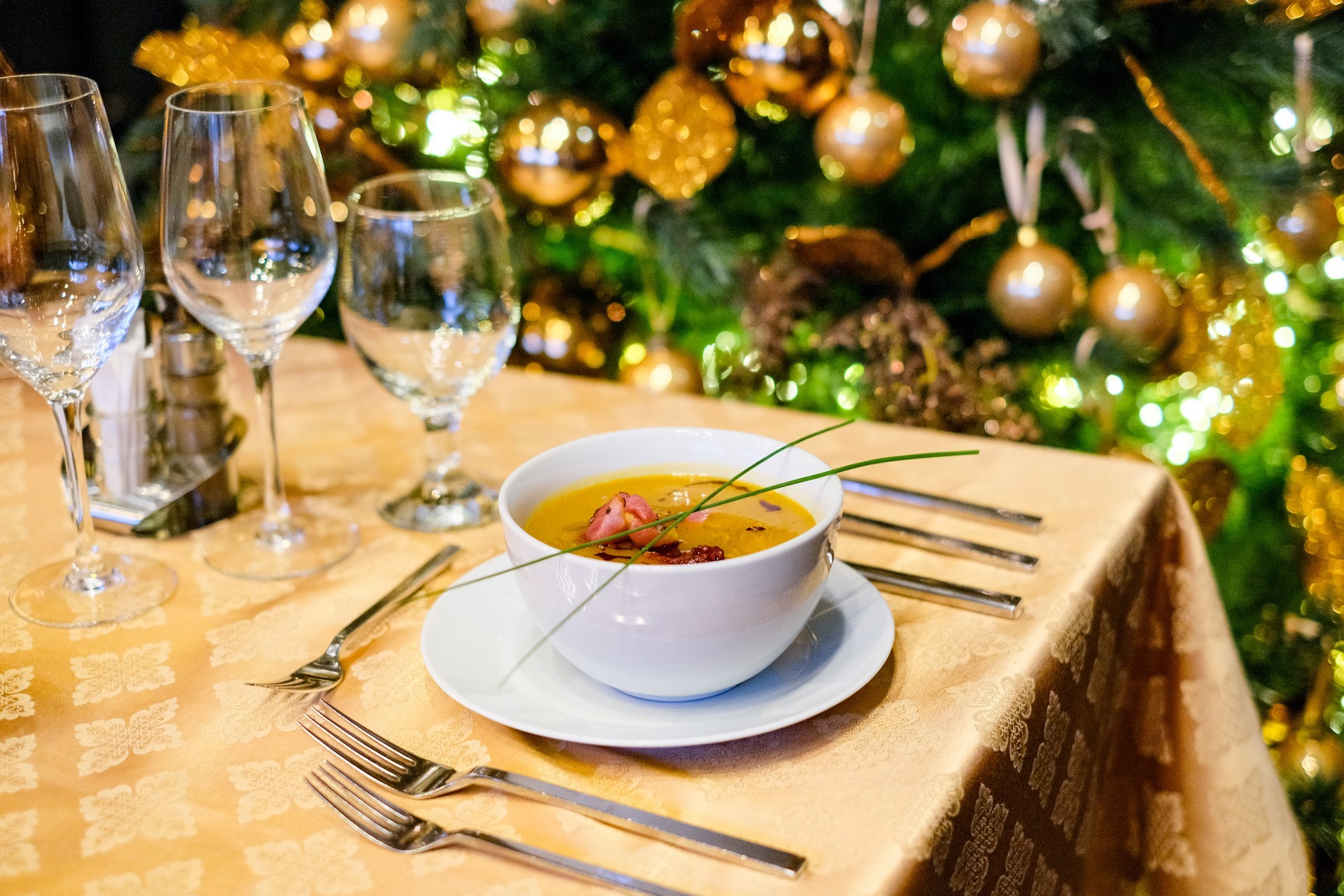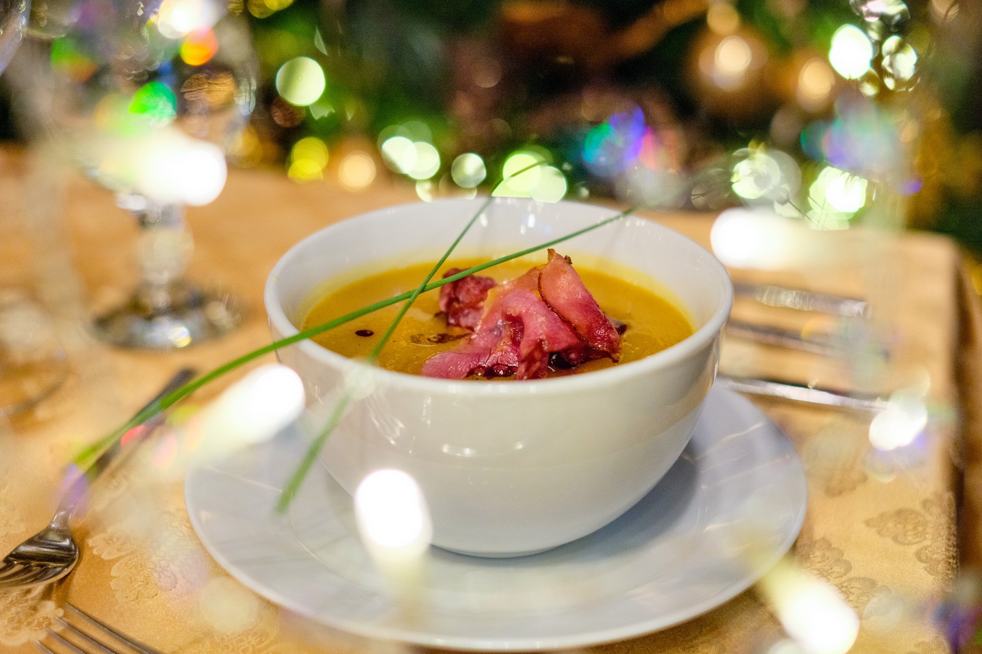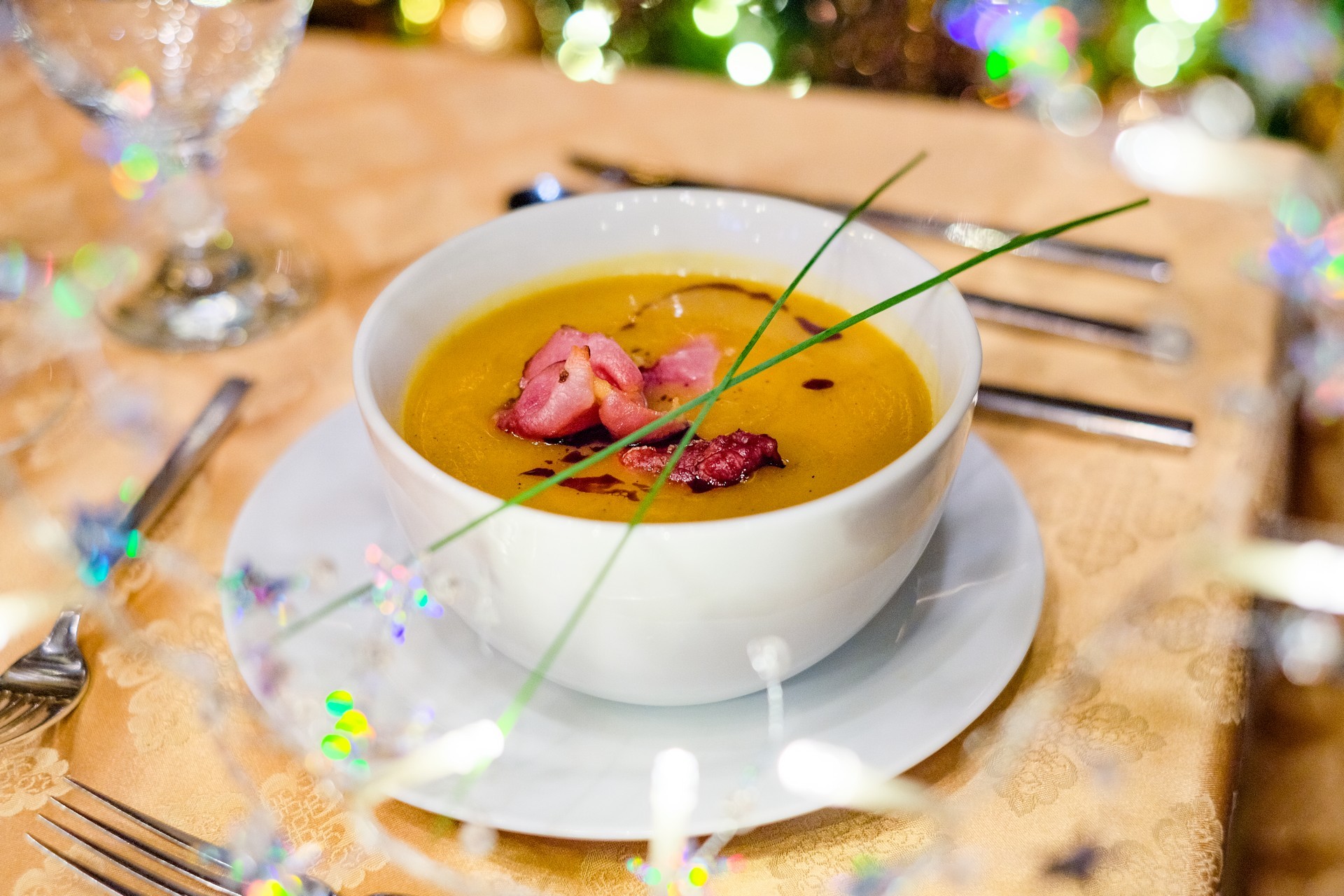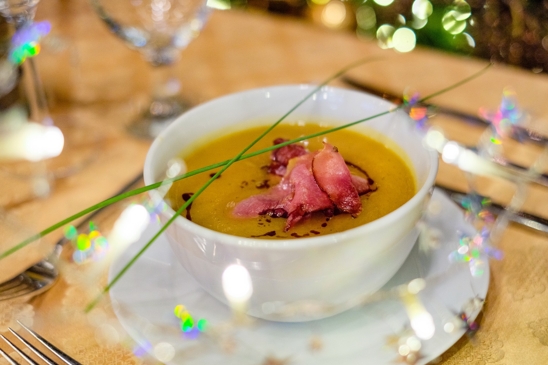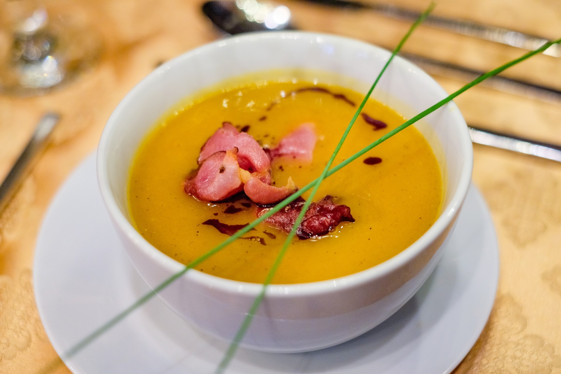 Édesburgonya-krémleves feketeerdeisonka-csipsszel