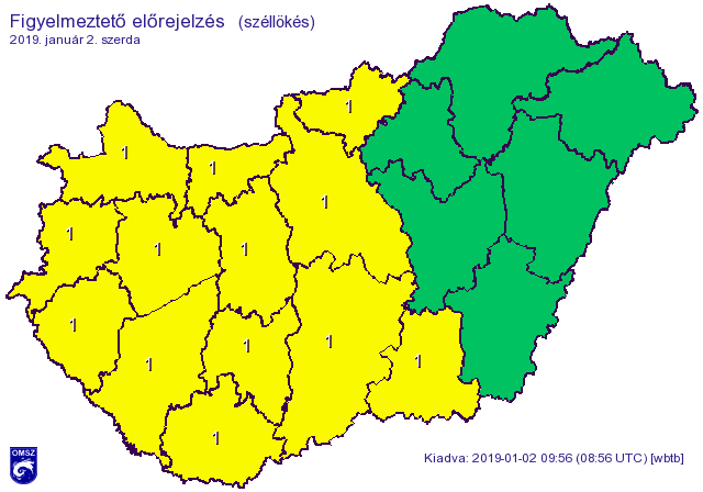 Elsőfokú, citromsárga riasztást adott ki az erős szél veszélye miatt az Országos Meteorológiai Szolgálat január 2-án. Az érintett területeken a széllökések ereje meghaladhatja a 70 kilométer/órát is.