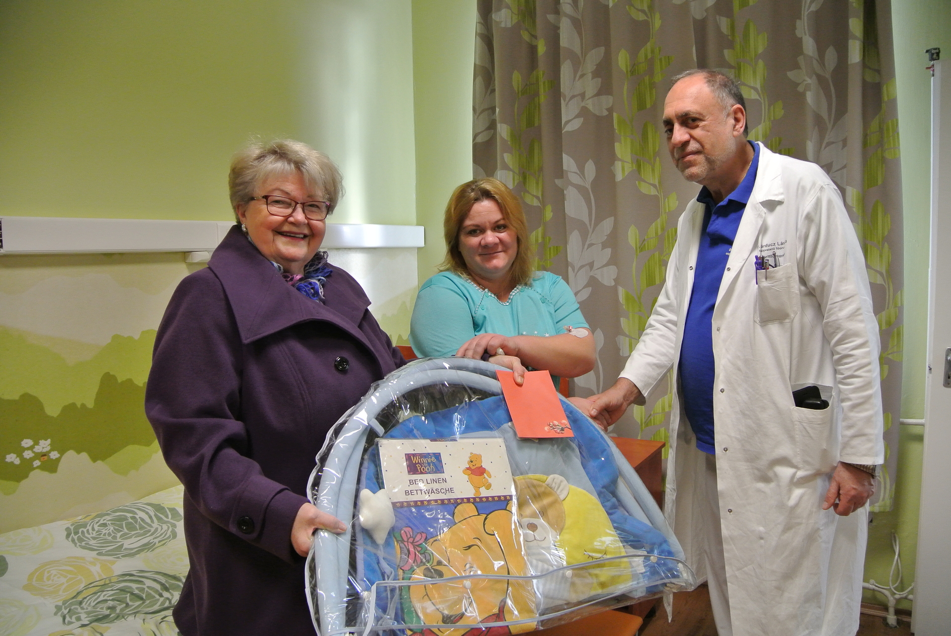 Az édesanyát dr. Párducz László, a kórház szülészeti-nőgyógyászati osztályának osztályvezető főorvosa, valamint Mikus Éva köszöntötte. A fürdővárosi mecénás ezúttal is ajándékcsomaggal és pénzt rejtő borítékkal lepte meg az év első kisdedét.