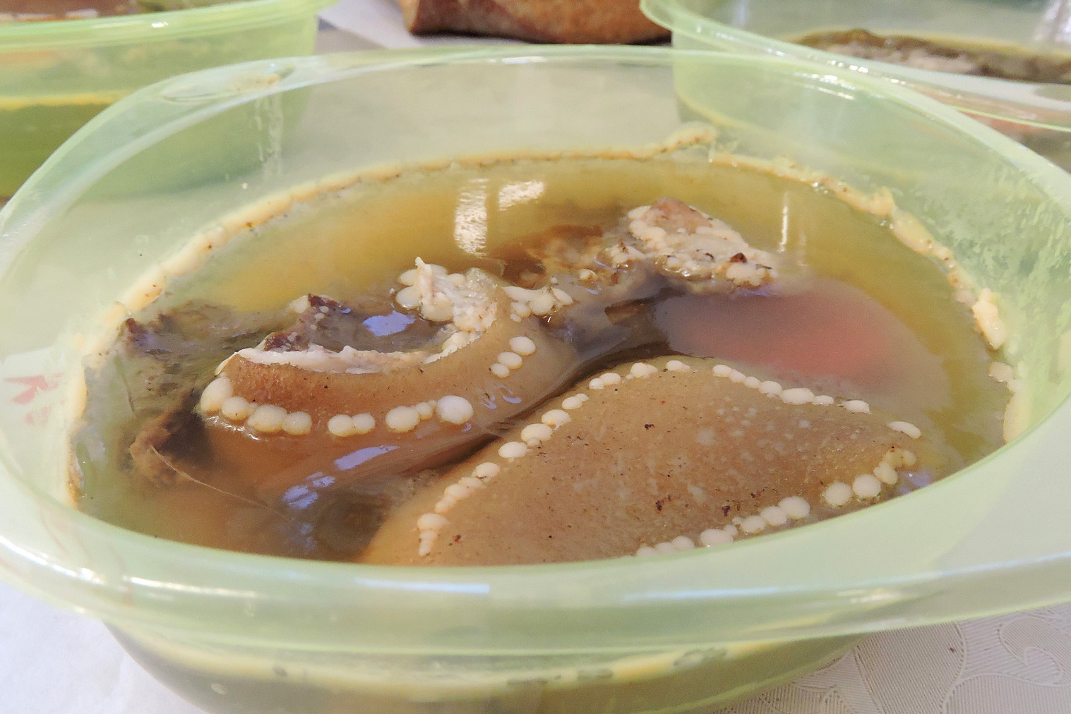 Az árus elmondta, a termék pénteken és vasárnap kapható a piacon. A műanyag dobozokba porciózott kocsonya ára nem emelkedett tavaly óta, idén is 500 forintba kerül.