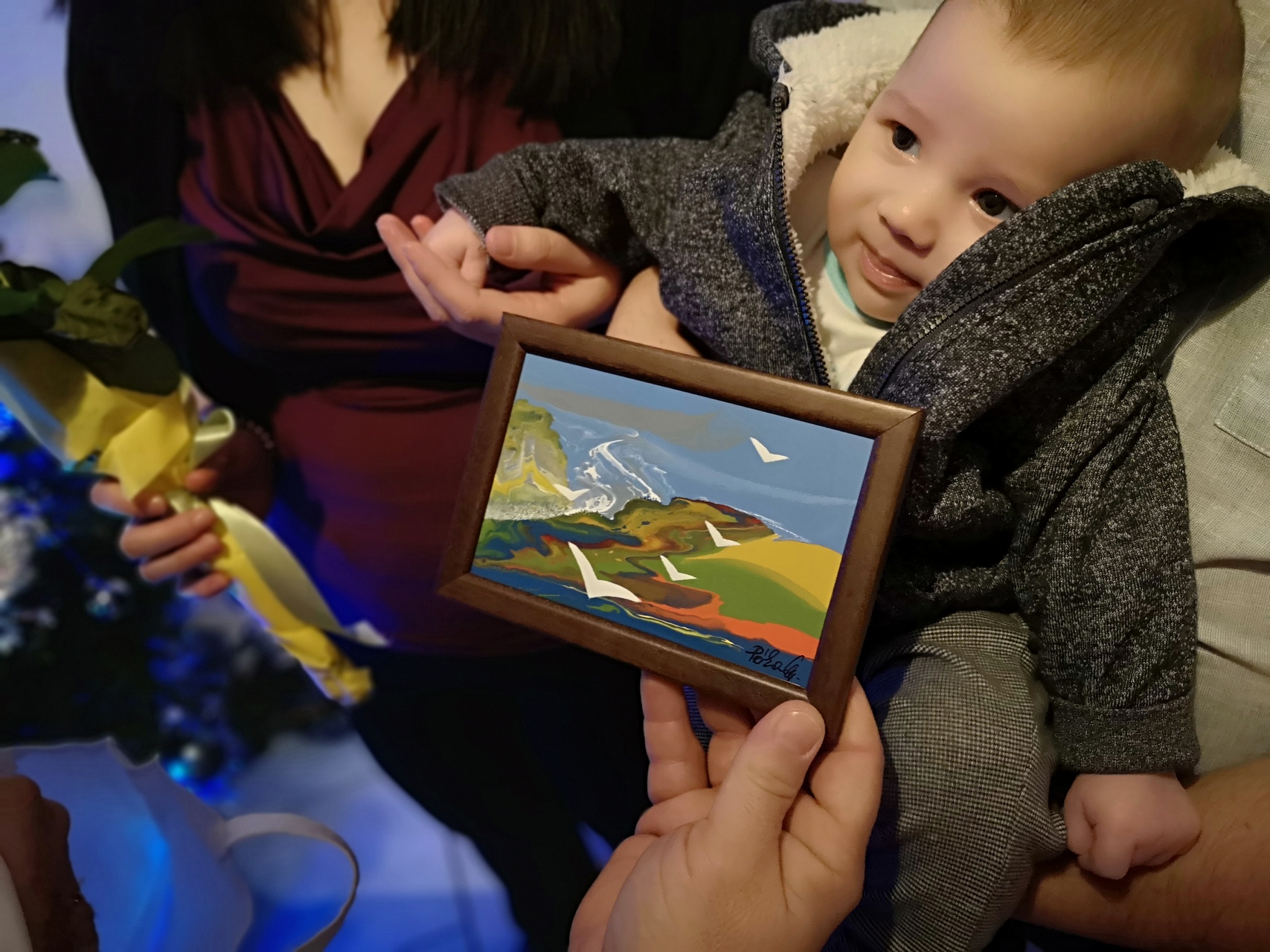 Az életének harmadik hónapjába lépett apróság és édesanyja egy szál virágot, hímzett ruhácskát és Póka György egyik festményét kapta ajándékba.
