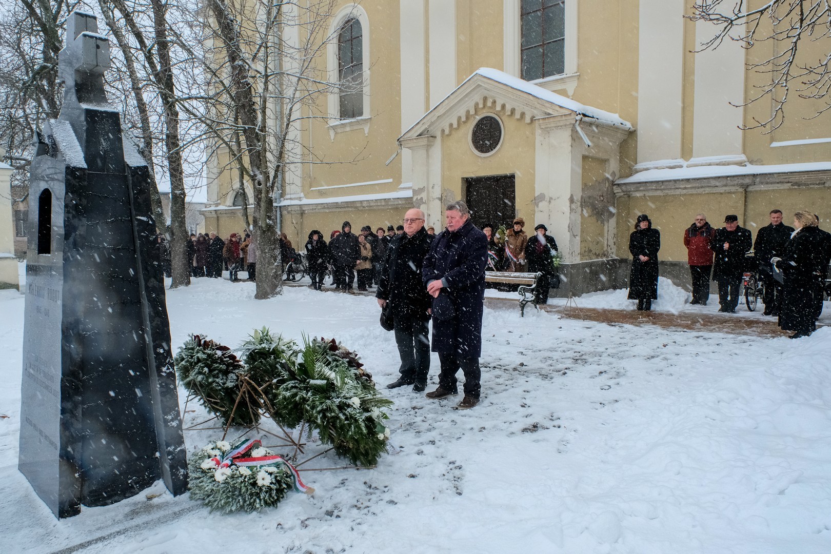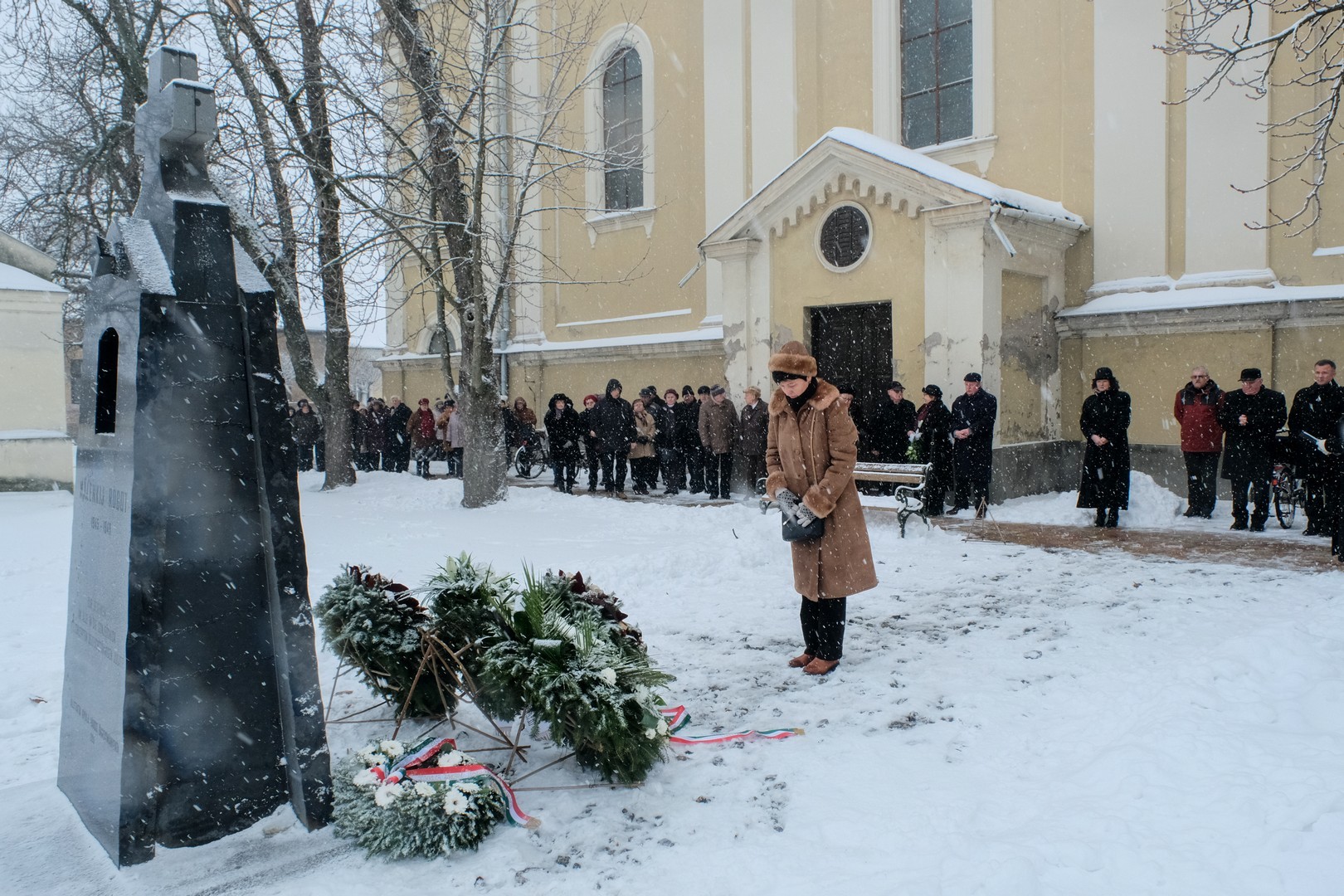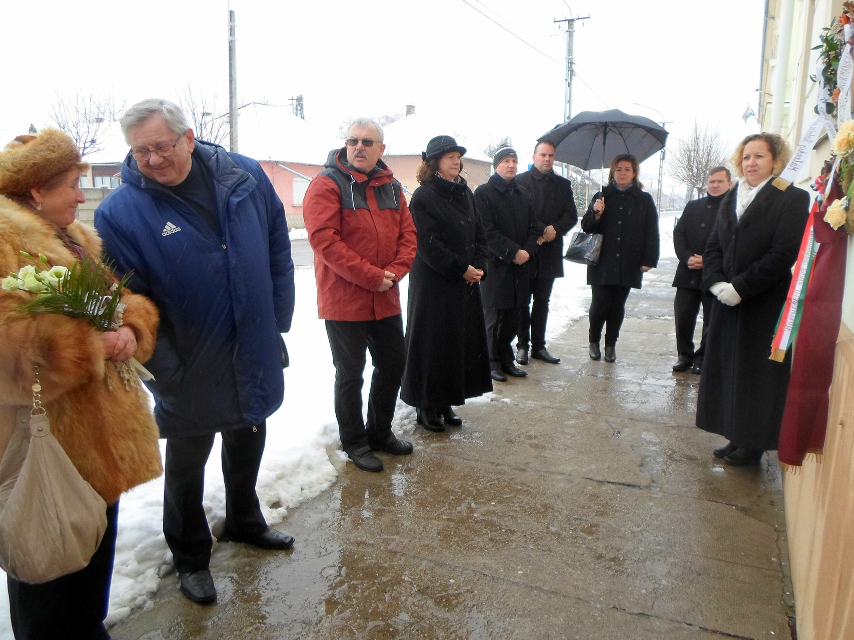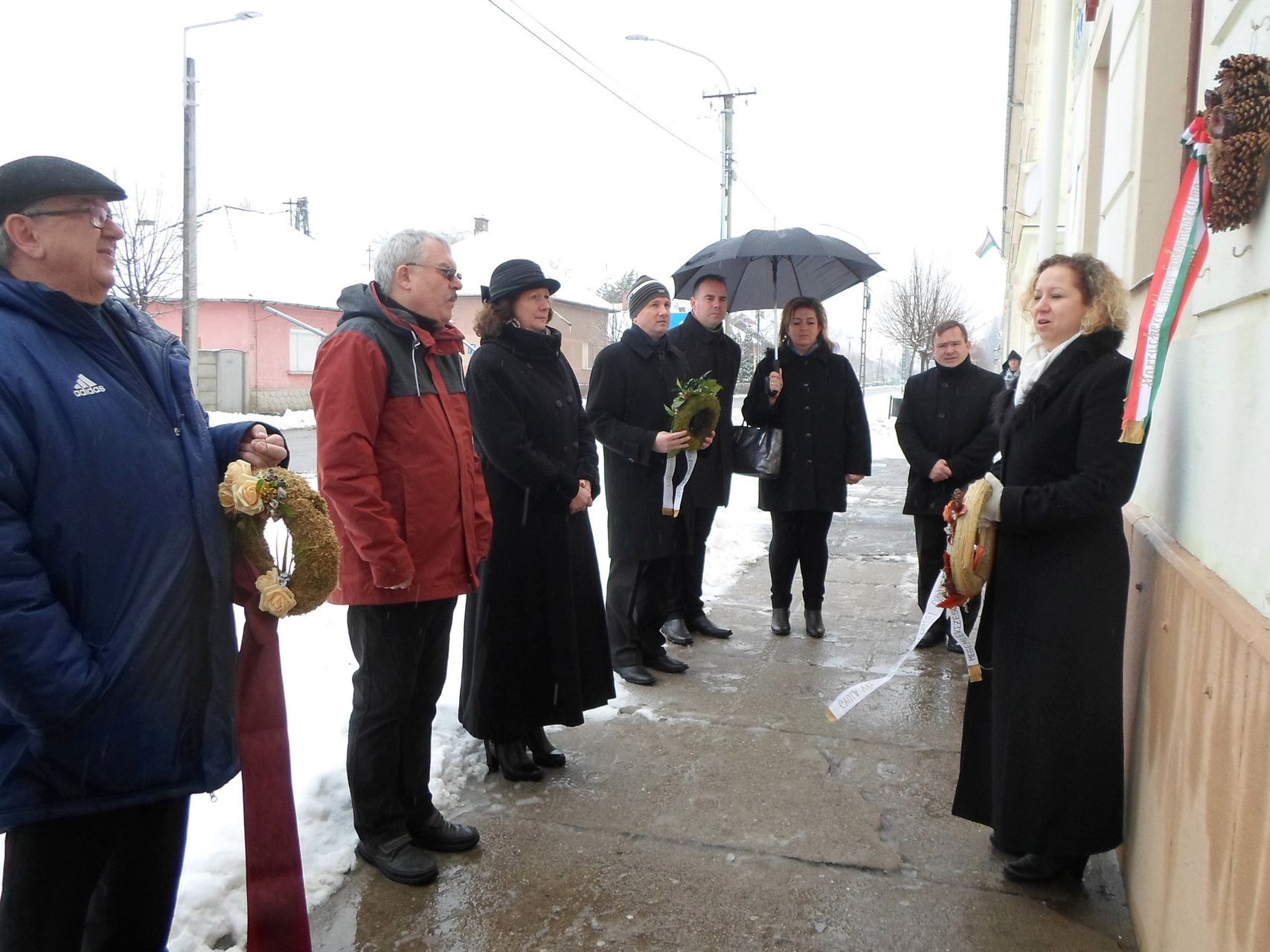 emlékezők Az egykori Huszárlaktanya homlokzatán lévő emléktáblánál
