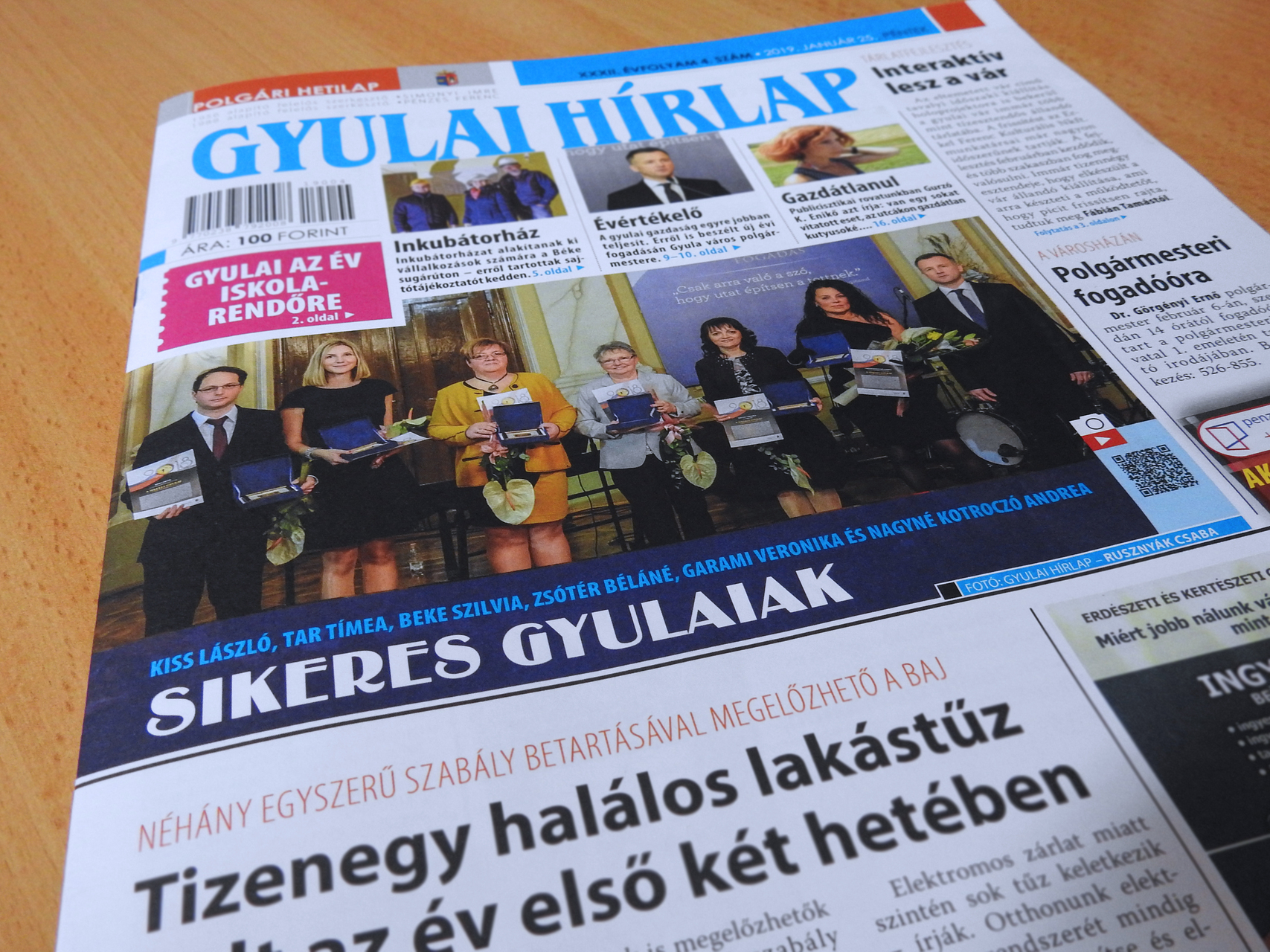 A friss Gyulai Hírlapban többek között arról írunk, hogy hatan vehettek át elismerést Görgényi Ernő polgármester új évi fogadásán. Sikeres Gyulai díjat vehetett át Beke Szilvia, a Gál Ferenc főiskola tanára, Zsótér Béláné, az Erkel Ferenc Alapfokú Művészeti Iskola nyugalmazott munkatársa, Nagyné Kotroczó Andrea, az Erkel Ferenc gimnázium tanára, Garami Veronika kórusvezető, tanár és Kiss László író, az Erkel Ferenc gimnázium tanára. Sikeres Gyulai Diák elismerésben Tar Tímea részesült. Címlapfotónkon a díjazottak láthatók. Interaktív elemekkel egészül ki a gyulai vár állandó kiállítása, a részletekről Fábián Tamás, az Erkel Ferenc Nonprofit Kft. kommunikációs vezetője beszélt lapunknak. A hírlapban arról is beszámolunk, hogy vállalkozói inkubátorházat alakítanak ki a Béke sugárúton. A beruházás várhatóan augusztus végére készül el. Az e heti lapszámban a Gyulai Tankerületi Központ felújításáról, Fenesiné Markovics Nóra iskolarendőr elismeréséről, a Békés megyei x-szemezők kiállításáról, a Gyulahúsnál tartott sajtótúráról és a húszéves Magna Cum Laude februári koncertjéről is hírt adunk. Lapunkból természetesen a sport, a jegyzet és az állandó rovatok sem hiányoznak.