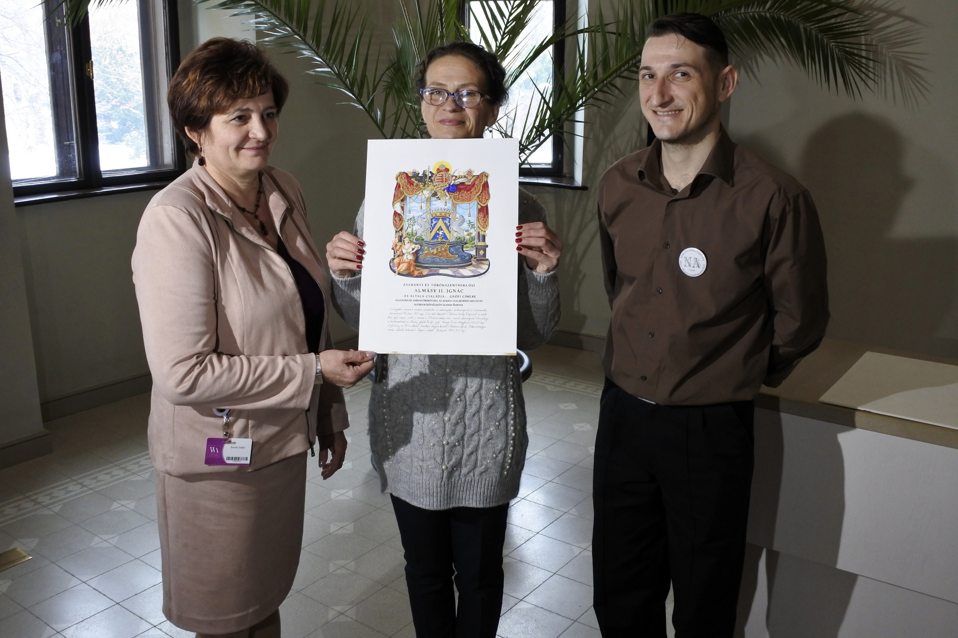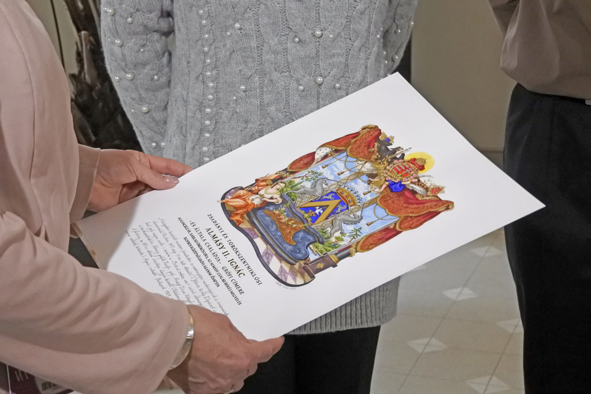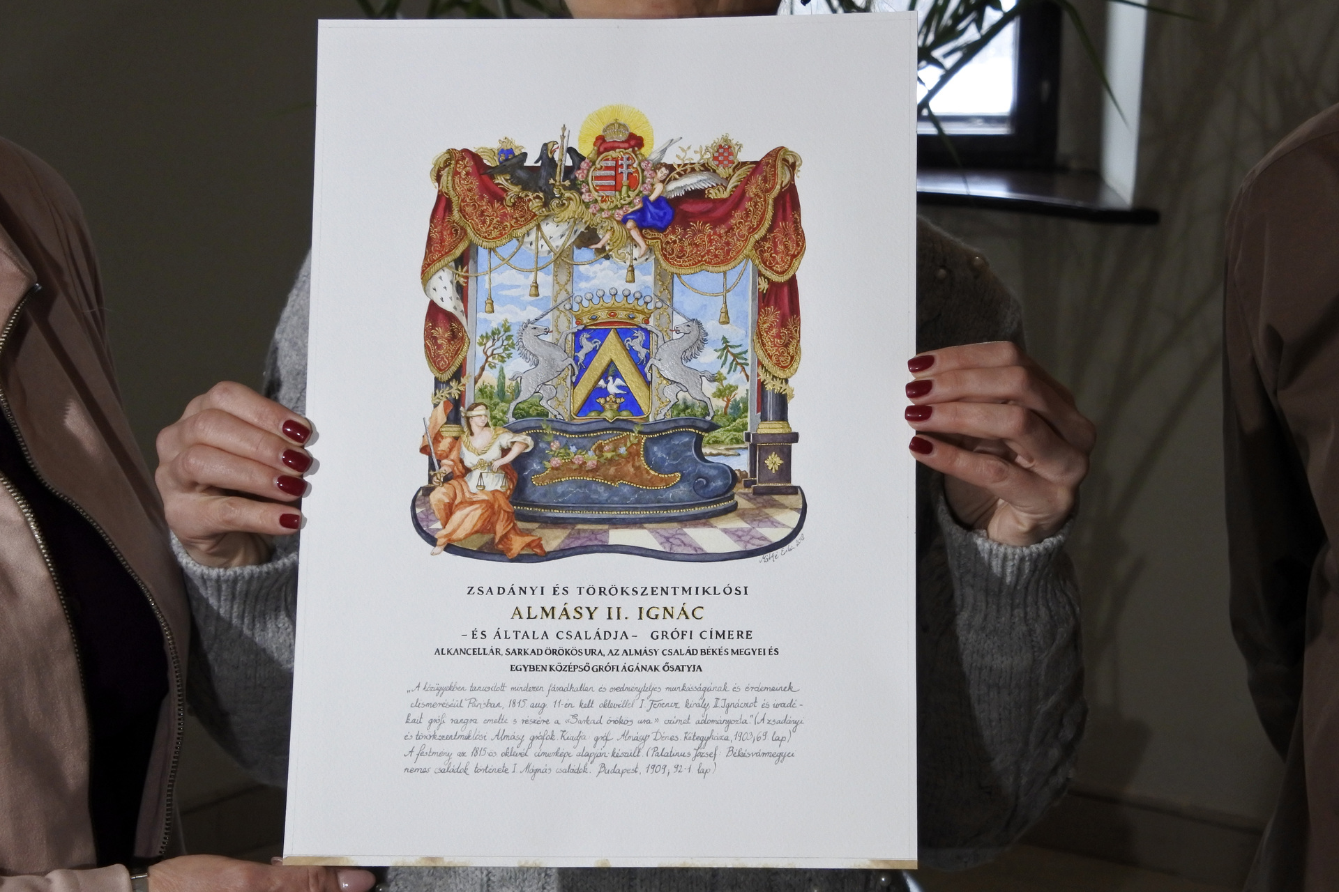 Gyevnár Erika elmondta, hogy az eredeti grófi címer, amelyet Almásy Ignác kapott, nem maradt fent, ezért két forrásból dolgoztak a kép megalkotásakor: az egyik a Palatinus József által publikált Békésvármegyei nemes családok története című kötet volt, a másik pedig Almásy Dénestől származik, aki 1903-ban adott ki egy könyvet a családról.
