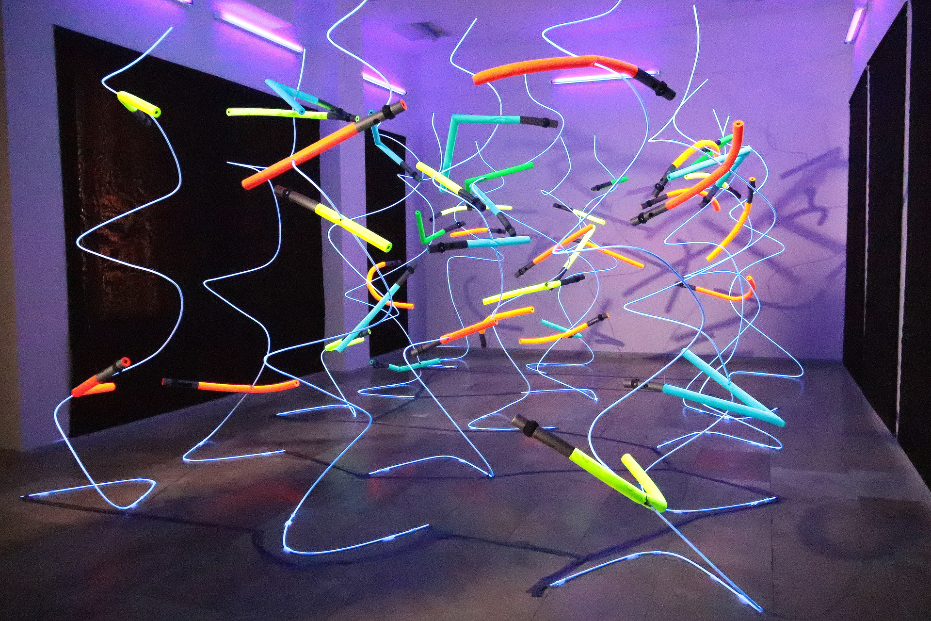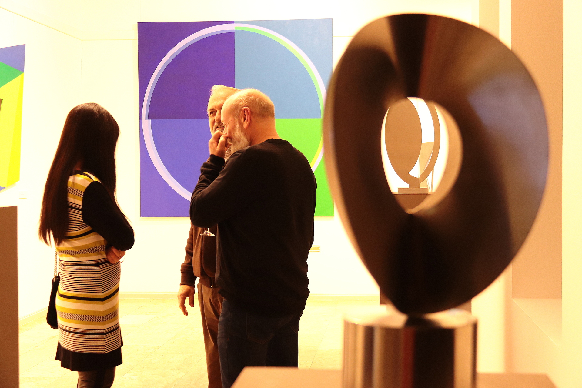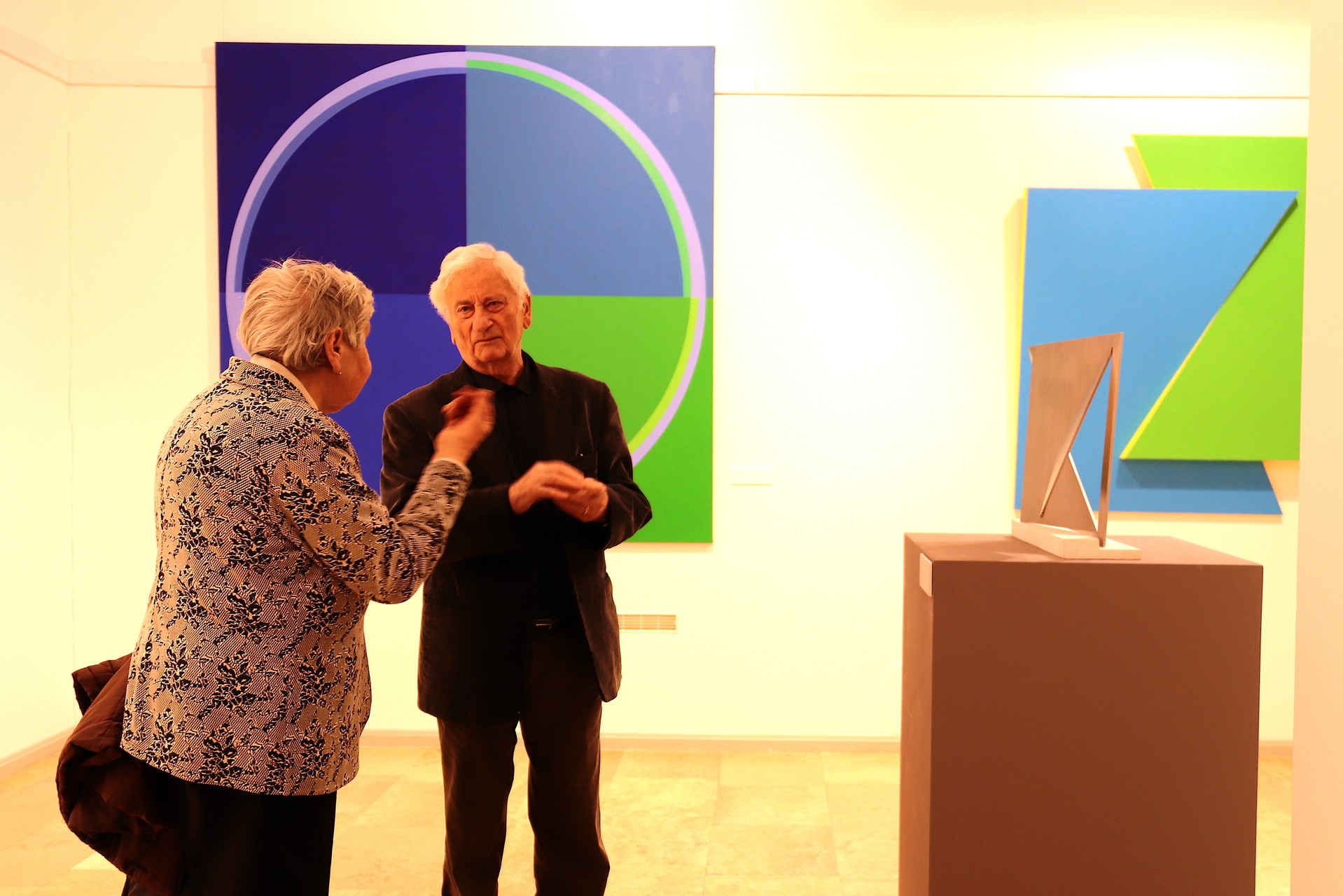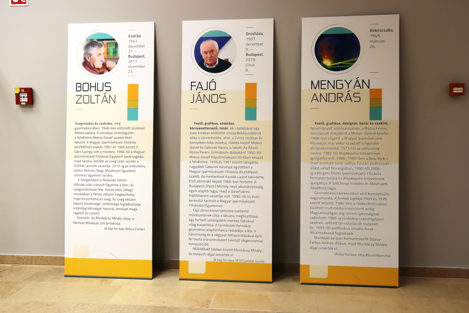 A még élő két kiállító közül a tárlatnyitón egyedül Mengyán András festő, grafikus, formatervező, tanár és szakíró tudott jelen lenni. A művész elmondta, felmenői a városalapító szlovák telepesek közé tartoztak, így szorosan kötődik Békéscsabához. A kiállításra hat táblaképpel és egy interaktív installációval, a Hangkerttel érkezett, amelybe 40 hanggenerátort épített be hangszóróval és infravörös érzékelőkkel, így zenét is lehet vele komponálni.
