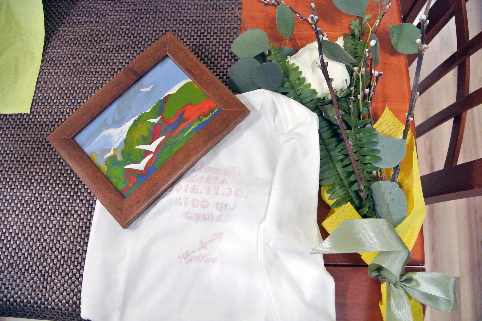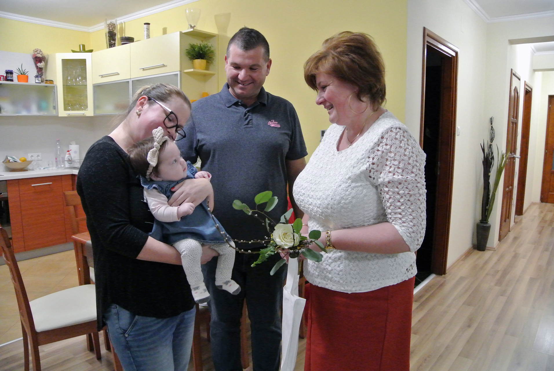 Bányai Grétát és családját köszöntötte a gyulai Babaruha program keretében Kiss Tamásné február 18-án. A képviselő egy Póka György-festménnyel, virággal és névre szóló babaruhával ajándékozta meg a családot.