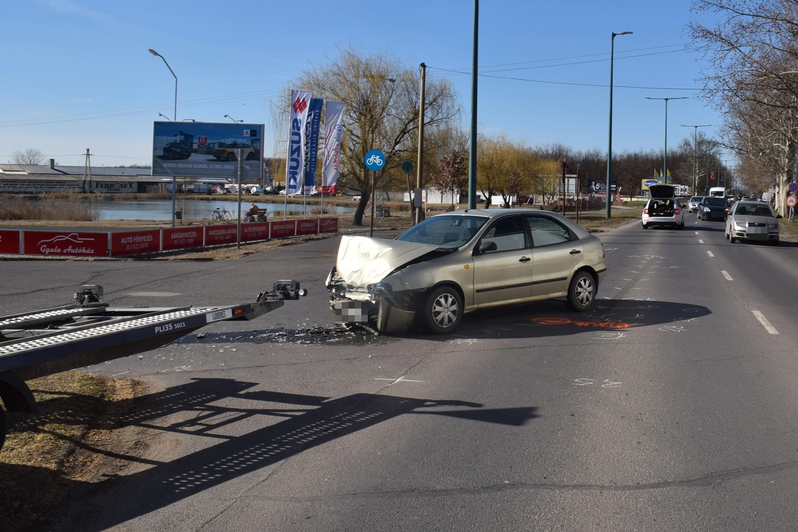 Összeütközött két személygépkocsi március 6-án, Gyulán.