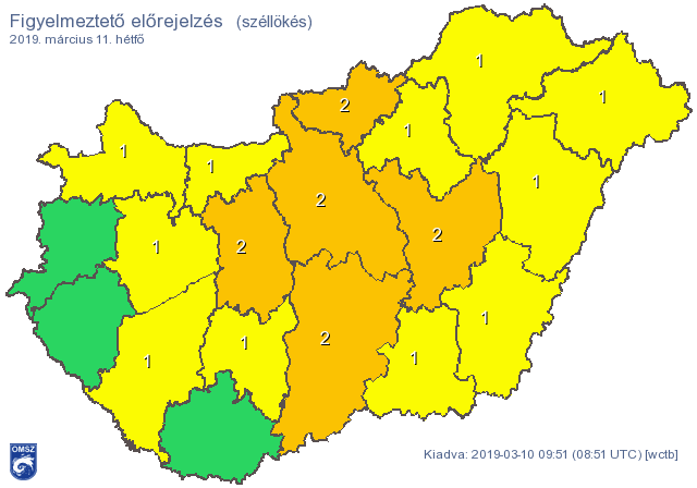 Késő estig a délnyugati szelet nagy területen erős, néhol viharos (50–70 km/h) lökések kísérik. Késő estétől egy hidegfront hatására egyre nagyobb térségben viharos (70–90 km/h) szélrohamok társulnak a nyugati, északnyugati szélhez. Néhol 95 km/h körüli széllökések is valószínűek, erre leginkább Fejér, Pest, Nógrád, Jász-Nagykun-Szolnok és Bács-Kiskun megyében van esély – írja a met.hu.