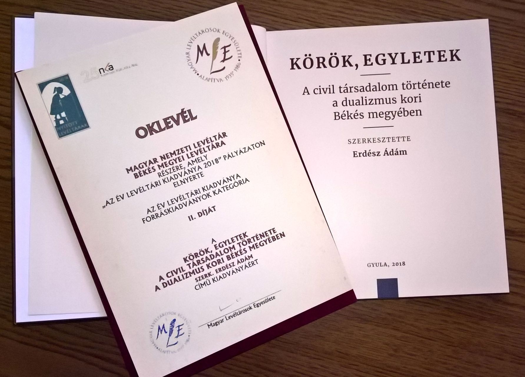 Az Év levéltári kiadványa díjat minden évben kiosztja a Magyar Levéltárosok Egyesülete, forráskiadvány kategóriában viszont először kapta meg az elismerést az MNL Békés Megyei Levéltára, olvasható az archívum honlapján. Az intézmény a kategória második helyezettjeként vehette át 2019. március 7-én oklevelét a Körök, egyletek – A civil társdalom története a dualizmus kori Békés megyében című albumért, amelynek tavalyi megjelenéséről lapunk is beszámolt.
