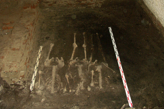 5 évvel ezelőtt, 2014. áprilisában a gyulai Almásy-kastély felújítási munkálatai során izgalmas régészeti leletre bukkantak a kivitelezést végző munkások: a barokk pince lejáratának végén három, fej nélküli csontvázat találtak. Dr. Gere László, a Lechner Lajos Tudásközpont régésze munkatársaival a temetkezést feltárta, dokumentálta, a csontokat megtisztították. A leletek vizsgálata egy későbbi időpontban vált esedékessé, mert a kastély feltárása továbbfolytatódott. Az akkori ismereteik szerint a maradványok a török kor végére datálhatóak, feltehetőleg a XVII. század végéről származtak. Az előzetes szakértői vizsgálatok alapján megállapítást nyert, hogy a három férfi negyvenéves kora körül hunyt el, ám azt nem tudni, milyen nemzetiségűek lehettek. A csontvázakon szabad szemmel látható külsérelmi nyomok nem találhatók, és a sír későbbi rongálására utaló nyomok nem láthatók. Nagy valószínűséggel nem szabályos temetés során helyezték el sírjukba az elhunytakat, ugyanis koporsó, ruházat vagy bármely más használati tárgy maradványa nem került elő. A következtetések szerint a három férfi a kor szokásainak megfelelően lefejezés áldozata lett.