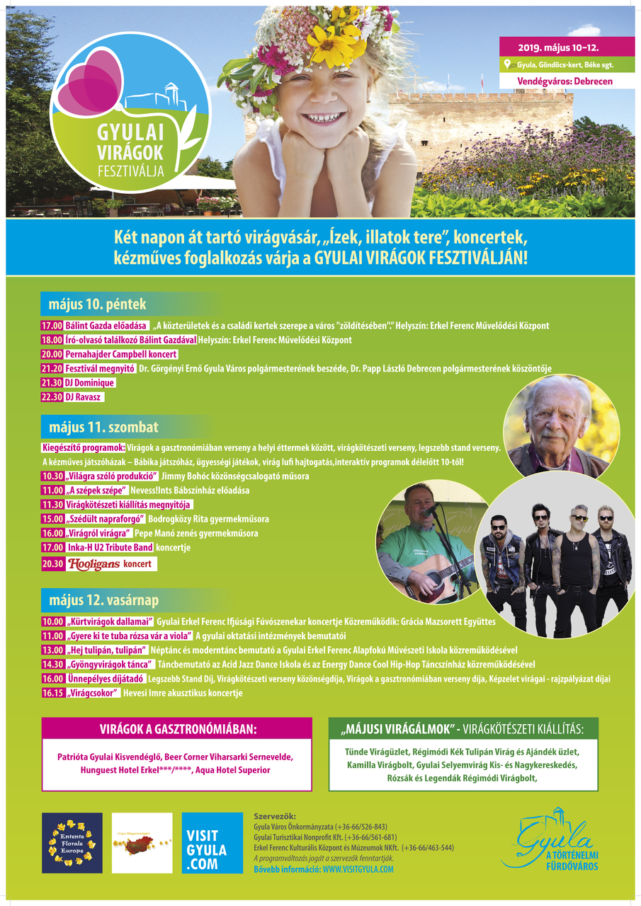A Gyulai Virágok Fesztiválja ma, szombaton 10.30 órától egy „Világra szóló produkcióval” vár Jimmy bohóccal. A közönségcsalogató műsor után 11 órától A szépek szépe címmel a Nevess! Ints! Bábszínház adja elő műsorát a Göndöcs-kertben. Virágkötészeti kiállítás nyílik 11.30-kor. Bodrogközy Rita gyermekműsorral várja a családokat 15 órától. Pepe Manó zenés műsora 16 órától kezdődik. Inka-H U2 Tribute Band-koncert 17 órakor kezdődik. Az esti fellépő a Hooligans. Koncertjük 20.30-kor kezdődik.