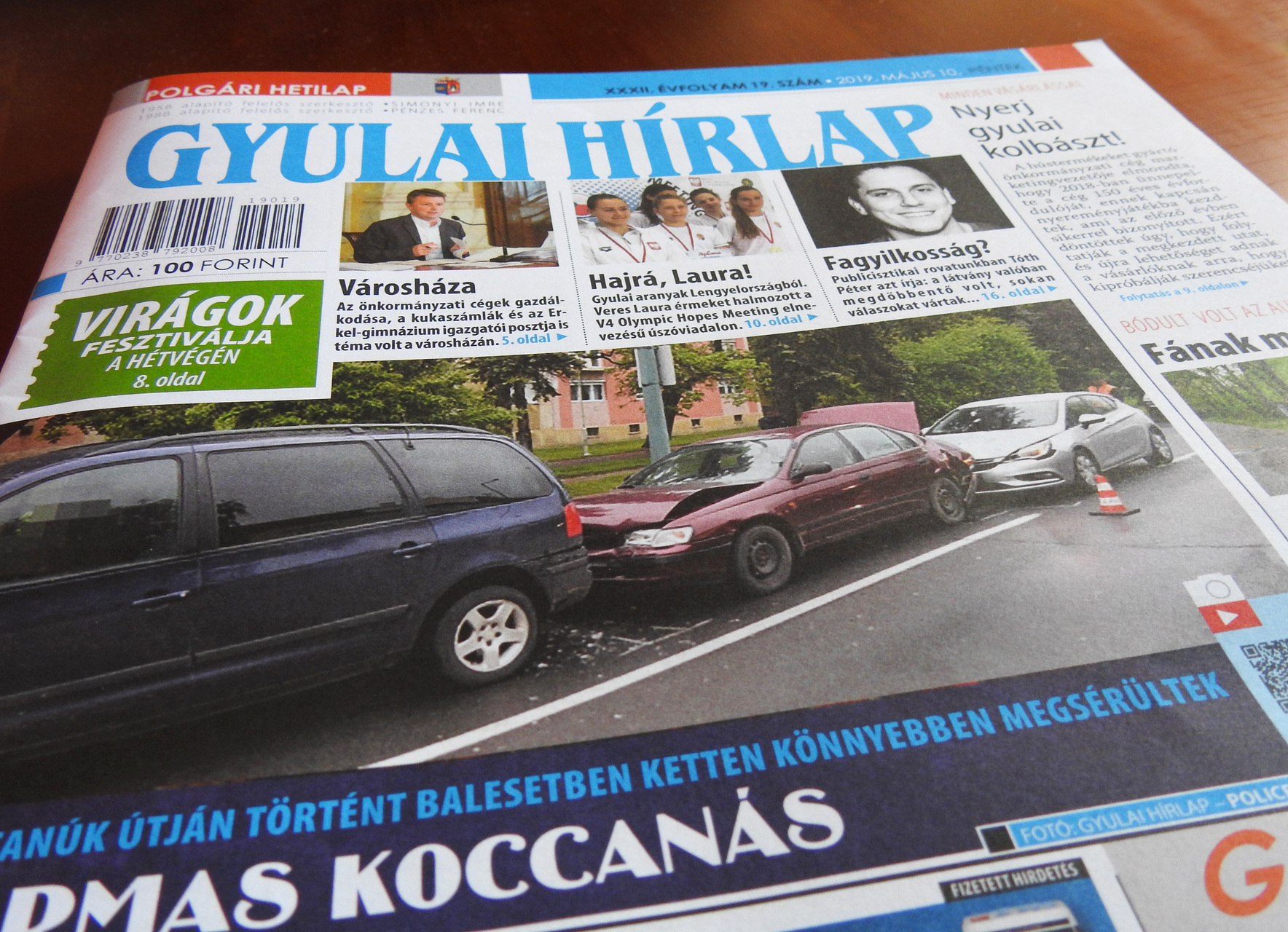 A friss Gyulai Hírlapban két fürdővárosi balesetről is beszámolunk: az egyik a település külterületén, a másik a Vértanúk útján történt. A belvárosban három személyautó koccant egymásnak, címlapunkon a baleset helyszínén készült fotó látható. Lapunkban arról is hírt adunk, hogy folytatódik a Gyulahús Kft. tavaly indított nyereményjátéka. A résztvevőknek június 30-ig kell feltölteniük a cég honlapjára a vásárlást igazoló blokkjukon szereplő kódot. E heti lapszámunkban arról is írunk, hogy négy gyulai tűzoltó vehetett át elismerést a Békés Megyei Katasztrófavédelmi Igazgatóság Szent Flórián-nap alkalmából szervezett ünnepségén. Emellett cikket közlünk a gyulai képviselő-testület legutóbbi üléséről, a Gyulai Virágok Fesztiváljáról, a Békés Takarékszövetkezet adományáról, az EDÜ-höz kapcsoló családi sportnapról és a Pándy-tagkórház galériájában nyílt kiállításról. Lapunkból természetesen ezúttal sem hiányozhatnak az állandó rovatok, a sport és a jegyzet.