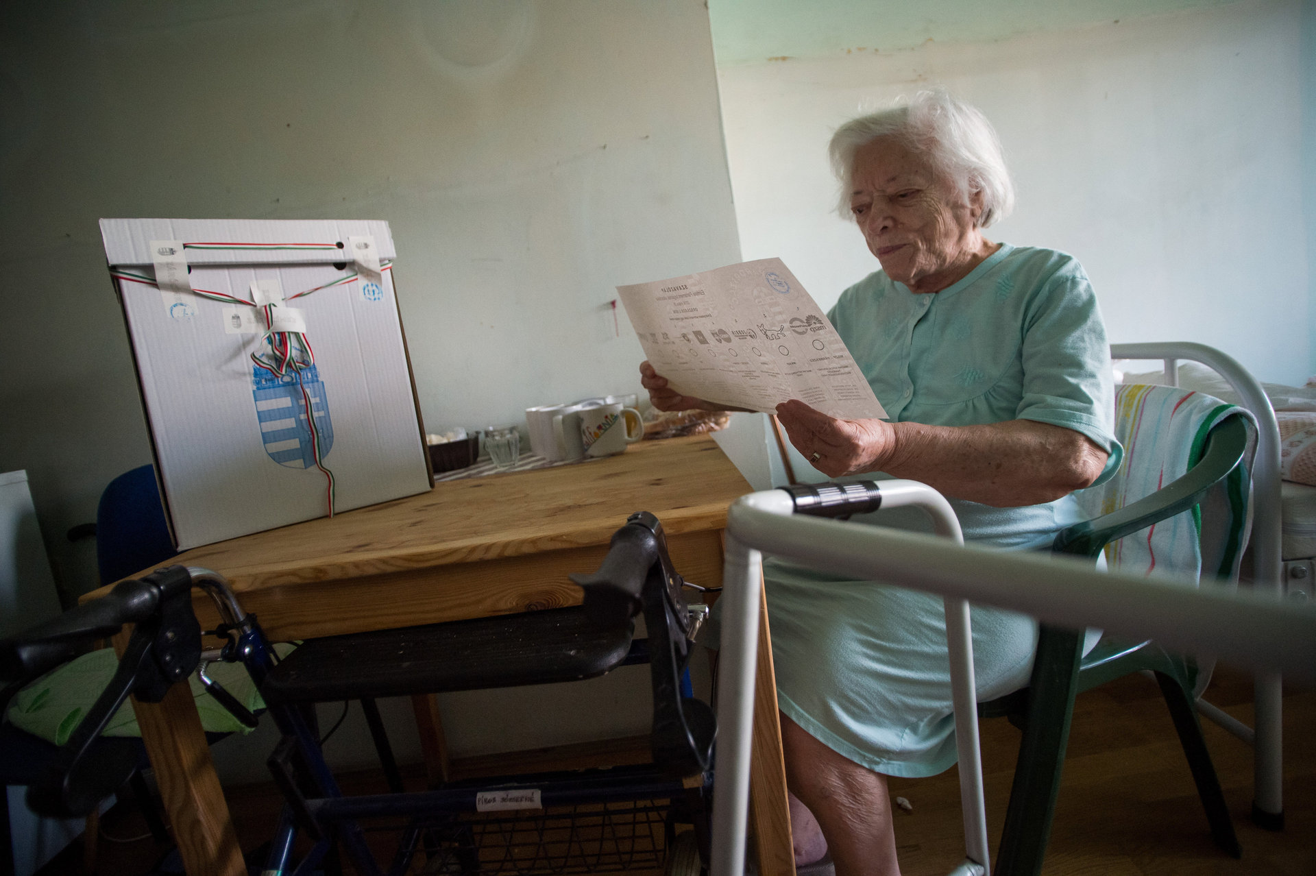 Nagyné Szakál Mária a szavazólapot nézi, mielőtt leadja szavazatát az európai parlamenti választáson mozgóurnába a főváros VII. kerületében egy idősek otthonában 2019. május 26-án