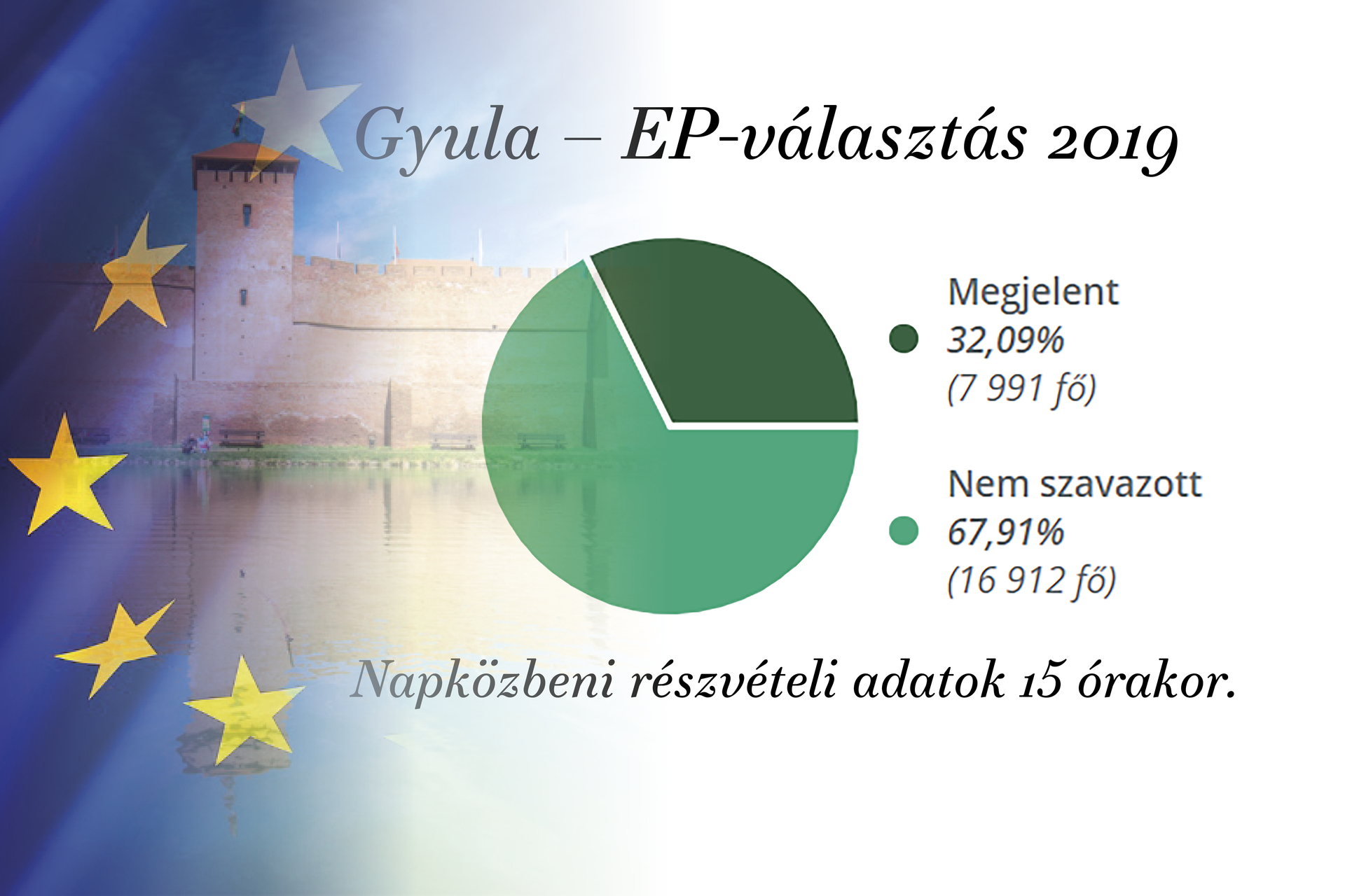 Az Európai Parlament (EP) magyar tagjainak választásán vasárnap 15 óráig a szavazásra jogosultak 30,52 százaléka adta le szavazatát a magyarországi szavazókörökben a Nemzeti Választási Iroda (NVI) adatai szerint. Békés megyében 28,5 százalékos volt a részvételi arány, ami 80 944 szavazót jelent. Gyula város szavazói még mindig az országos átlag felett teljesítettek: 32,09%, 7991 voks.