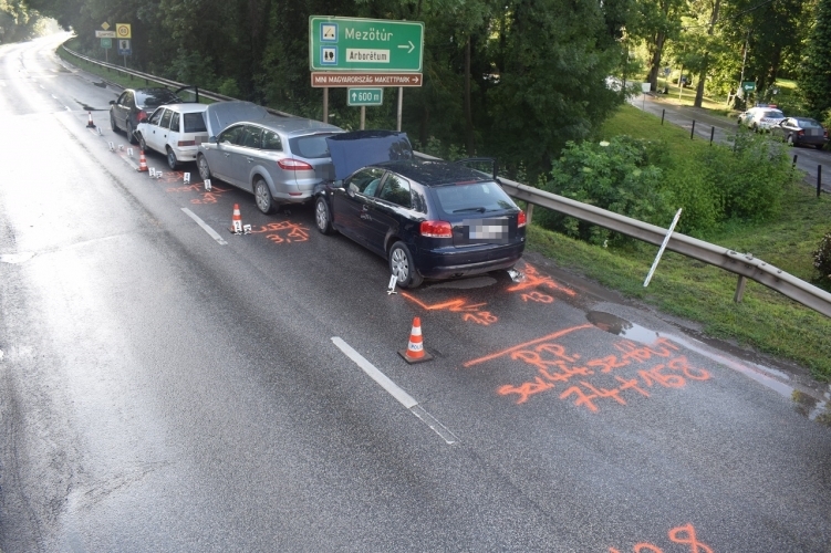 Szarvason, a 44-es számú főúton délután negyed hat körül összeütközött négy azonos irányba haladó személygépkocsi. Az egyik autó utasa könnyű sérülést szenvedett.