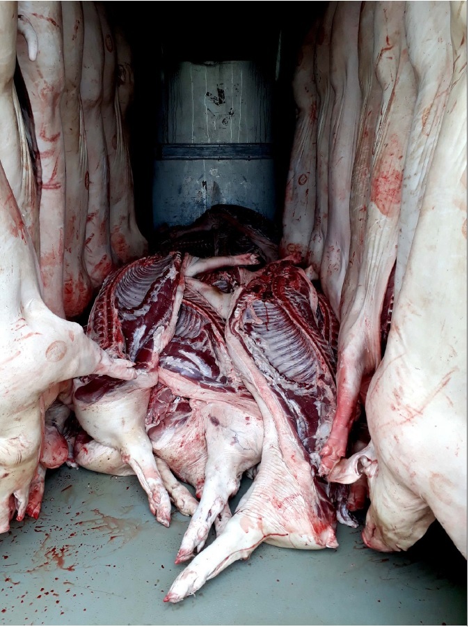 A másik, román teherautó 2 925 kilogramm húsárut vitt. A raktér belső hőmérsékletjelzője itt sem volt megfelelő, 0–7 Celsius-fok helyett 24 fokot mutatott. A félsertések egy részét felfüggesztve, másik részét pedig a véres padlón szállították, a hústermékek igazolásán nem szerepelt a hatósági állatorvos neve, bélyegzőlenyomata, aláírása.