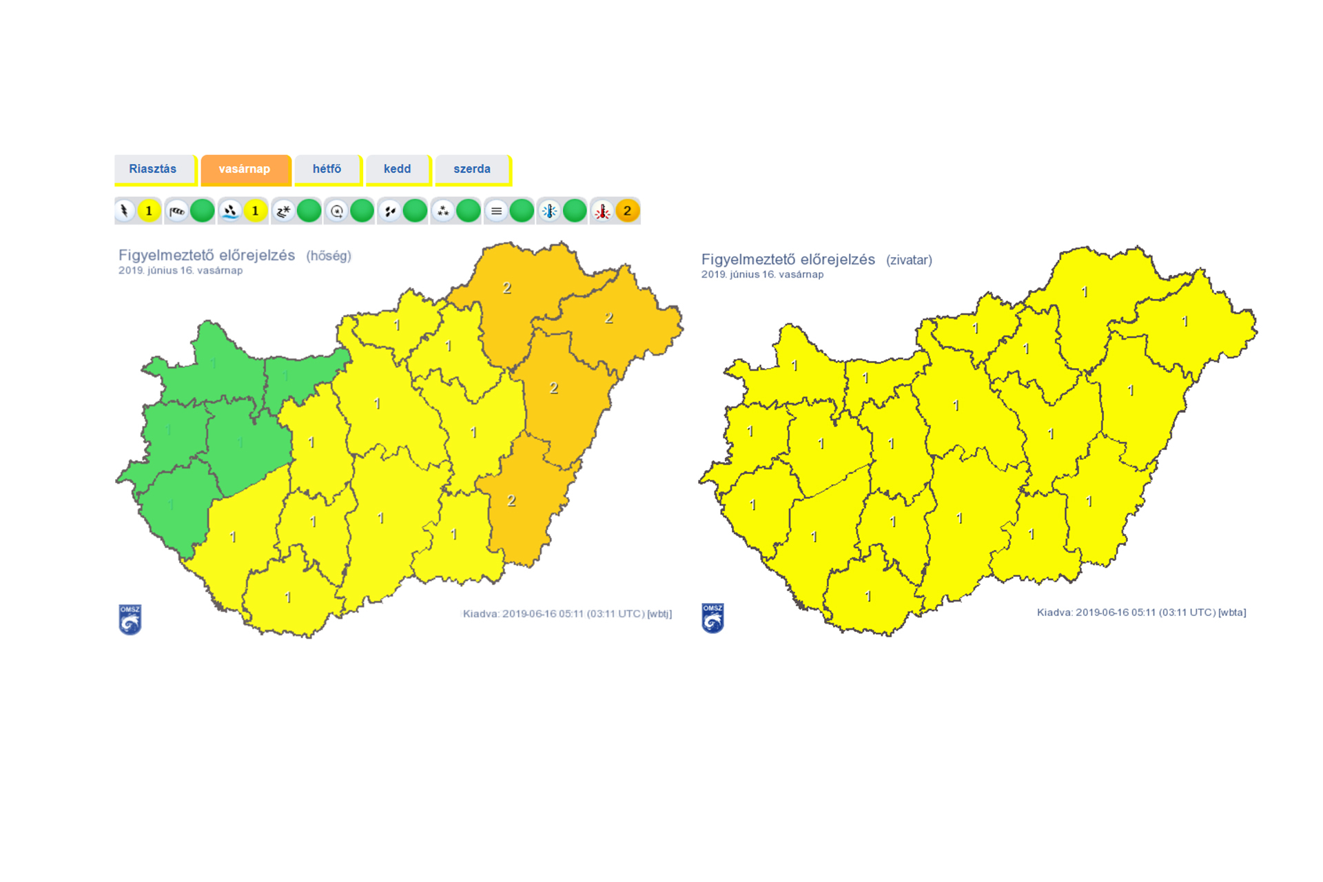 Délelőtt még csak kis eséllyel, majd a déli óráktól többfelé várható zivatar, leghamarabb egy DNy-ÉK-i tengely mentén. A zivatarokhoz helyenként felhőszakadás (rövid idő alatt 20–50 mm csapadék), jégeső (akár 2 cm-t meghaladó átmérővel), illetve 60–70, egy-egy helyen 80–100 km/h-s szélrohamok társulhatnak. Heves zivatarok kiemeltebb eséllyel a középső országrészben és az Alföldön fordulhatnak elő a délutáni, kora esti órákban, de kialakulásukhoz máshol is elégségesek a feltételek.