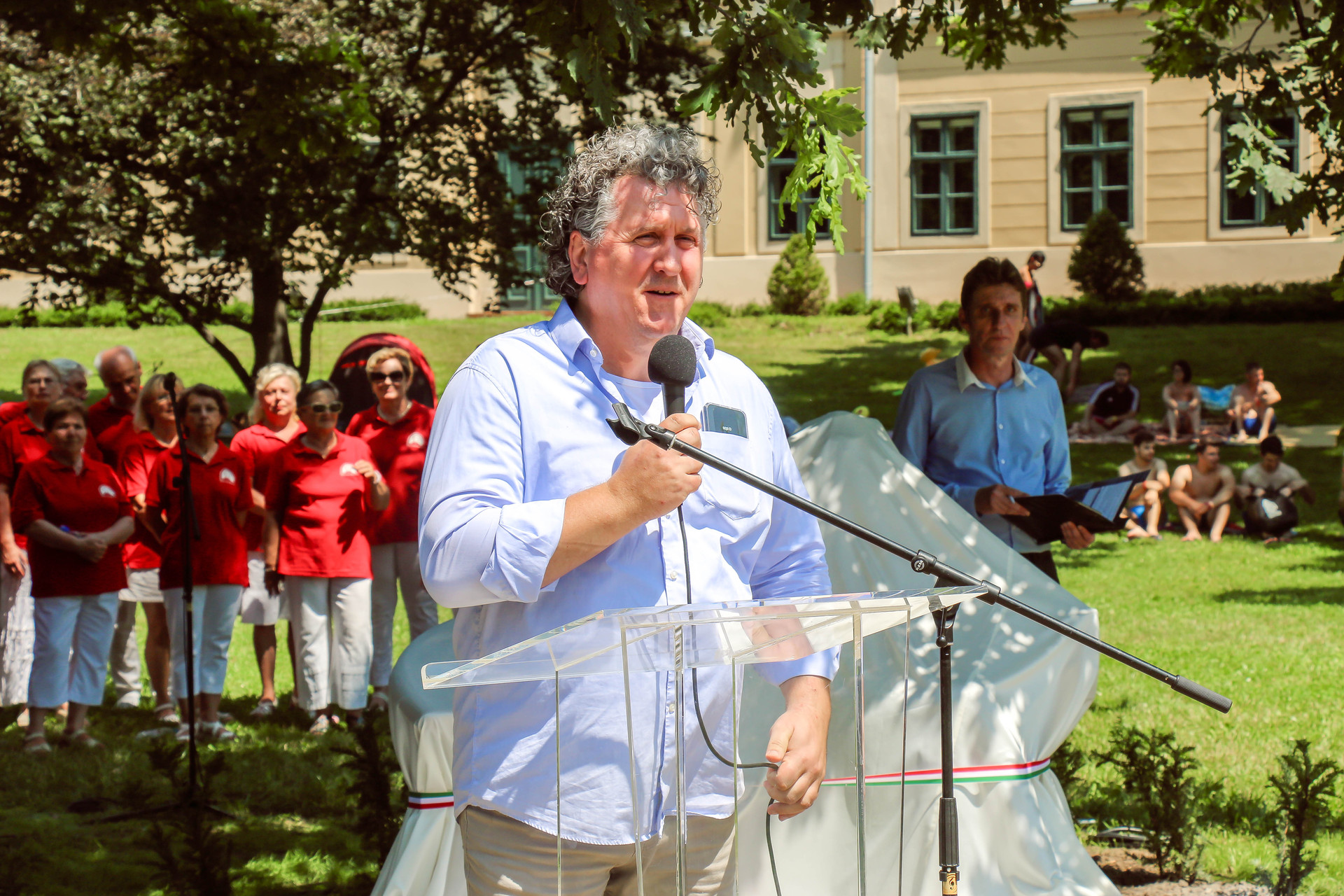 Somogyváry Ákos úgy vélte, a szoboravató az ünnepségsorozat megkoronázása. Ezt Kun Miklósnak, a Gyulai Várfürdő igazgatójának köszönte meg, akit így jellemzett: nagy civil kurázsiról tett tanúbizonyságot akkor, amikor kezdeményezte és végigvitte a projekt rendezését. Említést tett Szőke Sándor szobrászművészről is, aki első pillanattól kezdve ráérzett arra, milyen kompozíciót szeretnének látni a gyulaiak a várfürdő parkjában. Erkel-leszármazottként pedig azok irányába fogalmazta meg köszöntő szavait, akiknek fontos az életmű ápolása.