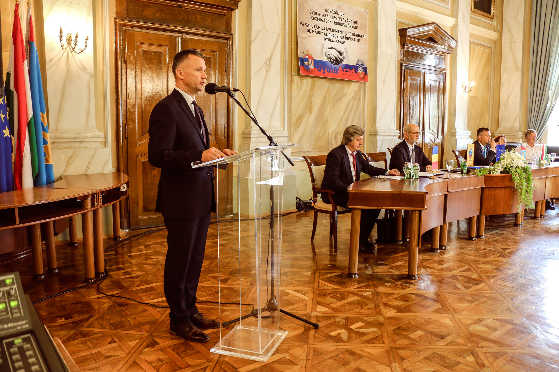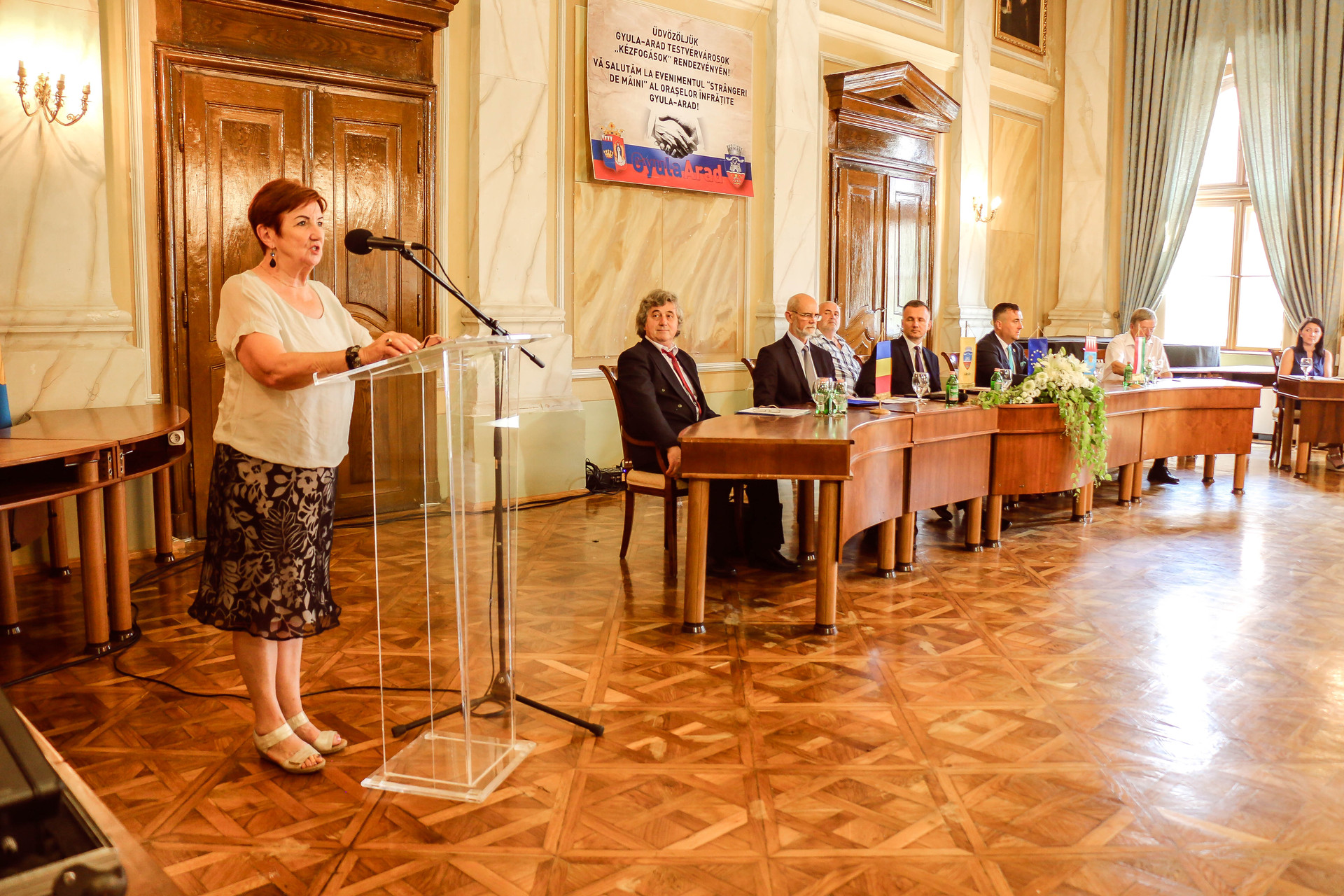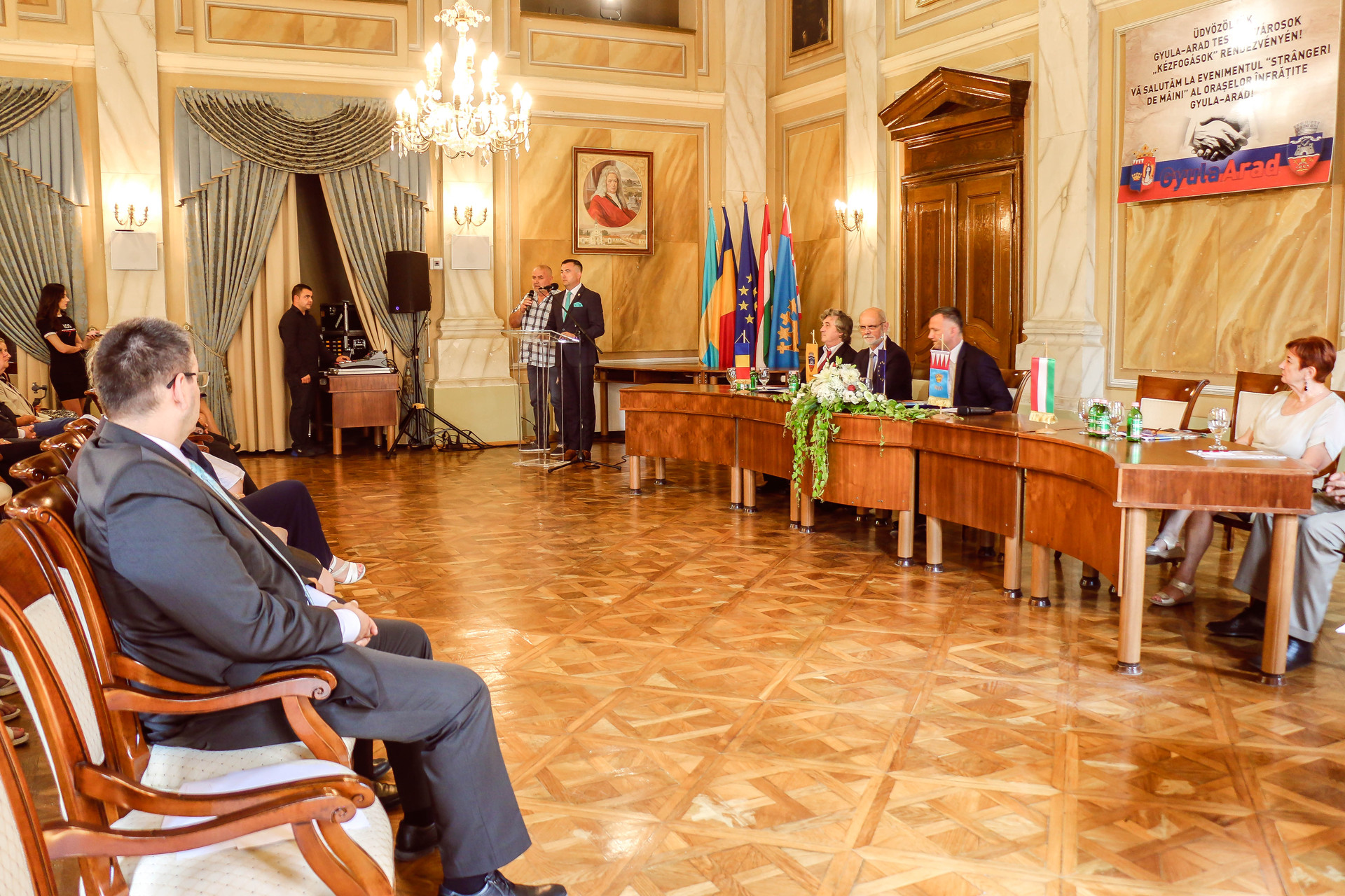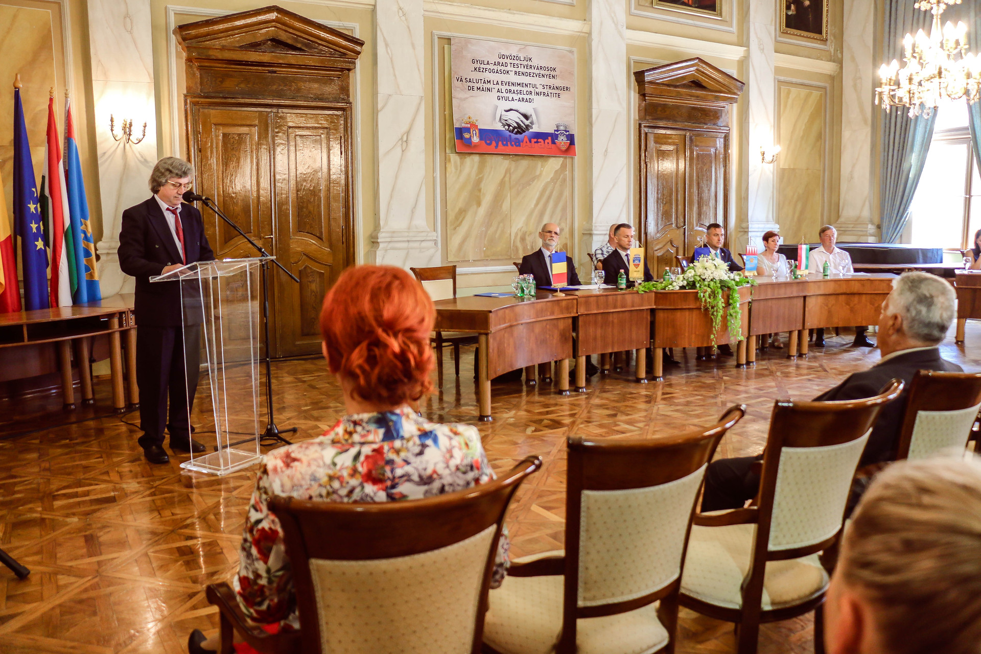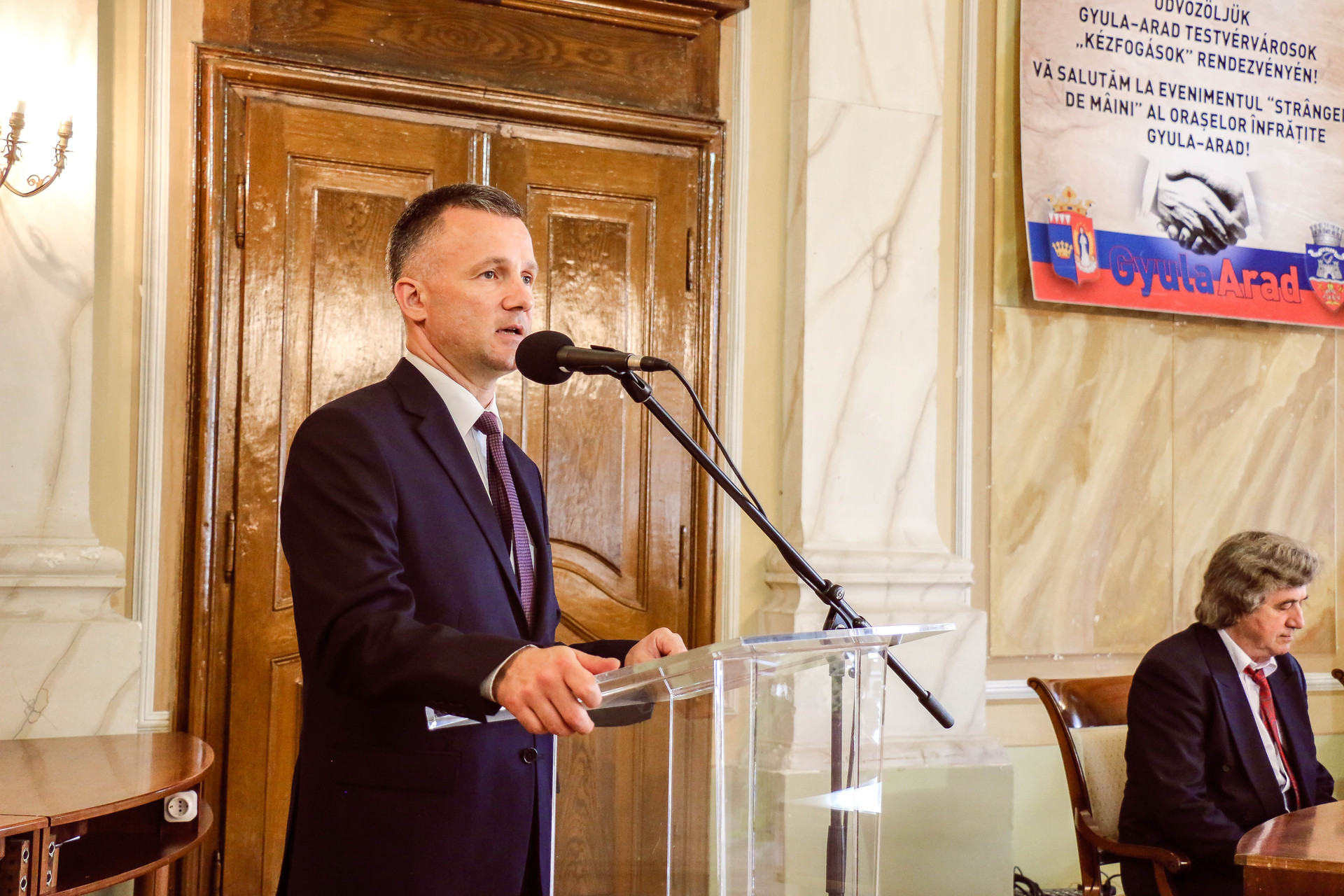A polgármester kiemelte, hogy létrejött az Arad–Gyula Kapcsolataiért Egyesület, a különböző szervezetek rendszeresen részt vesznek a települések rendezvényein. Kiemelte, hogy a gyulai születésű, egykori aradi polgármester Salacz Gyula monográfiáját két nyelven adta ki az aradi önkormányzat, a fürdővárosban pedig emléktáblát állítottak a politikusnak.