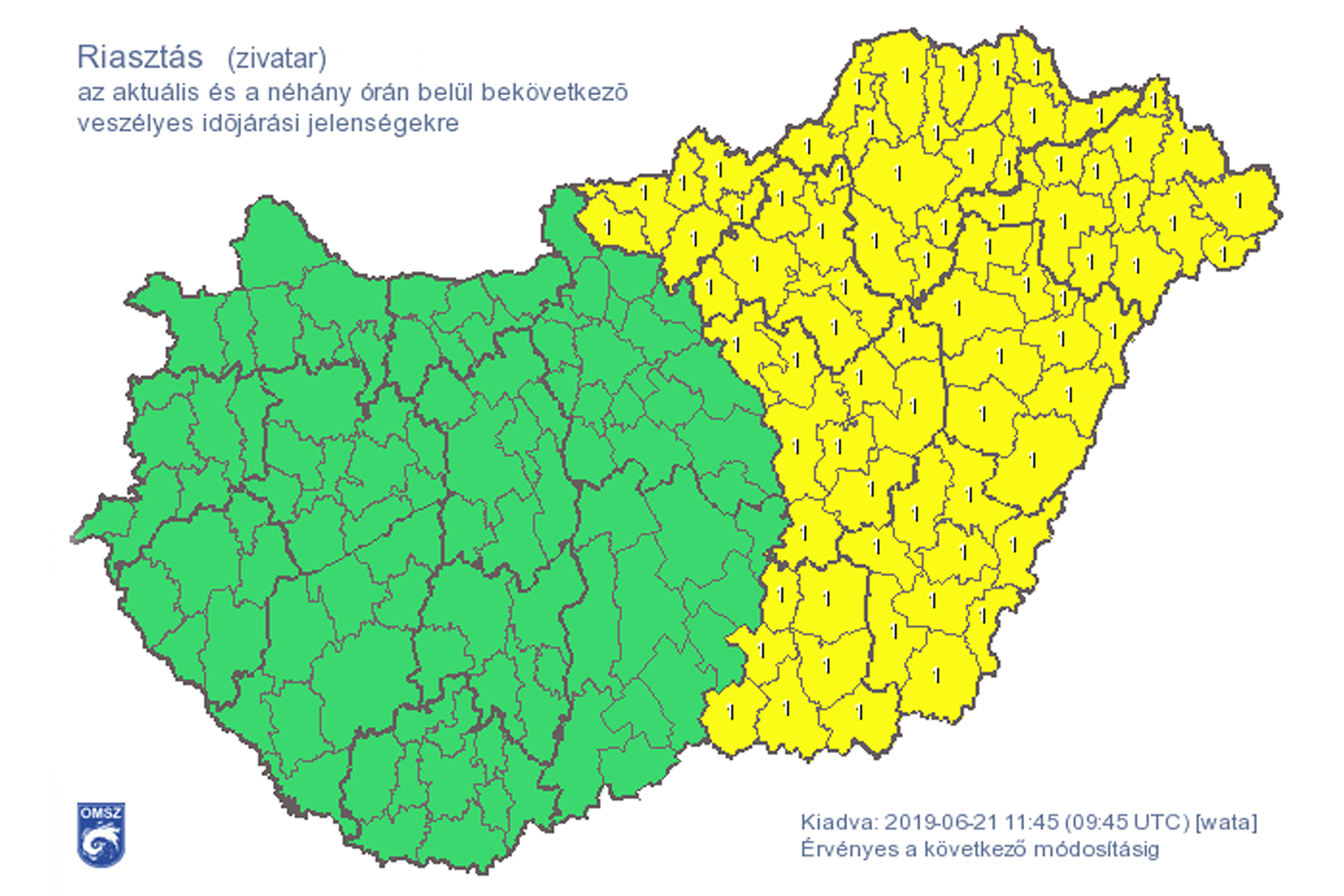 Szombaton a nap első felében jobb eséllyel az ország északkeleti harmadán (Észak-Magyarország, Észak-Alföld) várható több helyen zivatar a péntekihez hasonló kísérőjelenségekkel. Késő délutántól, estétől azonban nyugat, délnyugat felől intenzív zivatarrendszer is kialakulhat. A zivatarok nyomában felhőszakadás (20–50 milliméter csapadék), 60–80 kilométer/órás szél valószínű, de egy-egy helyen 80–100 kilométer/órás szélroham, illetve nagy méretű (2-3 centiméternél nagyobb átmérőjű) jég is előfordulhat. Utóbbira kiemelten a Dunántúl déli felén van jobb esély.