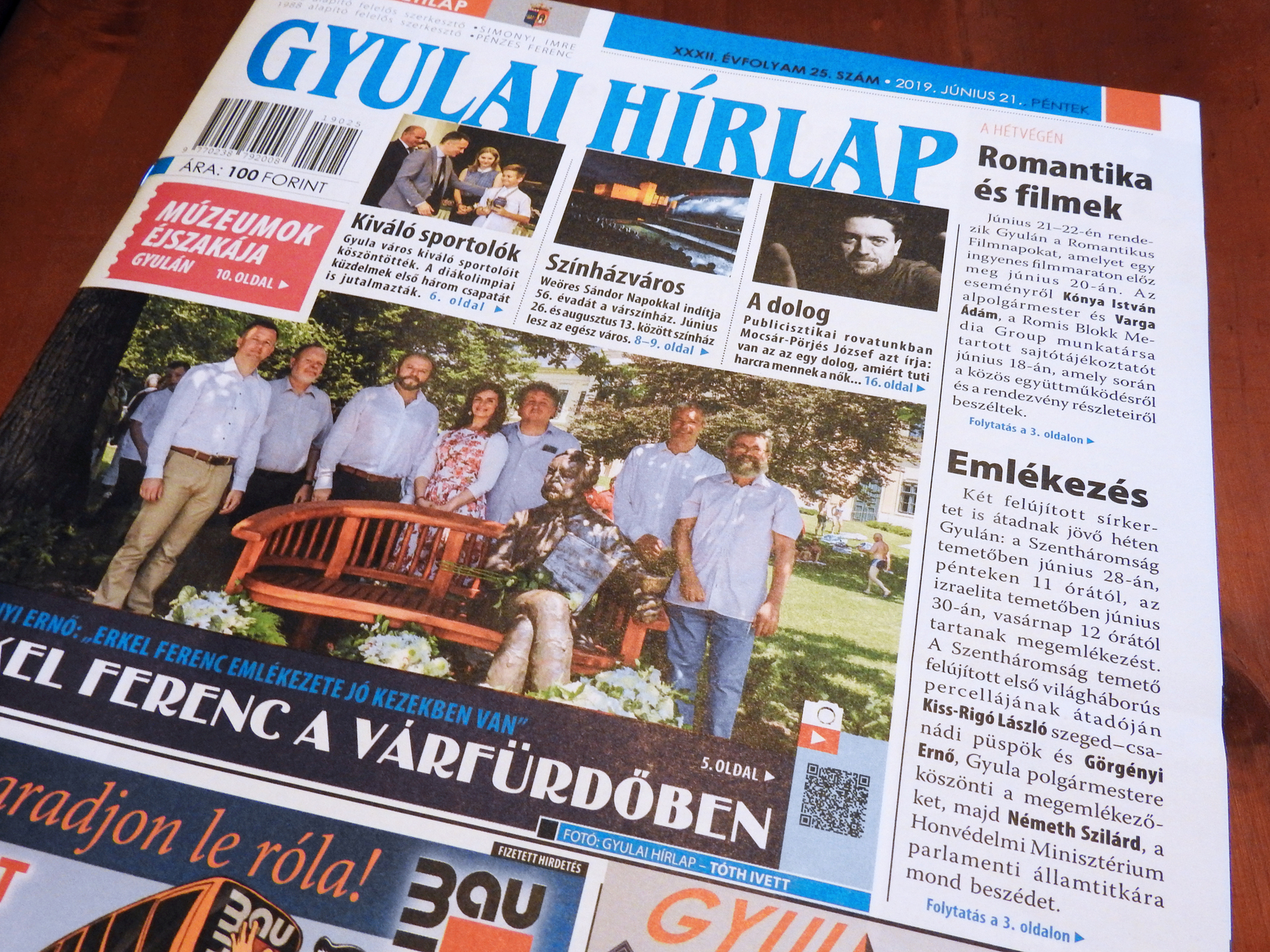 A friss Gyulai Hírlapban többek között arról írunk, hogy a Weöres Sándor Napokkal indítja 56. évadát a Gyulai Várszínház. A teátrum összművészeti fesztiválját június 26. és augusztus 13. között rendezik meg a fürdővárosban. Címlapfotónk Erkel Ferenc egész alakos szobrának az átadóján készült. Az alkotást múlt hétvégén leplezték le a Gyulai Várfürdőben. E heti lapszámunkban arról is beszámolunk, hogy két felújított sírkertet is átadnak jövő héten Gyulán: a Szentháromság-temetőben június 28-án 11 órától, az izraelita temetőben június 30-án 12 órától tartanak megemlékezést. Az újságban emellett cikket közlünk a kiváló sportolók köszöntéséről, az ügyészség napján átadott Békés megyei elismerésekről, a hétvégi Fight Nightról, az Ünnepi Könyvhét gyulai megnyitójáról, a Múzeumok Éjszakájának programjairól és Simonfi Gábor hortobágyi karikás ostort bemutató filmjéről. Lapunkból természetesen ezúttal sem hiányozhatnak az állandó rovatok és a jegyzet.