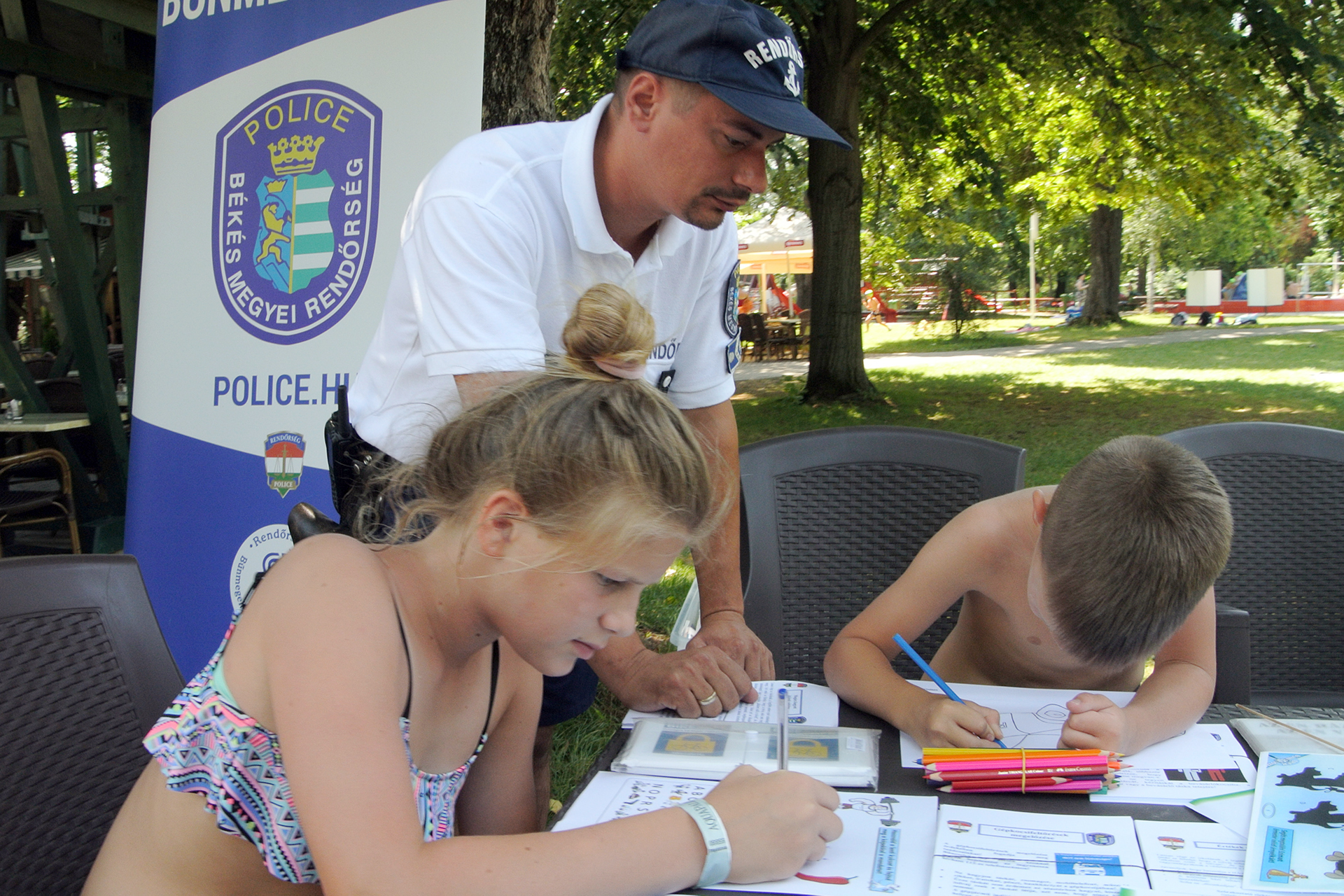 A fürdővárosi víziparadicsom bejáratánál felállított asztalnál az egyenruhások a gyermekeket ismertették meg a nyári időszakra vonatkozó legfontosabb vagyonvédelmi szabályokat és bűnmegelőzési tanácsokkal látták el őket. A rendszeres kitelepülésen a fiatal korosztály játékos formában kap tippeket nyári veszélyek kivédésére.