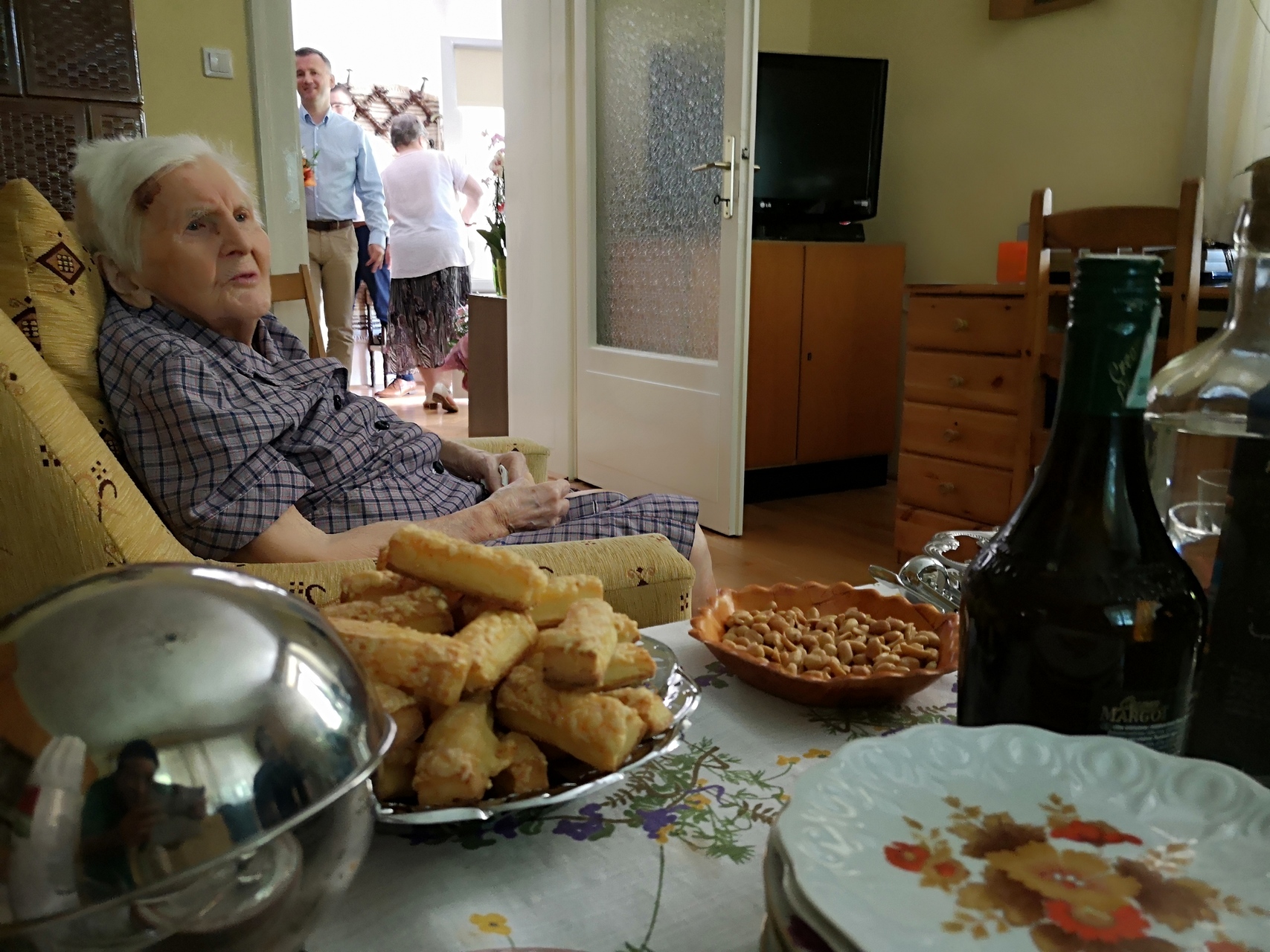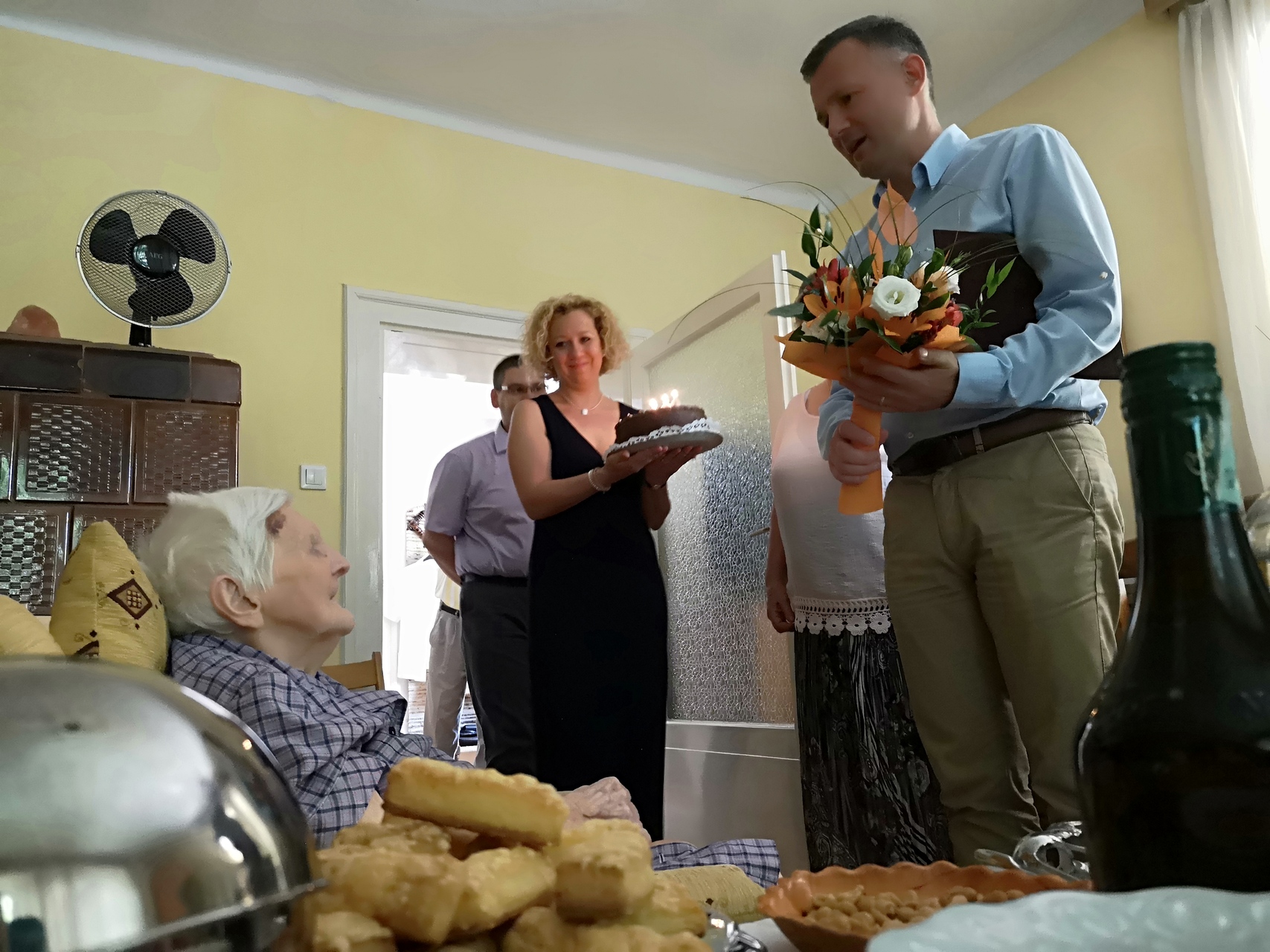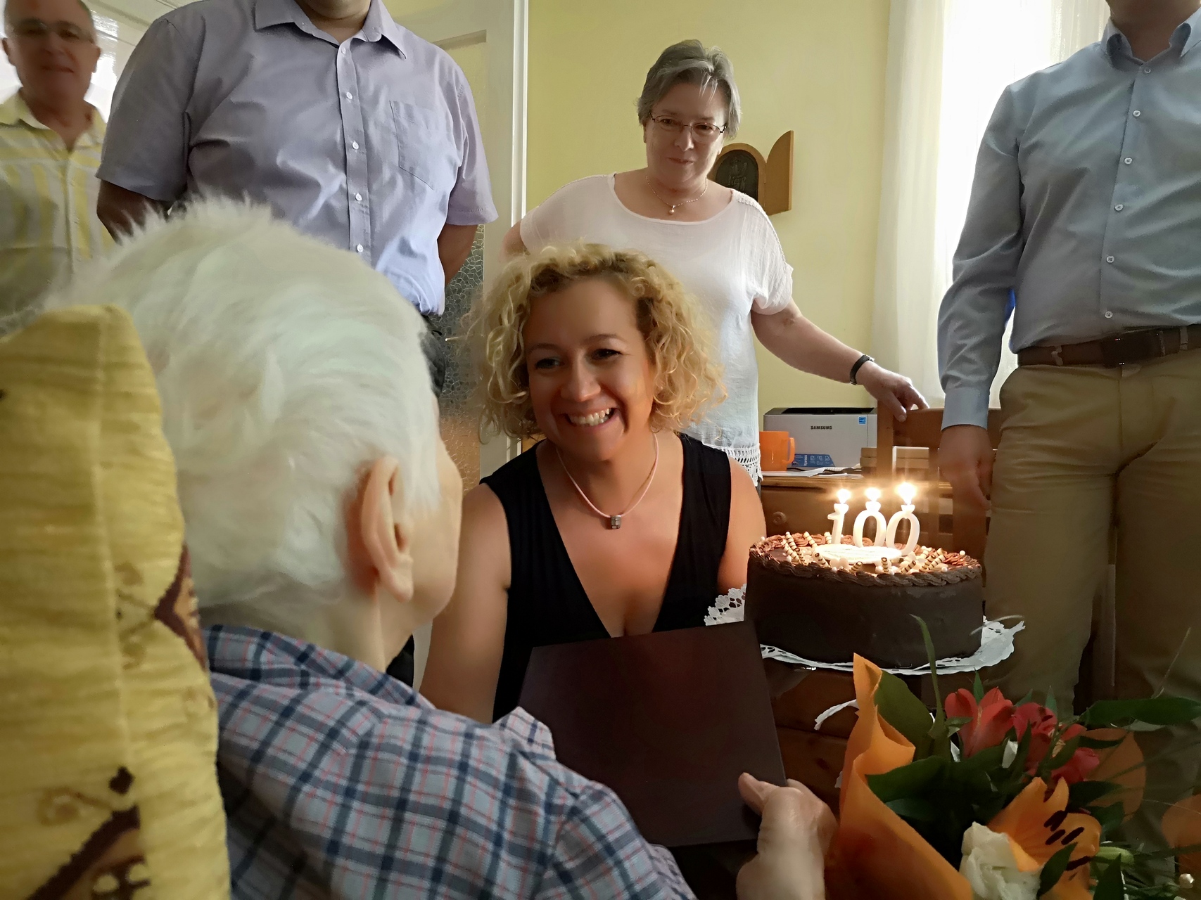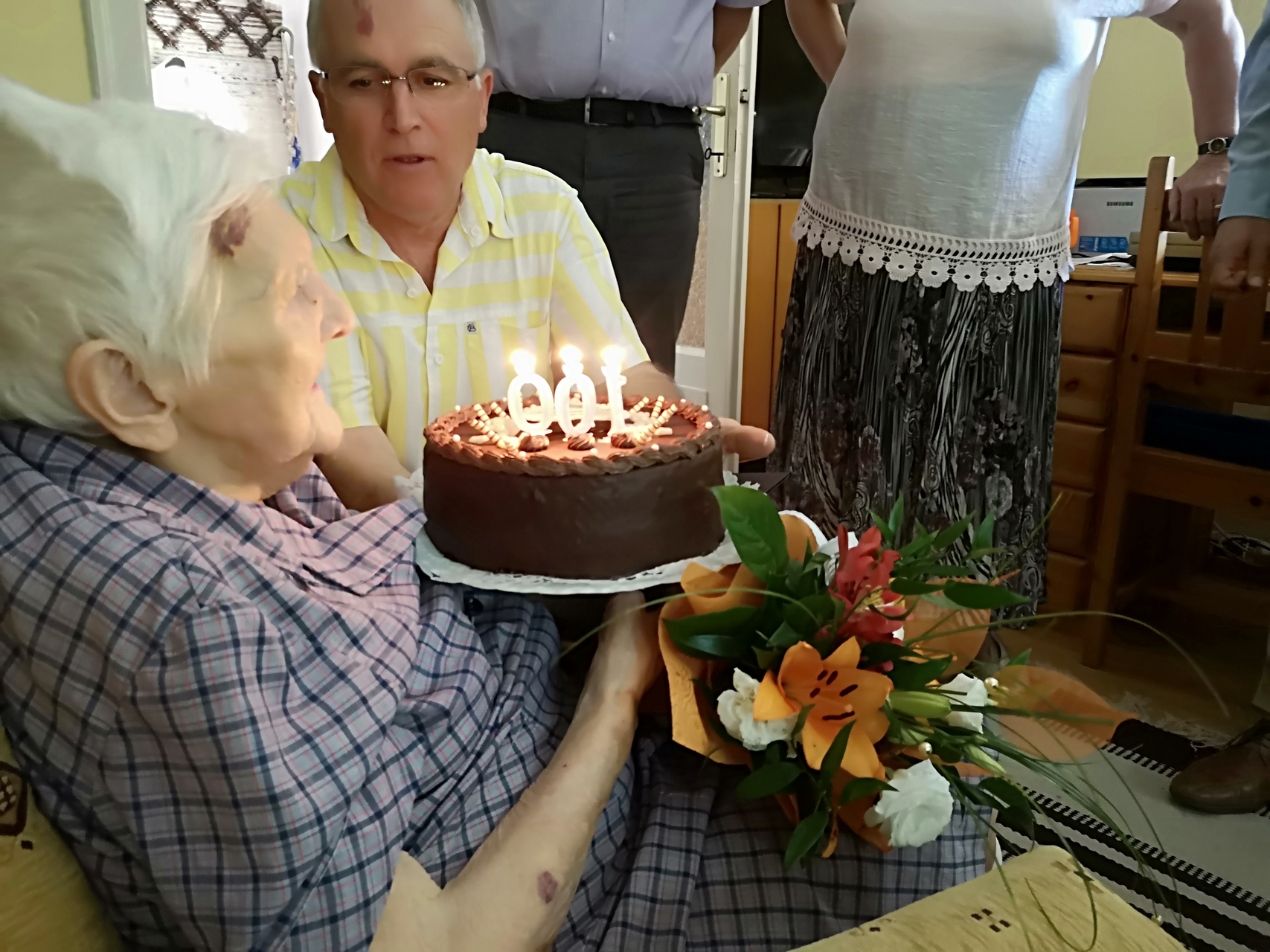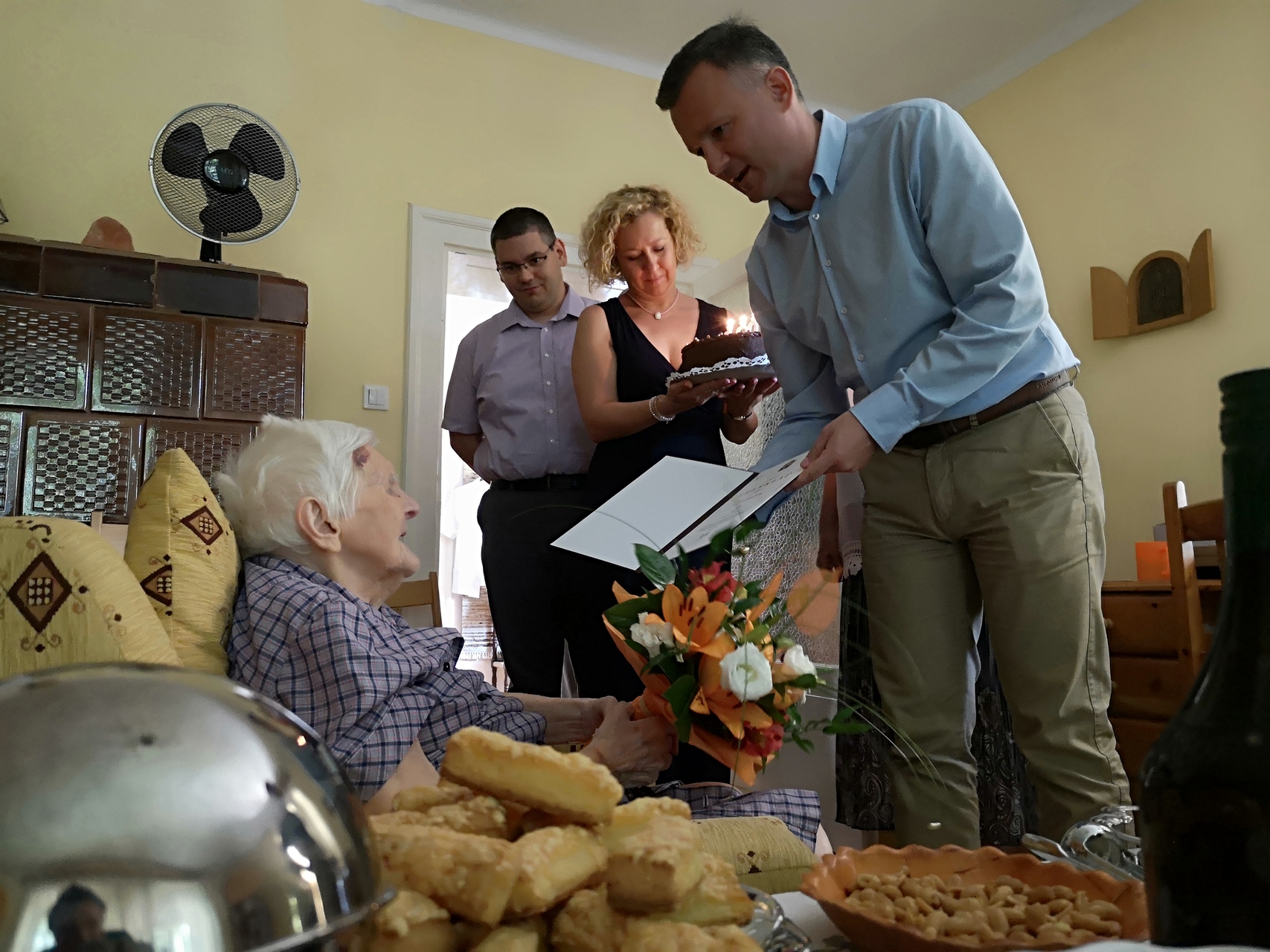 Századik születésnapját ünnepelte Gyulán Ötvös Sándorné, a város egyik legidősebb polgárát Mittag Mónika képviselő, Görgényi Ernő polgármester és Csige Gábor jegyző emléklappal, tortával és virággal köszöntötte fel.
