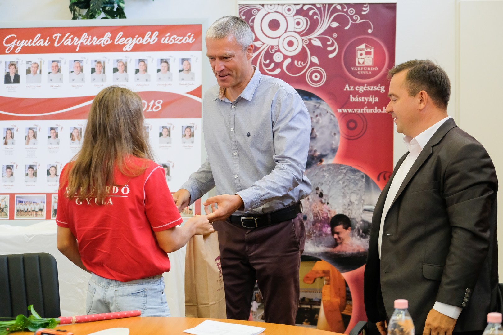 A sajtótájékoztató zárásaként Kun Miklós és Tóth András a fiatal versenyzőnek egy ajándékcsomagot adott át, amely a sikeres szerepléshez szükséges úszófelszereléseket tartalmazott.