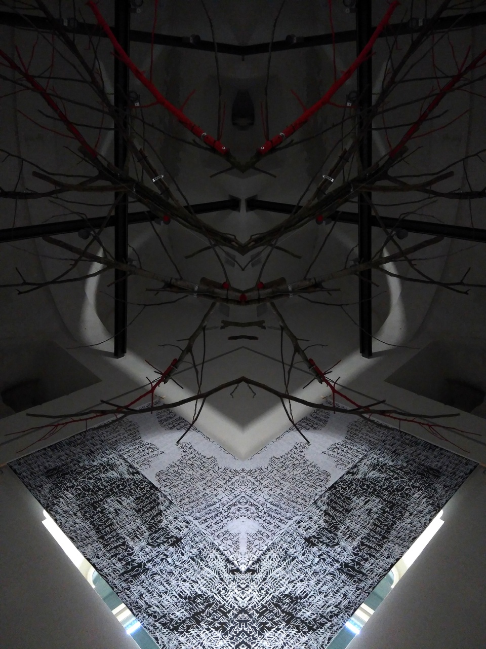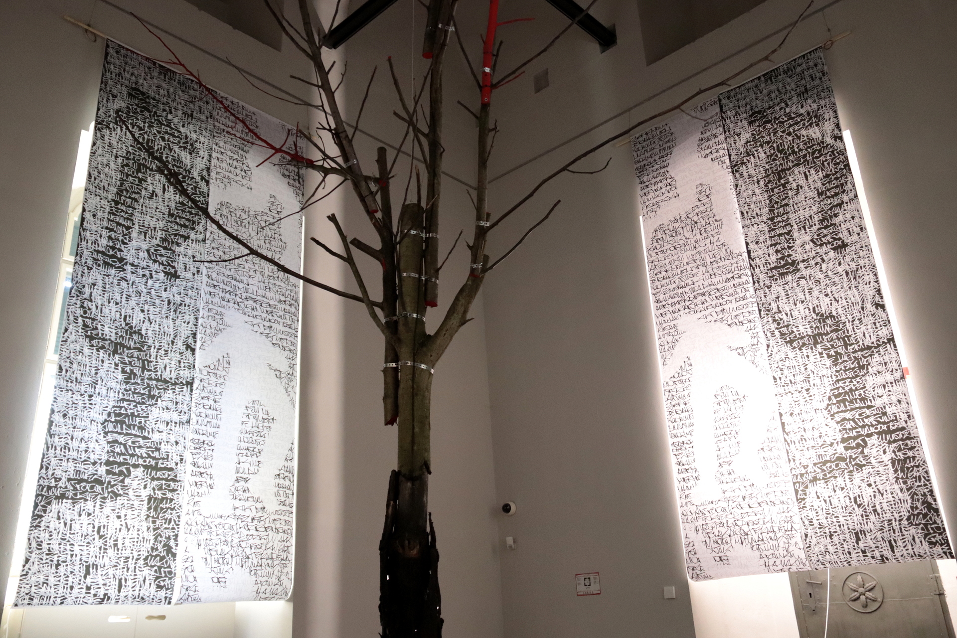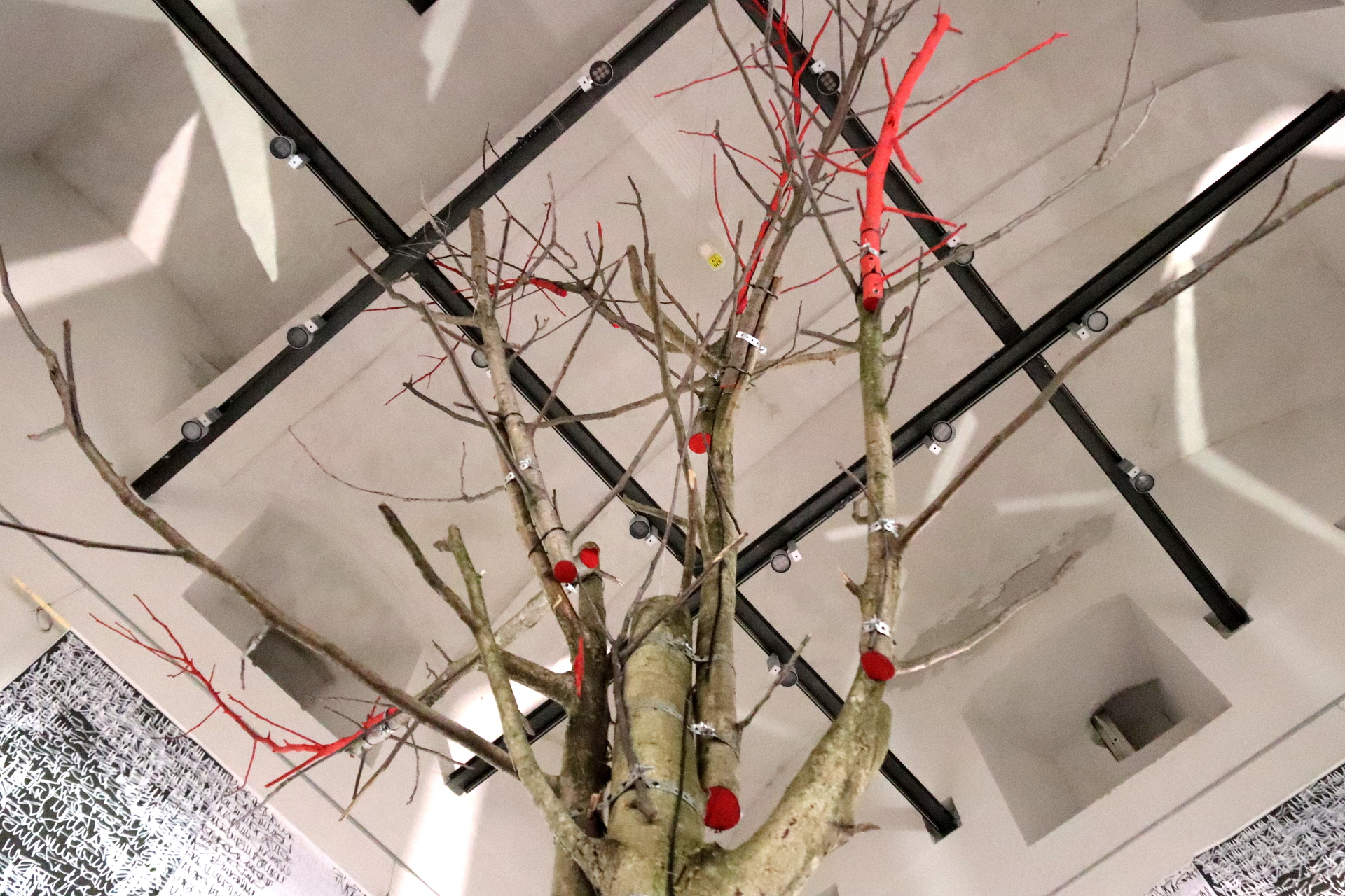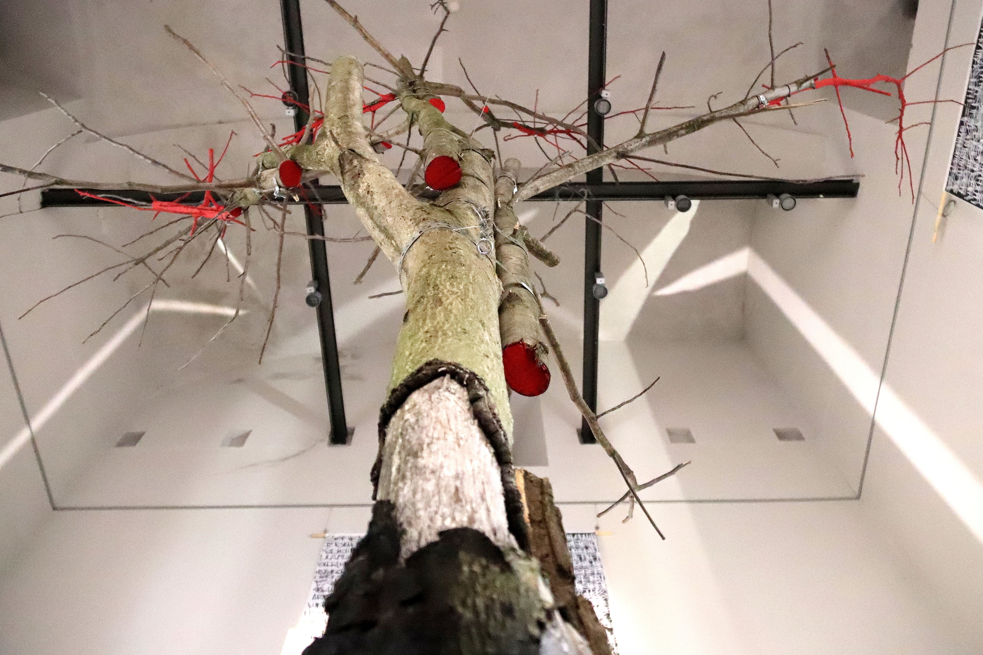 Az életfa úgy vezet fel bennünket az égbe, hogy közben törött a törzse, folytatta méltatását BMZ. Az tehát, amit a toronyban látunk, egy buherált fa. Egy halott fából előteremtett új világ, új dimenzió. Ha belenézünk a repedésébe, azt tapasztaljuk, hogy nem is áll ez a fa, hisz fény jön át rajta. Mégis van benne egy fészek, van benne biztonság. Hogy a kompozíciót miért veszik körül testkontúrok, lélektelen anyagok a végtelenített szövegekben, arra is elhangzott magyarázat: azért, mert nagyon fontos, hogy az eseményhorizont végén legyen elengedés. A kiállításban ez megtörténik.