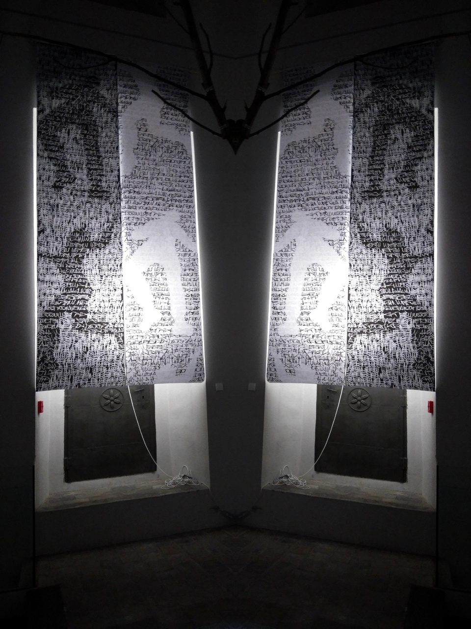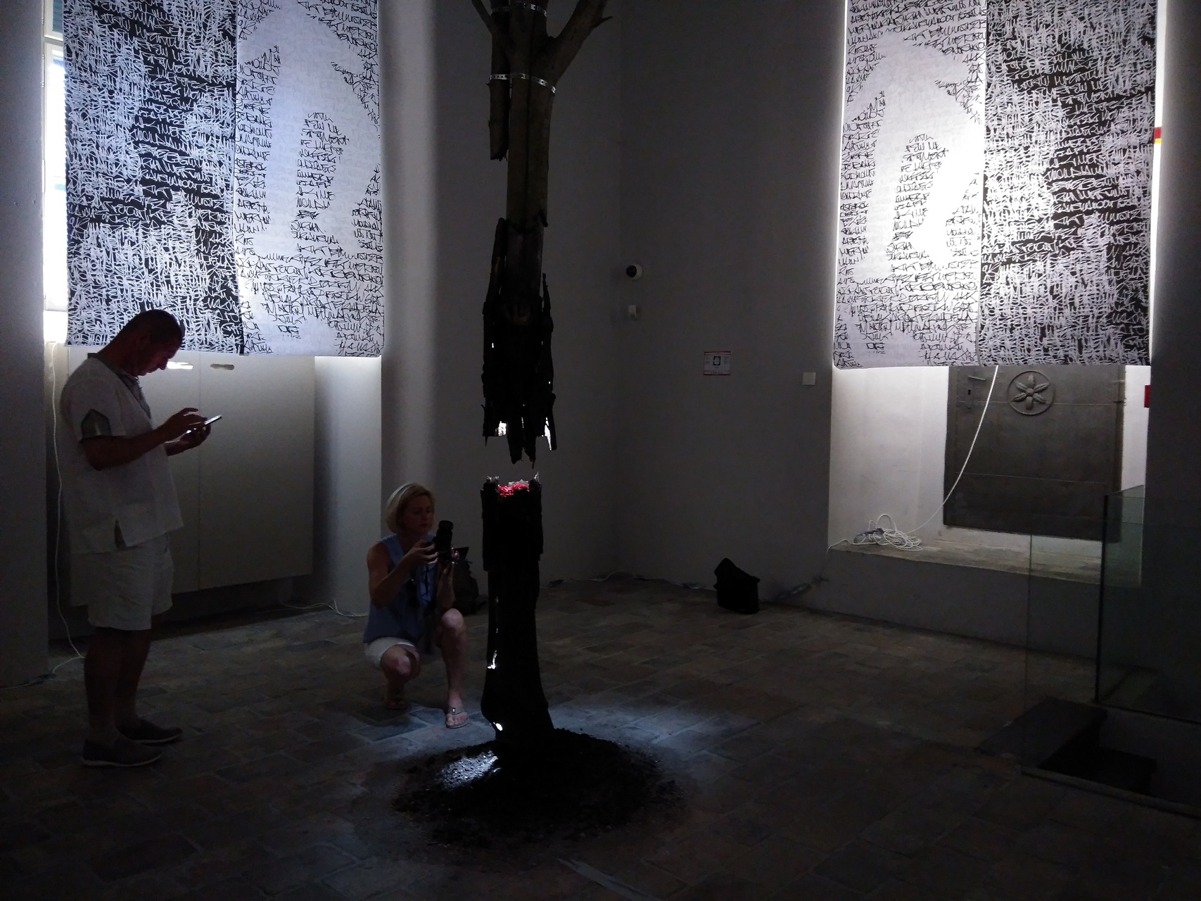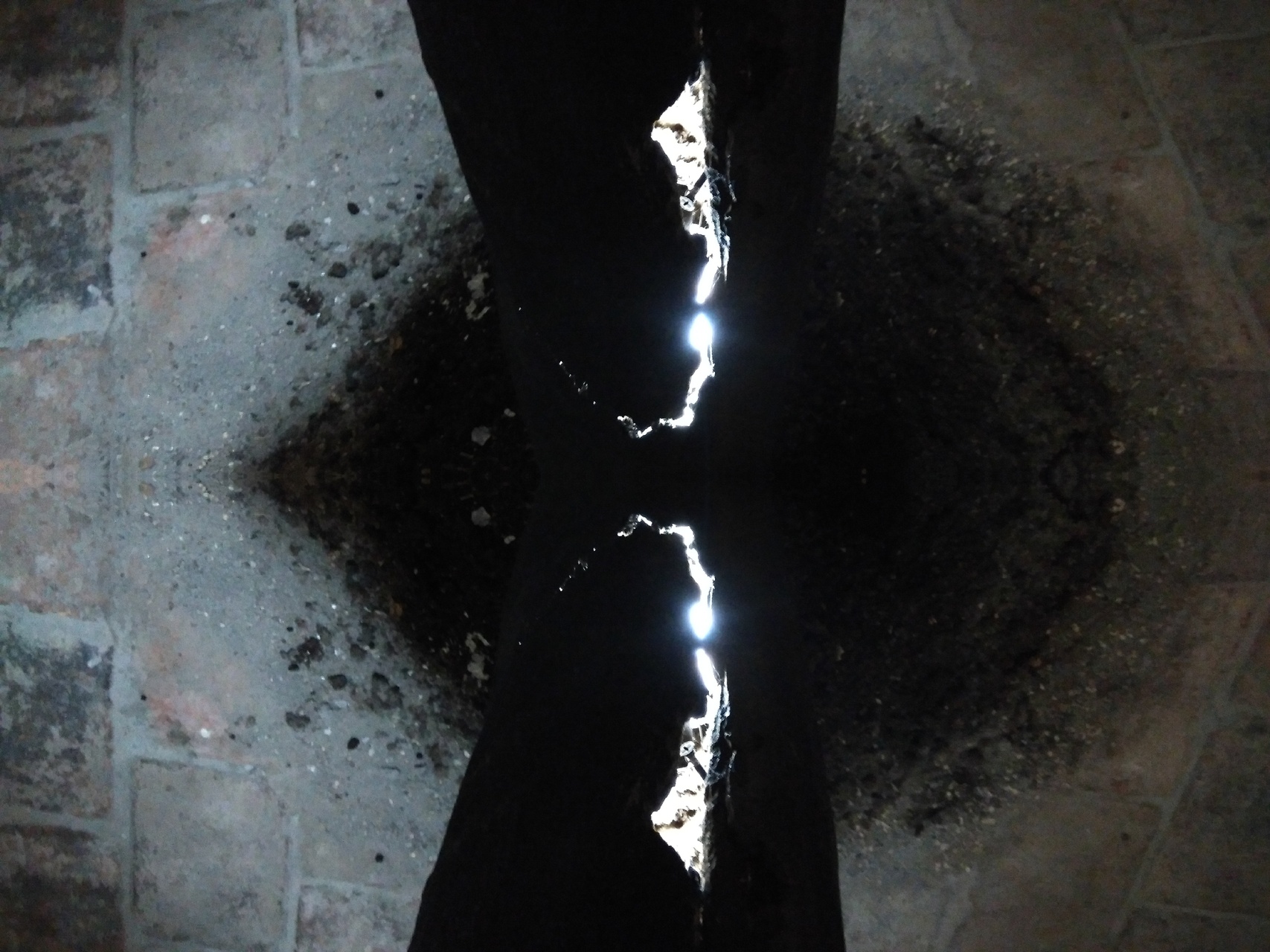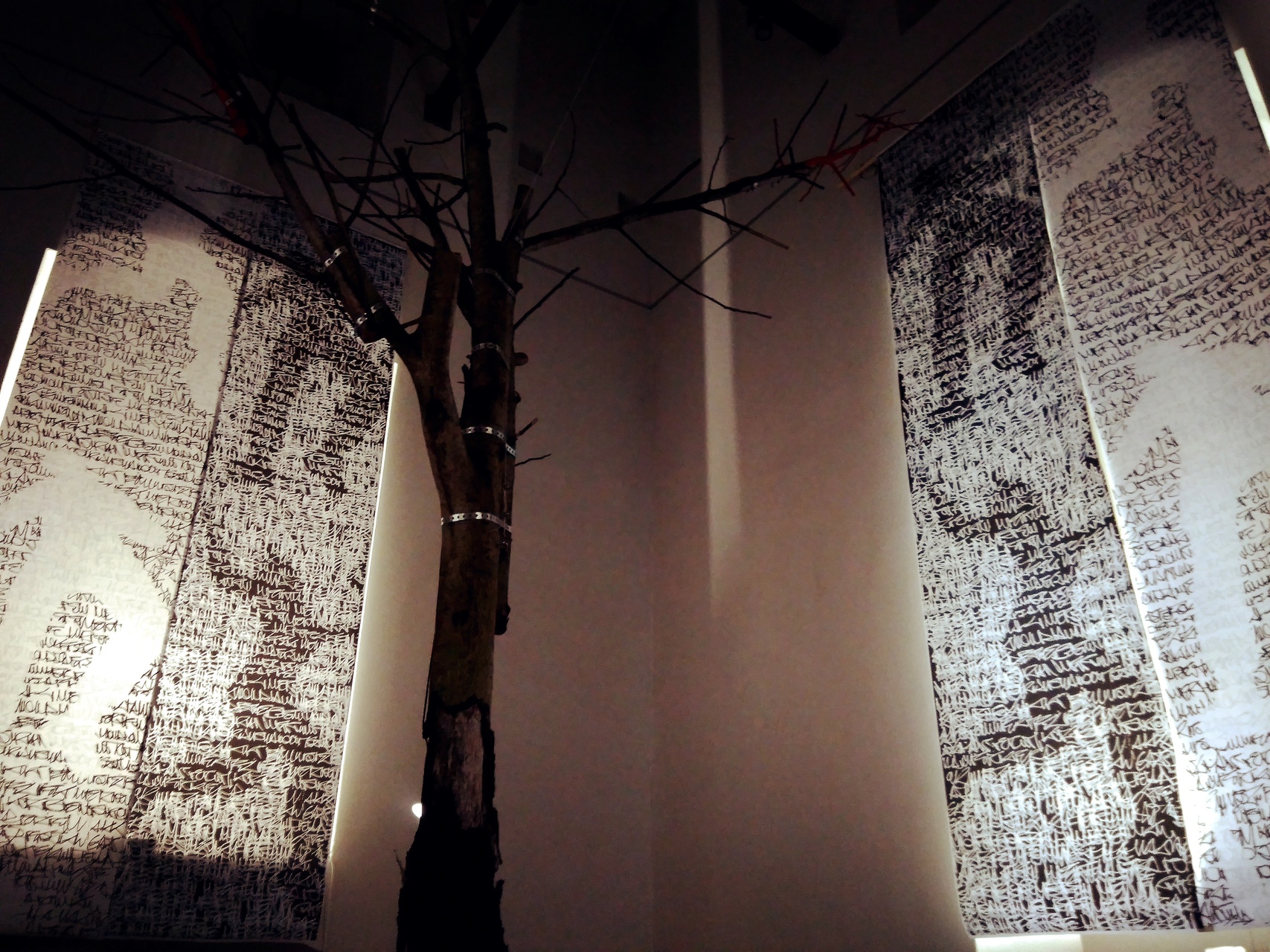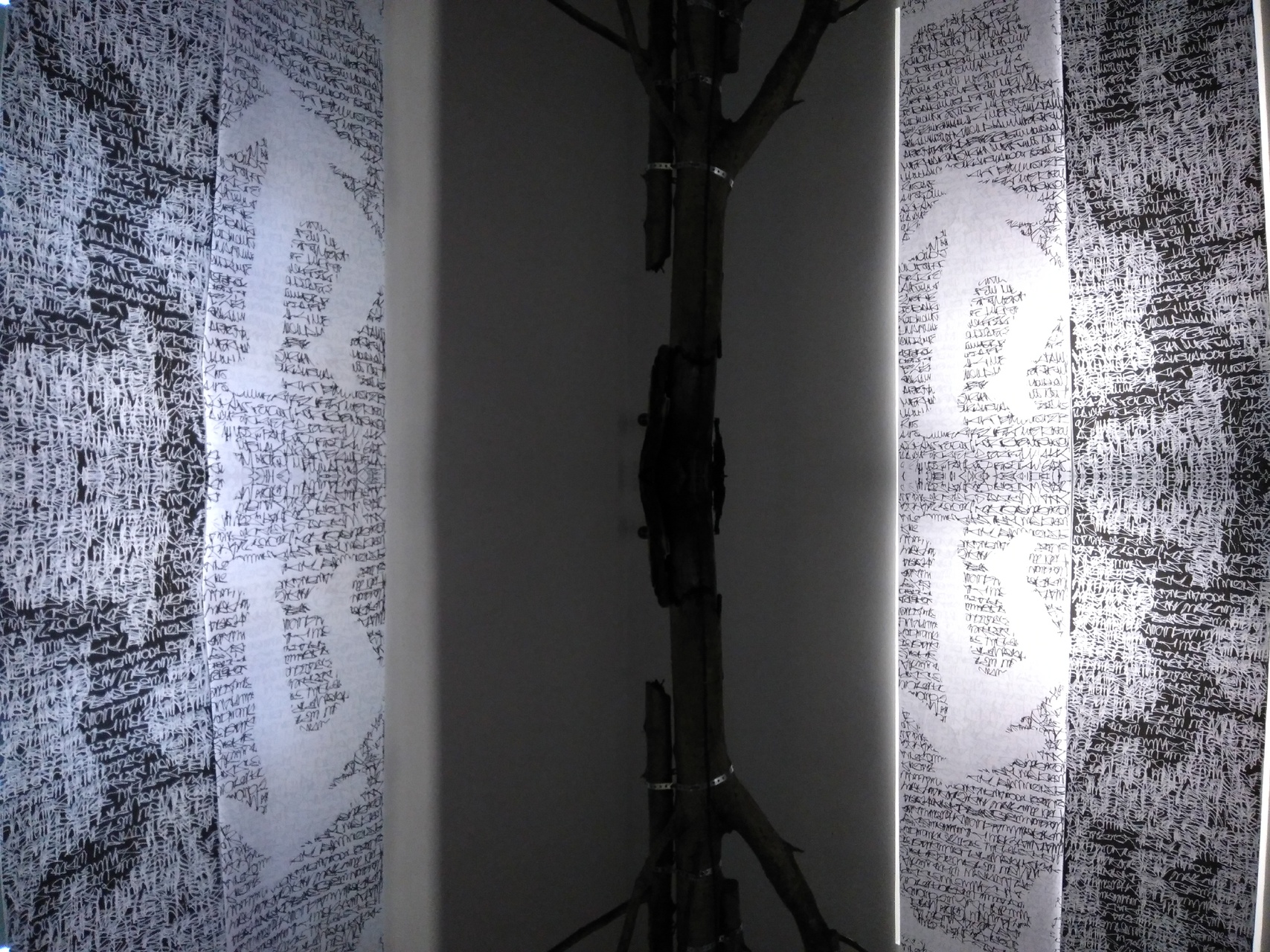 Az életfa úgy vezet fel bennünket az égbe, hogy közben törött a törzse, folytatta méltatását BMZ. Az tehát, amit a toronyban látunk, egy buherált fa. Egy halott fából előteremtett új világ, új dimenzió. Ha belenézünk a repedésébe, azt tapasztaljuk, hogy nem is áll ez a fa, hisz fény jön át rajta. Mégis van benne egy fészek, van benne biztonság. Hogy a kompozíciót miért veszik körül testkontúrok, lélektelen anyagok a végtelenített szövegekben, arra is elhangzott magyarázat: azért, mert nagyon fontos, hogy az eseményhorizont végén legyen elengedés. A kiállításban ez megtörténik.